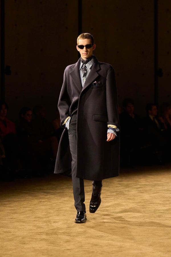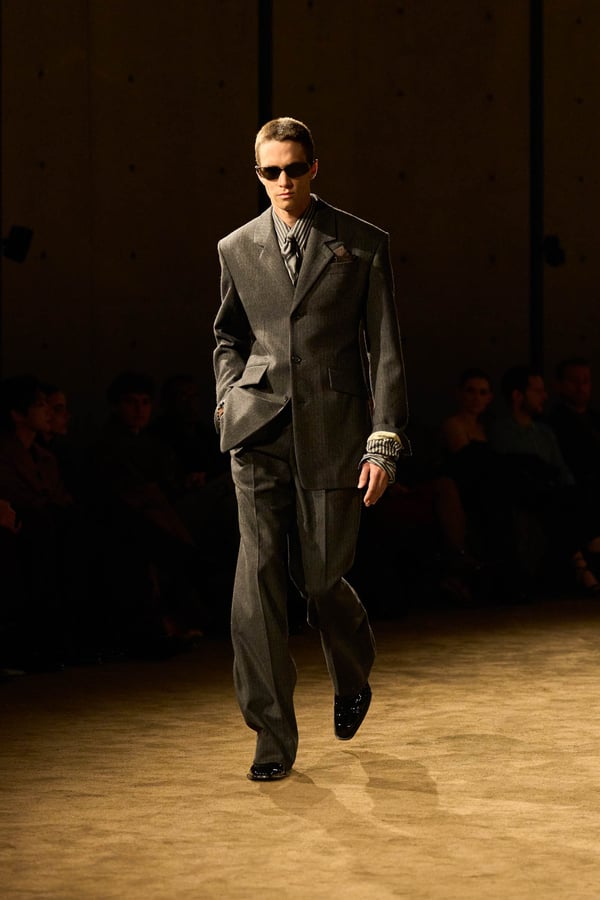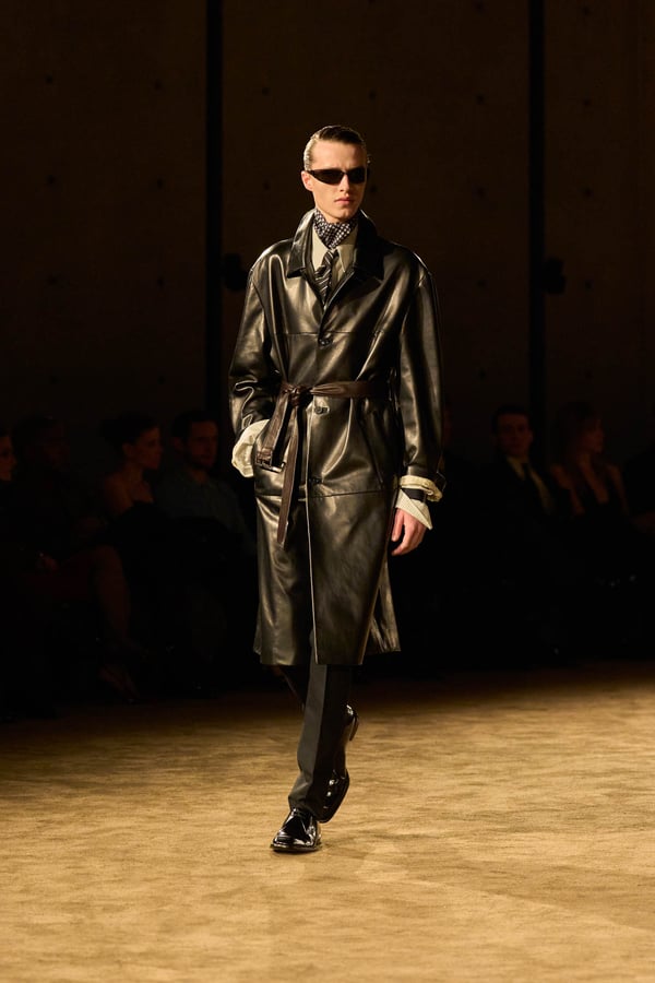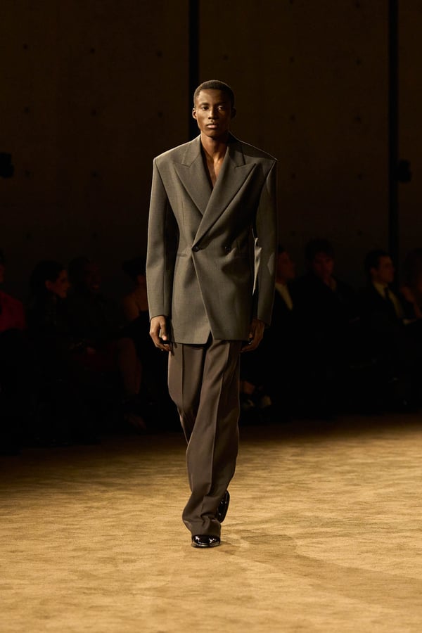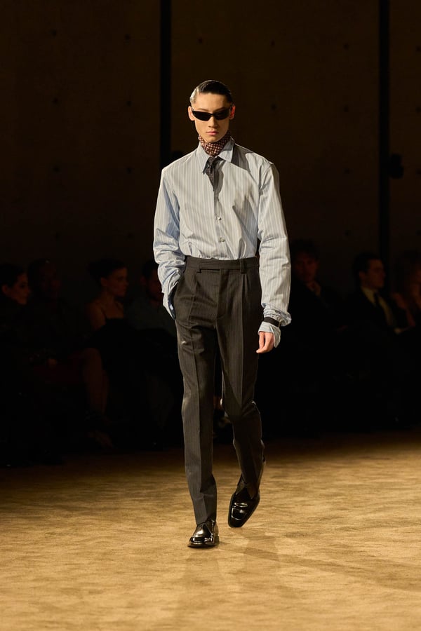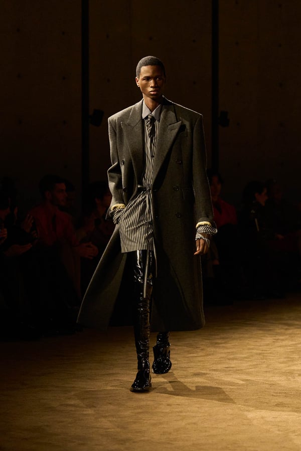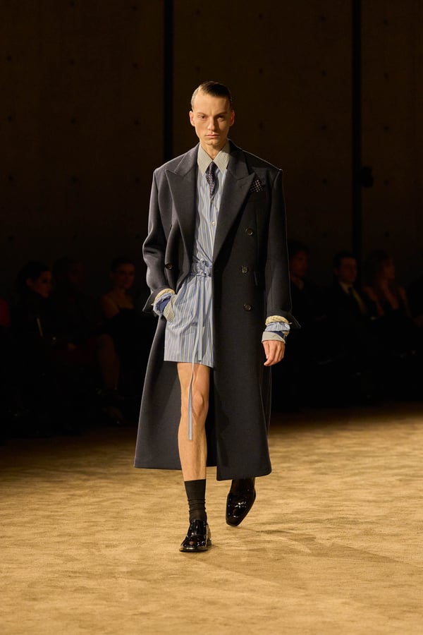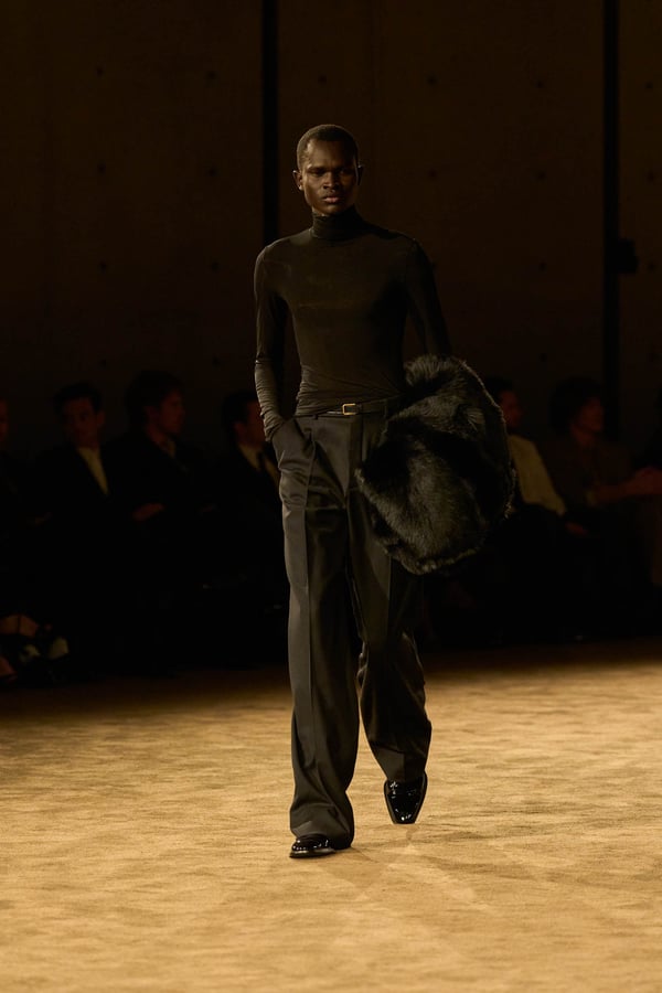 コレクションの出発点となったのは、ジェイムズ・ボールドウィンの小説「ジョヴァンニの部屋」。アンソニーは恋人の部屋を早朝に出るシーンの心理的抑揚に惹かれ、”前夜の翌朝”というサンローランの古典的なモチーフを想起したという。裸から部屋着、部屋着から外着への儀式的な変容を体現する。