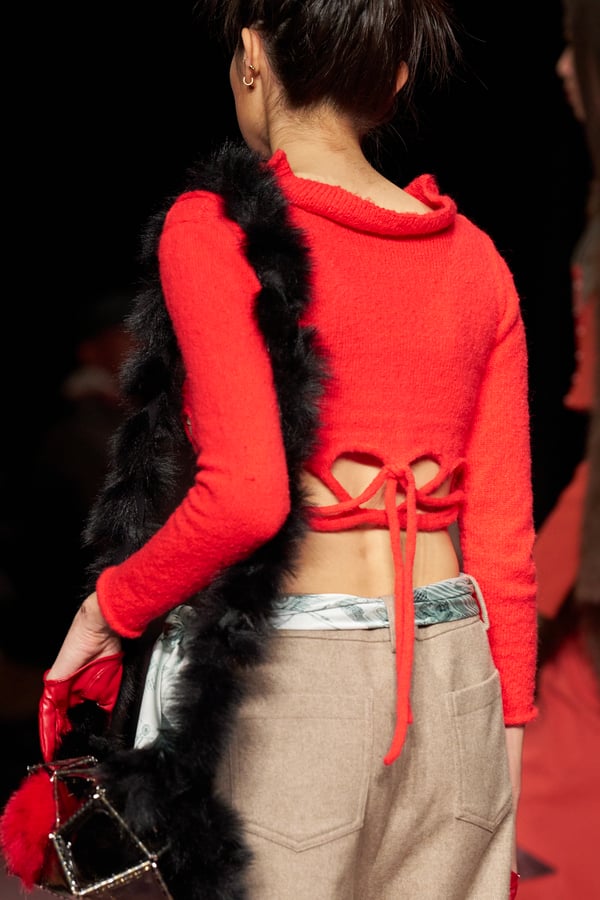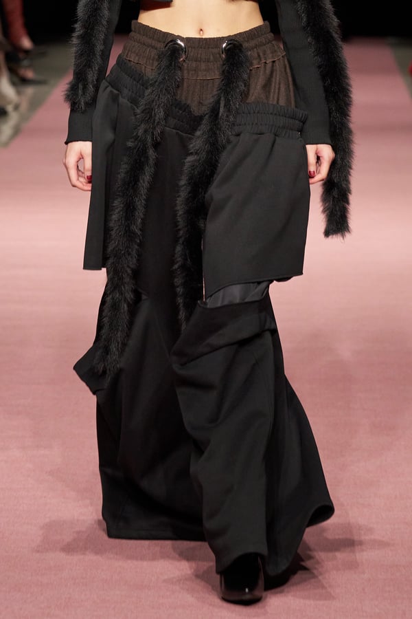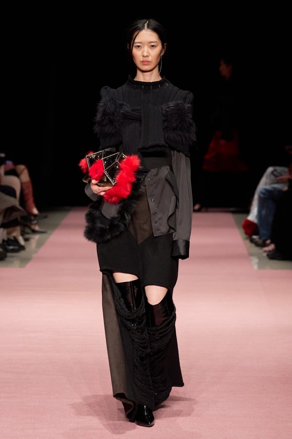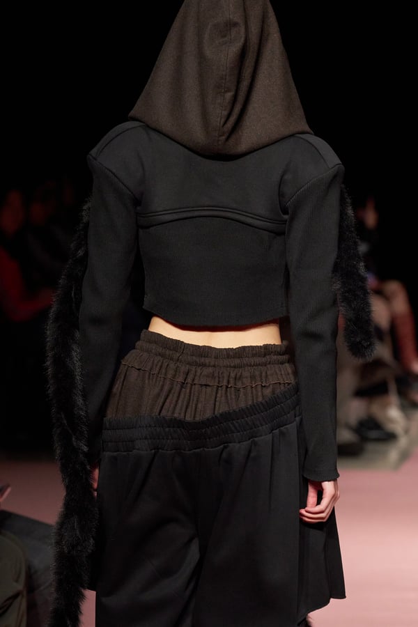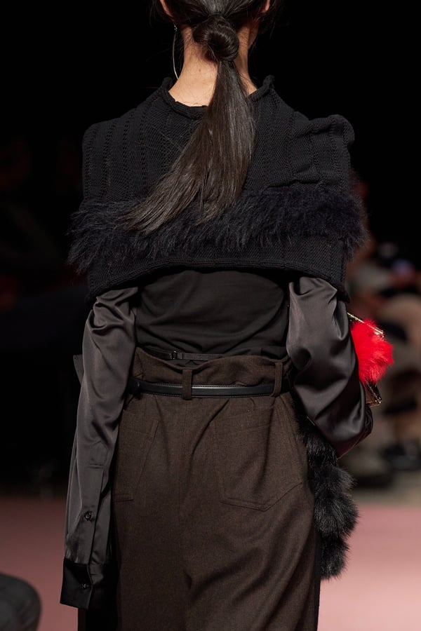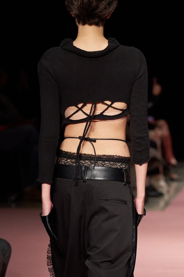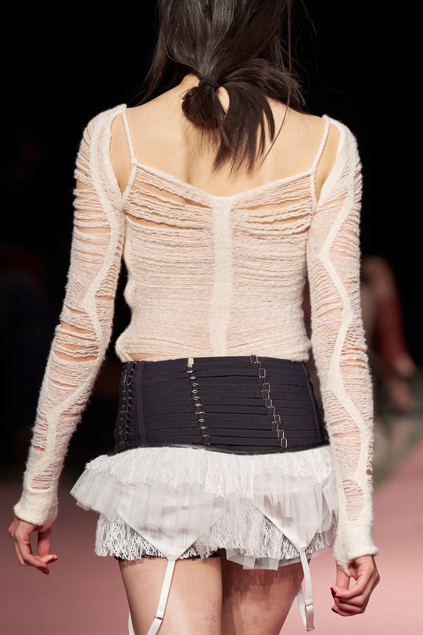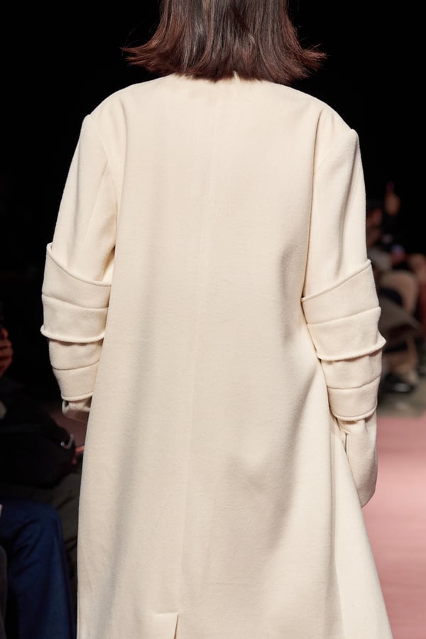 前シーズンからニットのバリエーションを増やし、ローゲージや編み込み、クラッシュ加工、ほつれなど、異なる手法のニットを組み合わせ立体感を表現。重厚なウールやタフなレザーに対し、透け感のあるチュールを組み合わせてコントラストをつけ、人が持つソフトな面とハードな面を演出した。