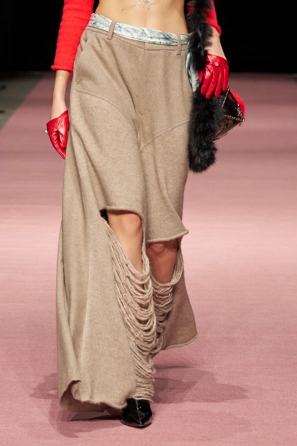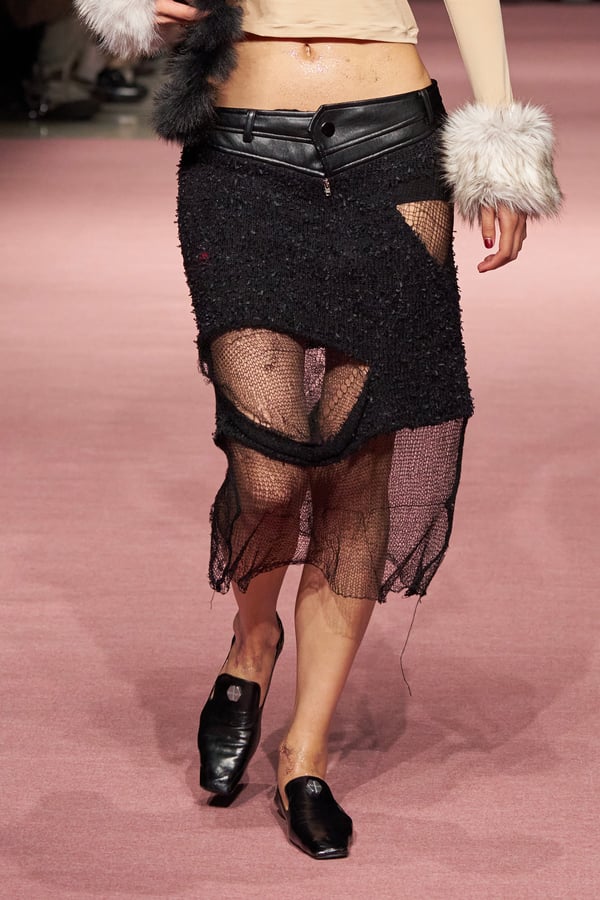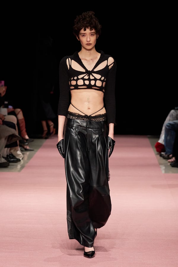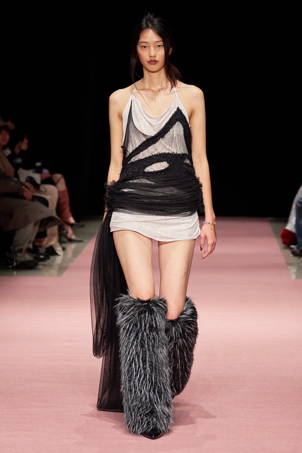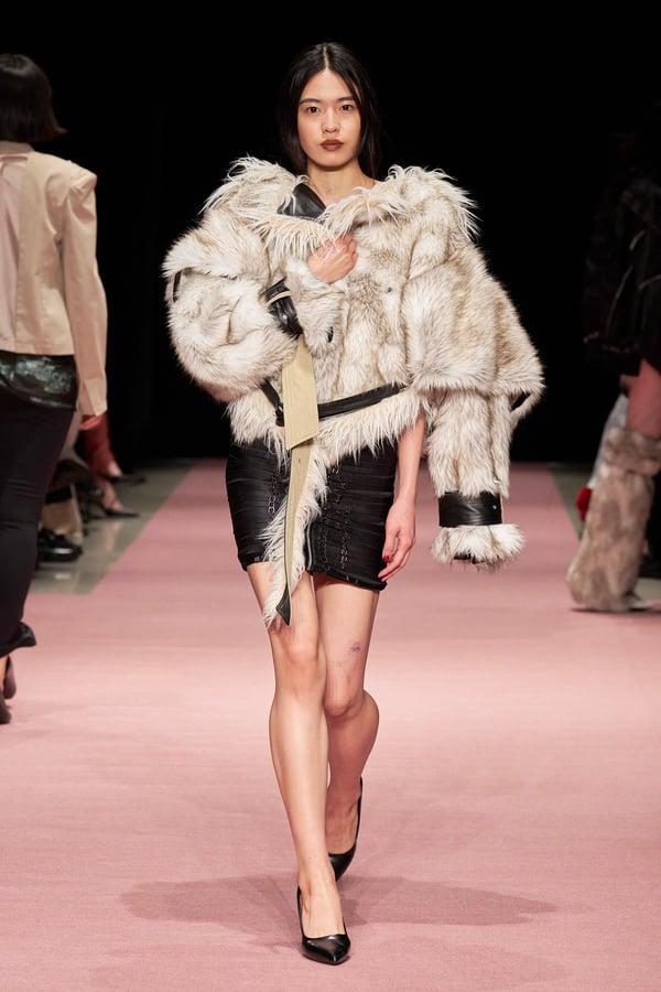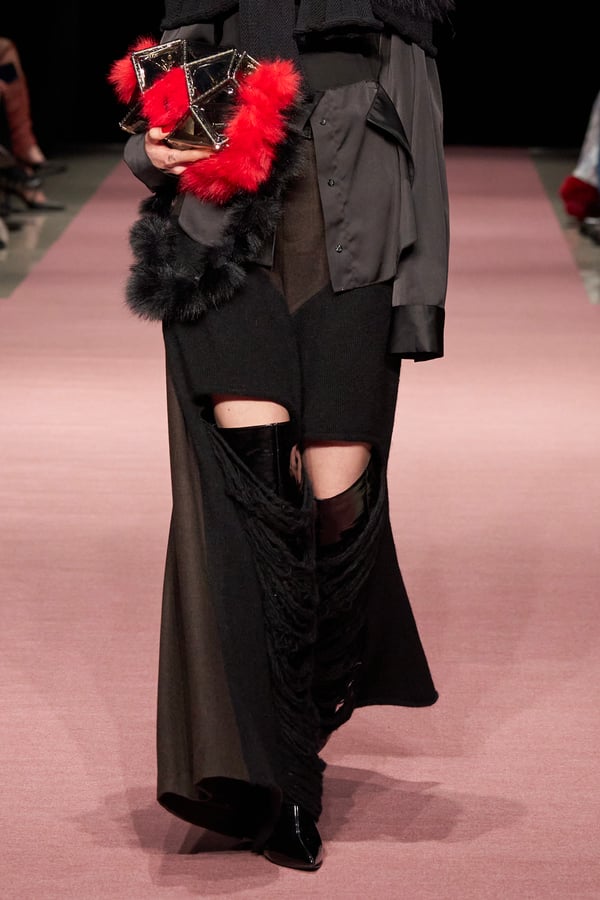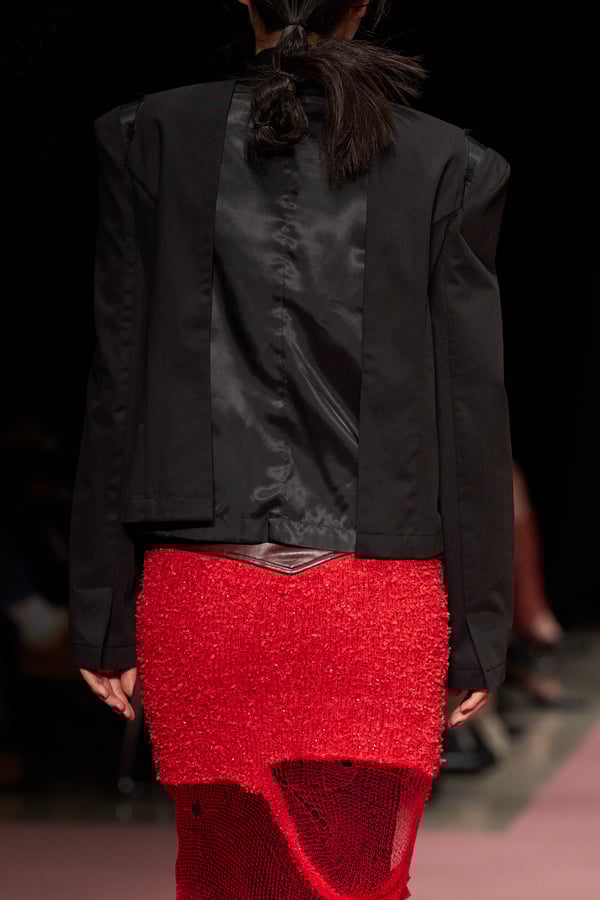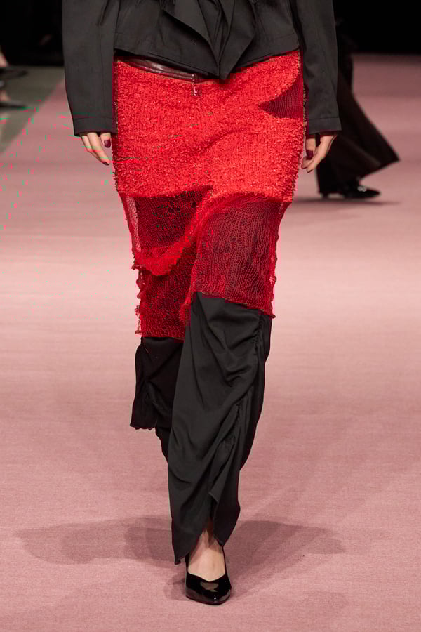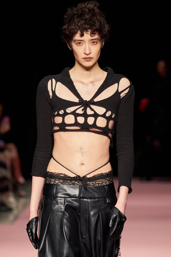 前シーズンからニットのバリエーションを増やし、ローゲージや編み込み、クラッシュ加工、ほつれなど、異なる手法のニットを組み合わせ立体感を表現。重厚なウールやタフなレザーに対し、透け感のあるチュールを組み合わせてコントラストをつけ、人が持つソフトな面とハードな面を演出した。