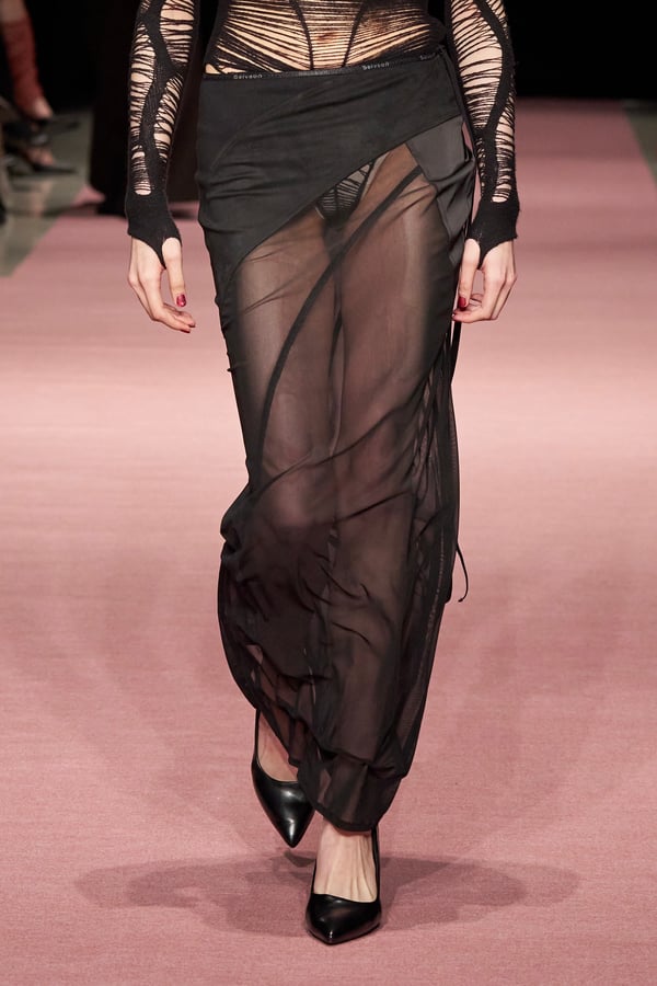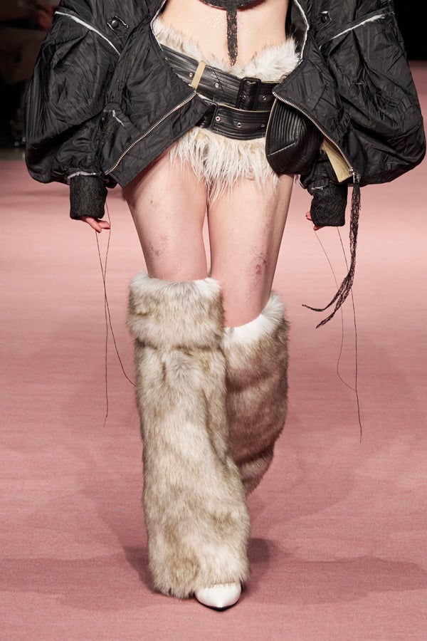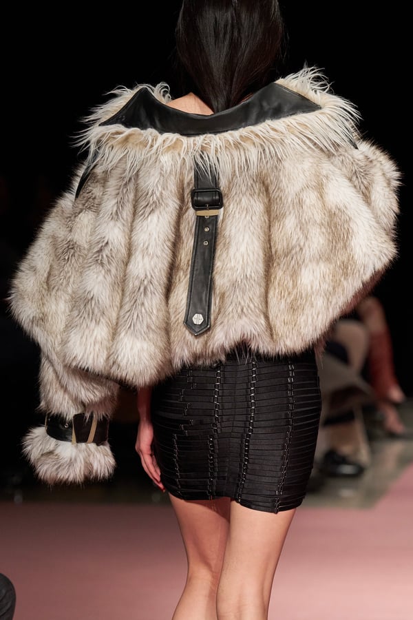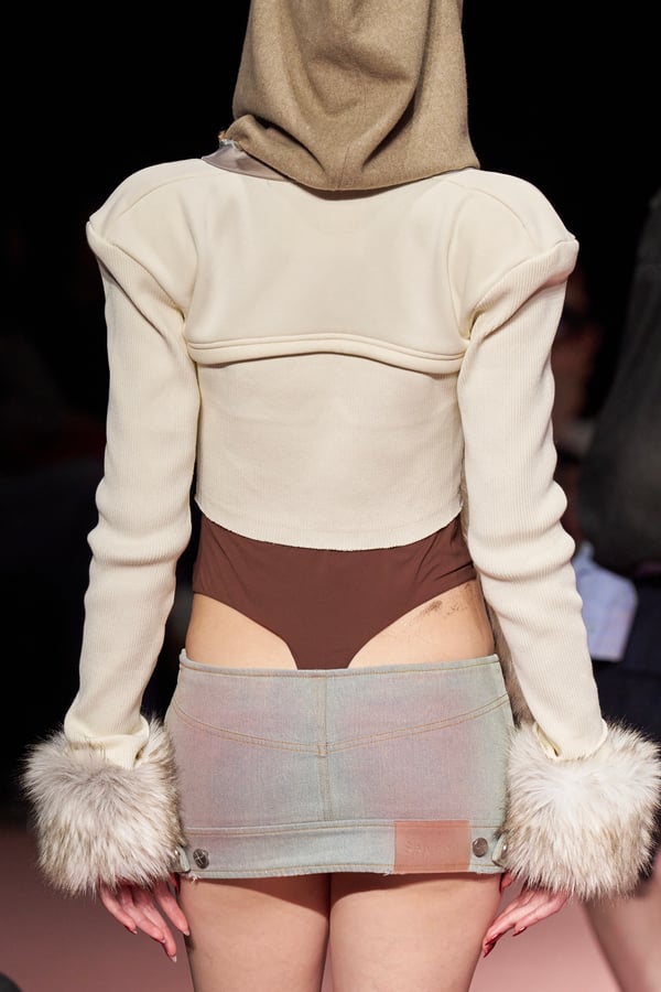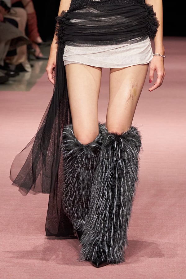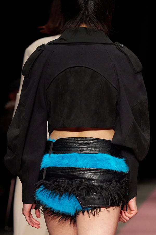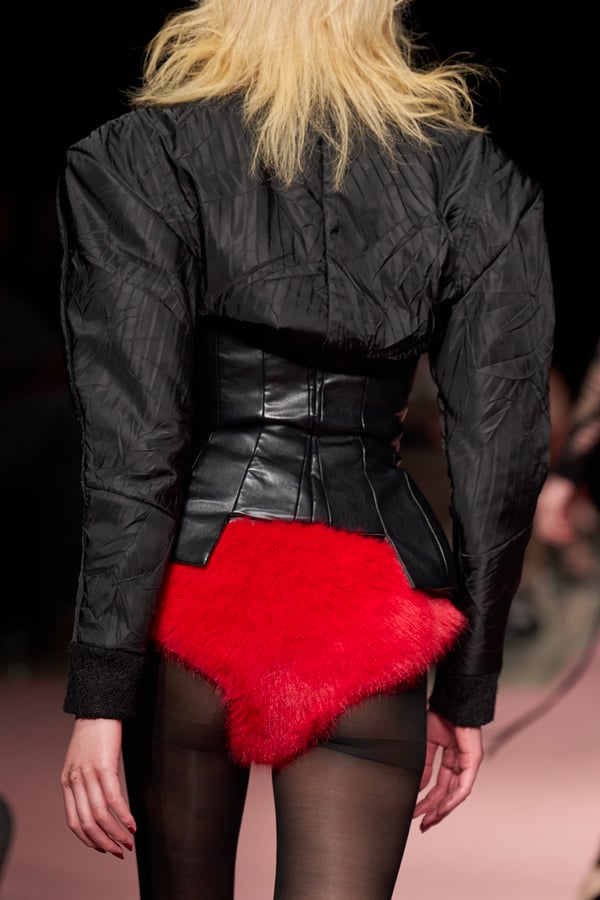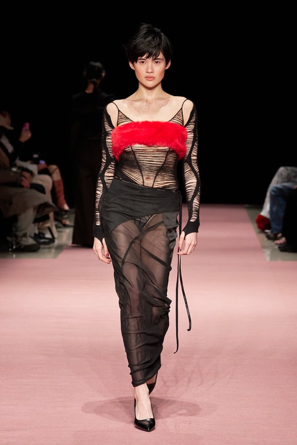 前シーズンからニットのバリエーションを増やし、ローゲージや編み込み、クラッシュ加工、ほつれなど、異なる手法のニットを組み合わせ立体感を表現。重厚なウールやタフなレザーに対し、透け感のあるチュールを組み合わせてコントラストをつけ、人が持つソフトな面とハードな面を演出した。