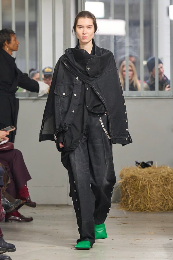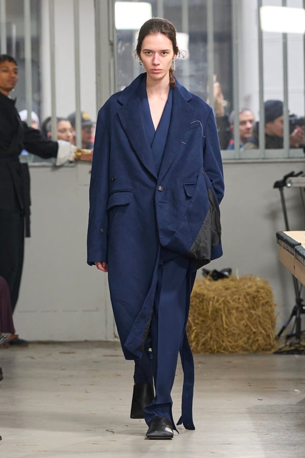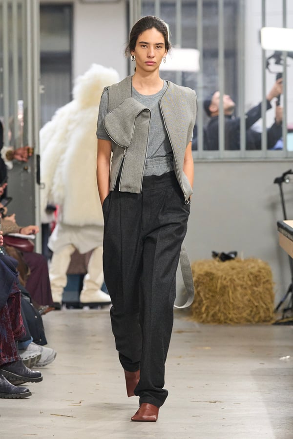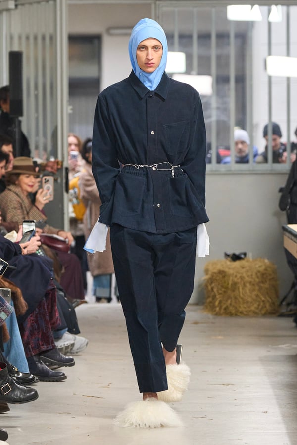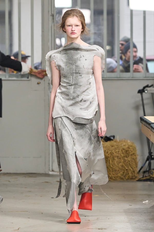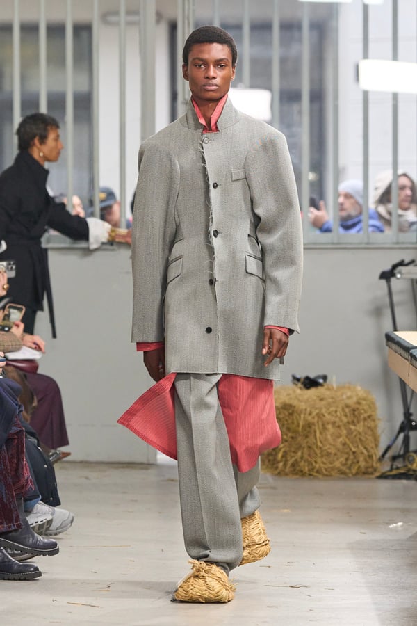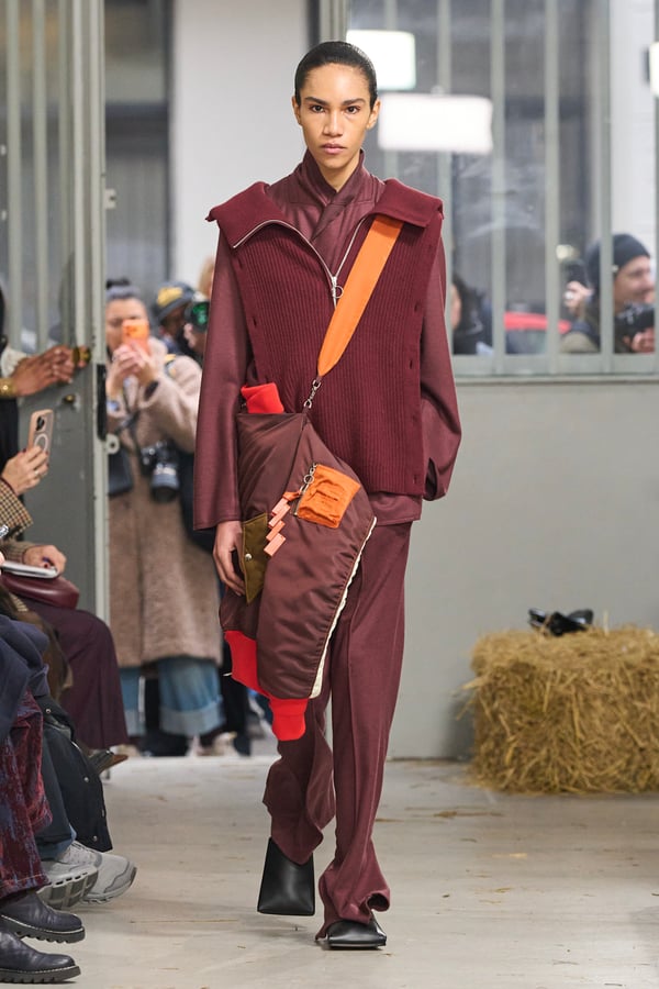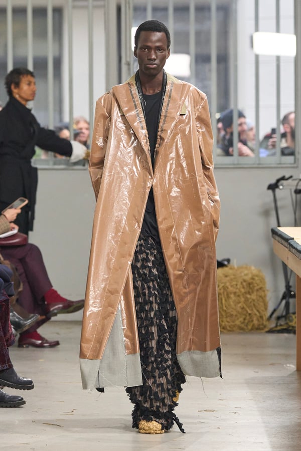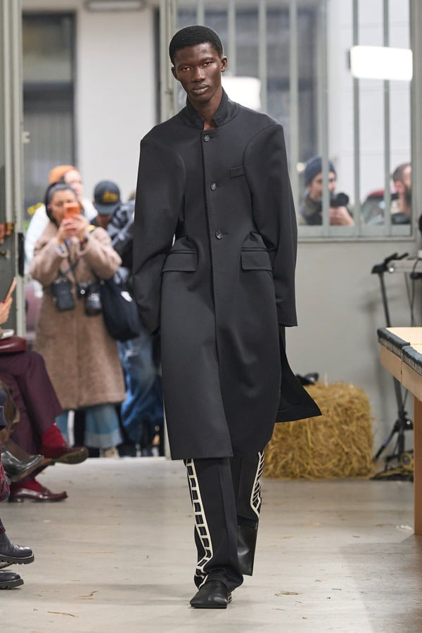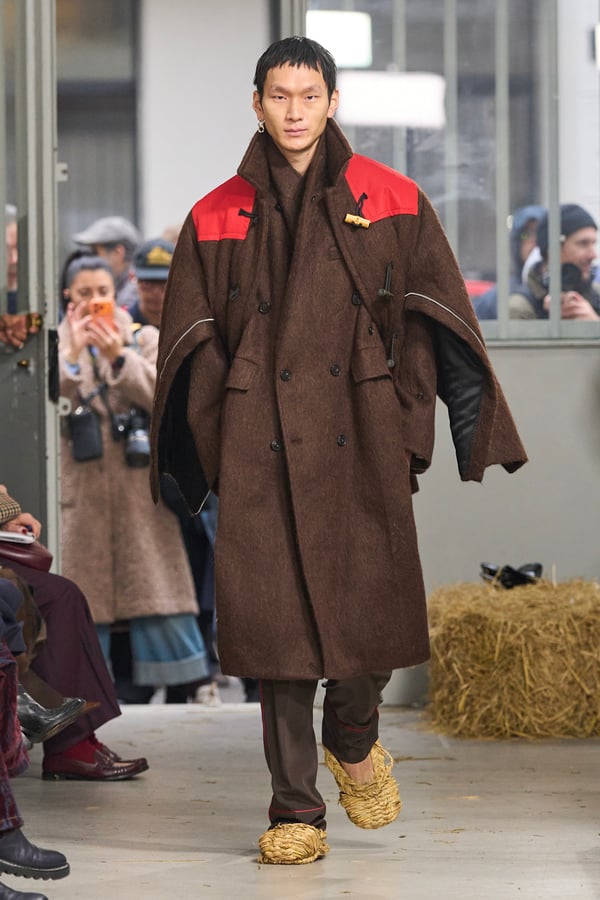 ディテールには桑田の趣味である釣りの要素を取り入れ、ルアーを模したバックルベルトなどが登場。バッグが衣服へと変形するアウターや、異素材を組み合わせたMA-1など、機能性と実験的なアプローチが共存する。さらに、北日本の古い靴や「蓑」に着想を得たアイテムも展開され、遠く離れた文化圏の知恵が融合。衣服本来の機能美をラグジュアリーへと昇華させたコレクションとなった。