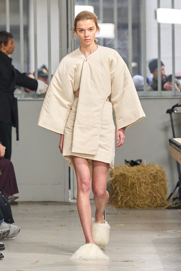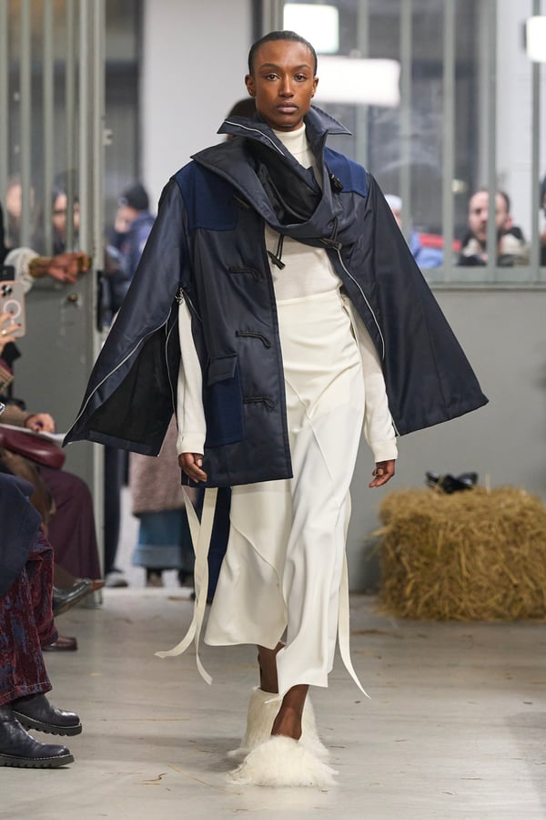 コレクションの着想源は、桑田が訪れたグリーンランドへの旅と釣りの記憶だ。極限環境で生きるイヌイットの衣服構造に着目し、アームホールの位置や素材の機能性など、装飾を削ぎ落とした「機能に裏打ちされた美」を現代的に再解釈した。
