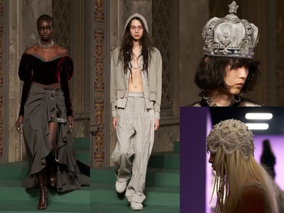 今季のファーストルックは、胸ポケット付近に名札のような装飾を施したジャケットと、大きくスリットが入った同素材のロングスカートのセットアップ。これまでのショーではレースや刺繍、ビジューをふんだんに用いたルックがオープニングを飾っていたことから、新たなフェーズを感じさせた。ニットカーディガンやセーター、ジャカード素材のブルゾン、スウェットパンツといった日常的なアイテムの細部に刺繍やビジューを施し、ヘアアクセサリーやチョーカーといった装飾品と組み合わせるなど、ブランドらしさを散りばめた。