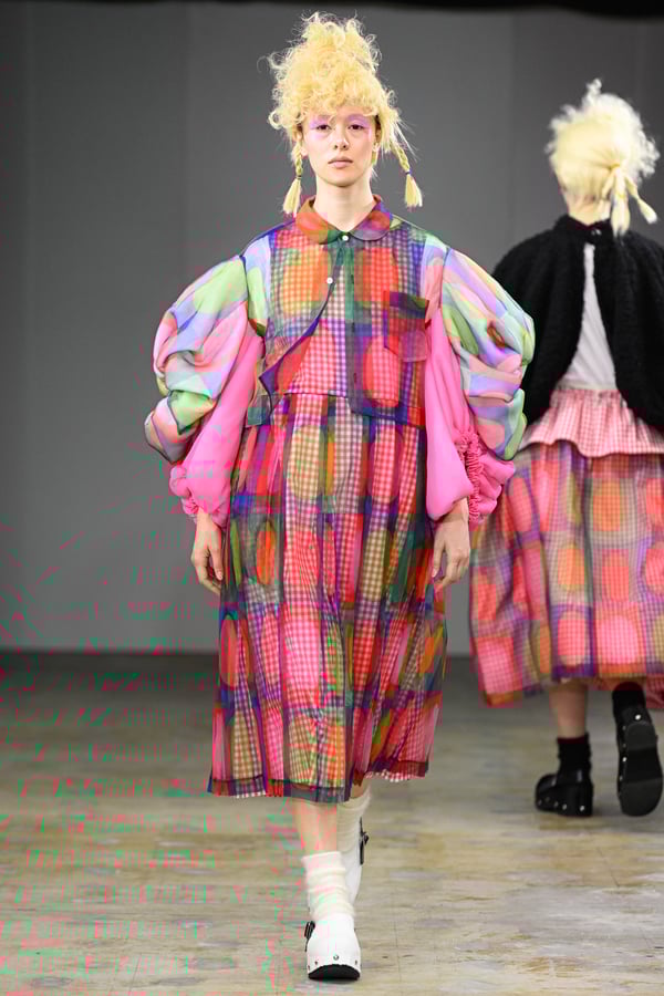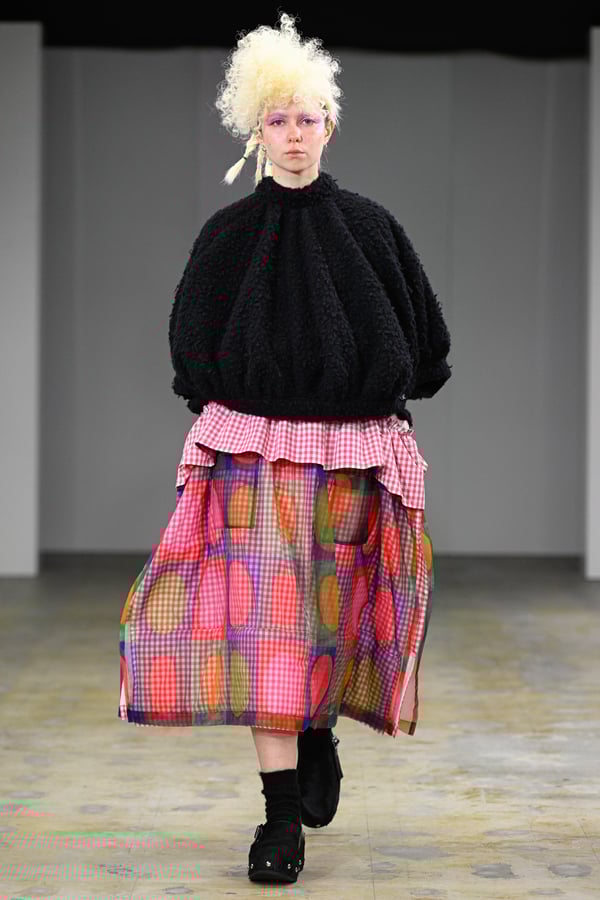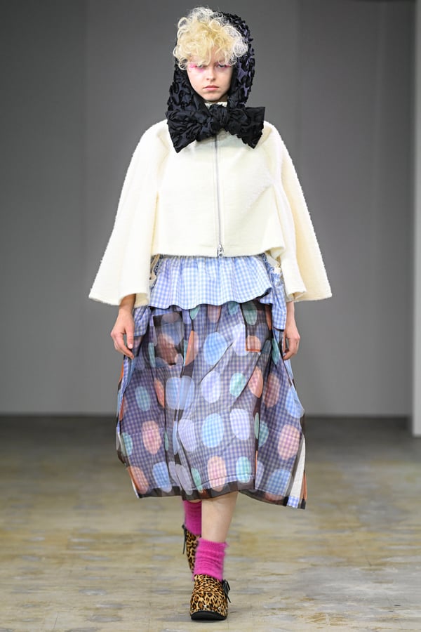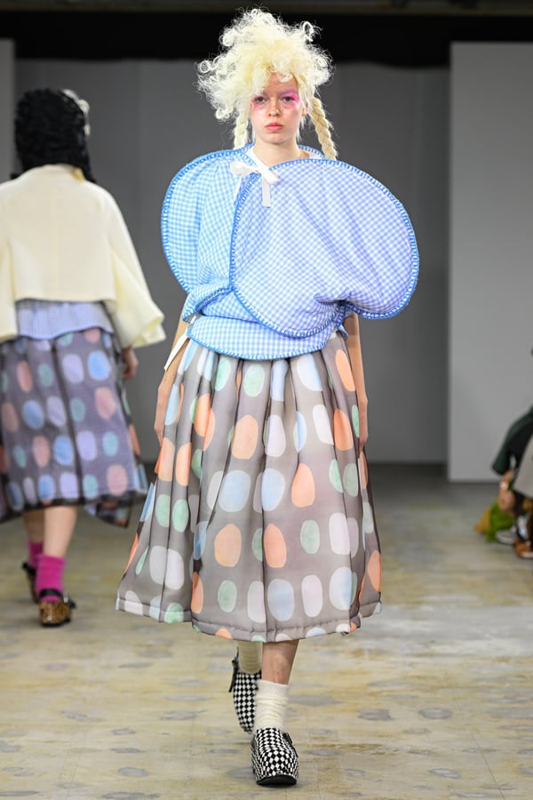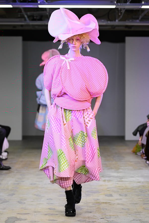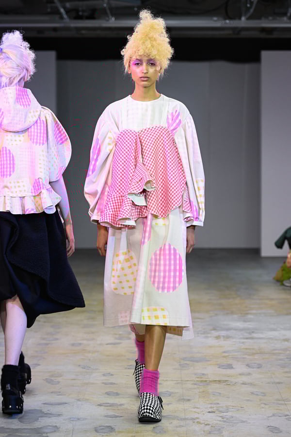 着想源となったのは、オランダ人アーティスト、ルース・ファン・ビーク(Ruth van Beek)の作品。象徴的なモチーフである「丸」を使った服作りを試みた。円形パーツを縫い合わせたトップスをはじめ、サーキュラースカートやバルーンスカート、襟や裾にあしらったフリルやスカラップなど、コレクションは多彩な「丸」で構成。ルース・ファン・ビークのコラージュ作品を、さらにタオがコラージュして取り入れる形でコラボレーションし、オリジナルパターンのテキスタイルを制作したという。ギンガムチェックやタータンチェックを組み合わせることで、規則的な格子柄がフォルムの曲線を際立たせた。