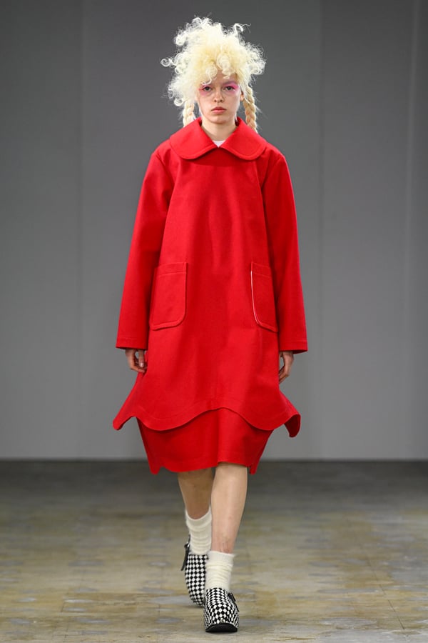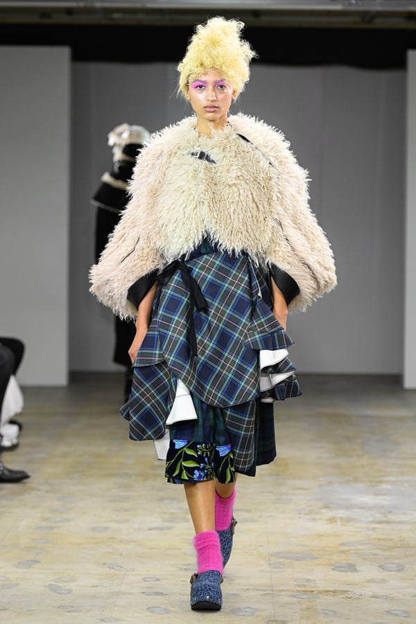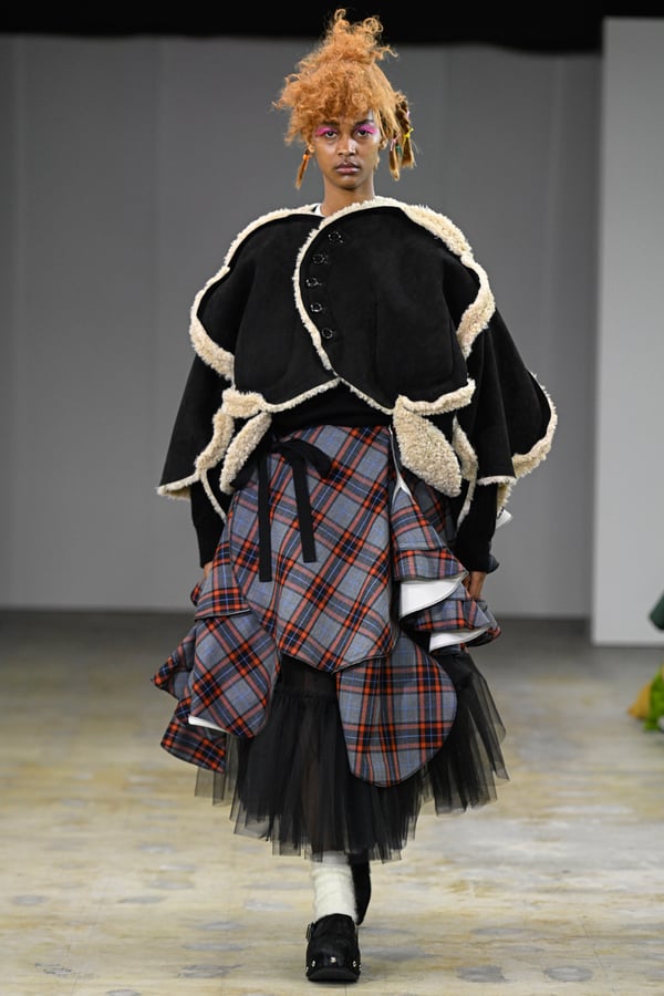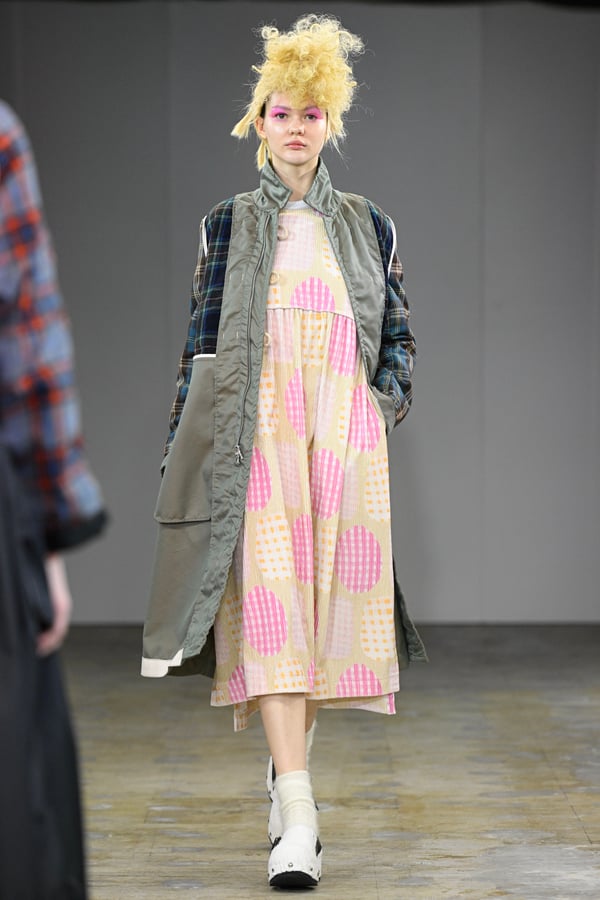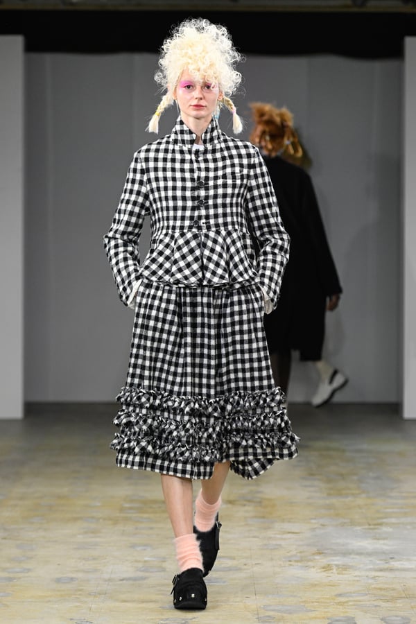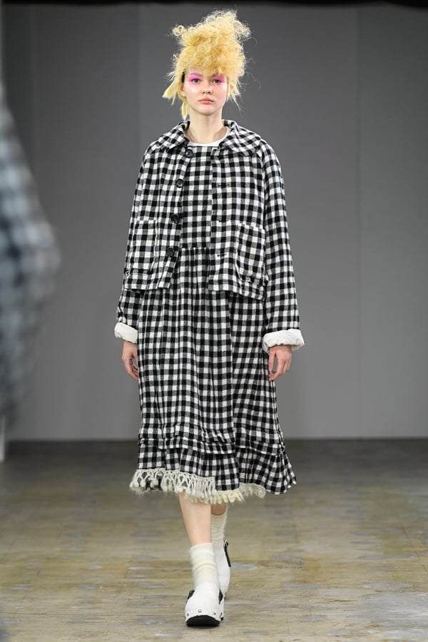 着想源となったのは、オランダ人アーティスト、ルース・ファン・ビーク(Ruth van Beek)の作品。象徴的なモチーフである「丸」を使った服作りを試みた。円形パーツを縫い合わせたトップスをはじめ、サーキュラースカートやバルーンスカート、襟や裾にあしらったフリルやスカラップなど、コレクションは多彩な「丸」で構成。ルース・ファン・ビークのコラージュ作品を、さらにタオがコラージュして取り入れる形でコラボレーションし、オリジナルパターンのテキスタイルを制作したという。ギンガムチェックやタータンチェックを組み合わせることで、規則的な格子柄がフォルムの曲線を際立たせた。