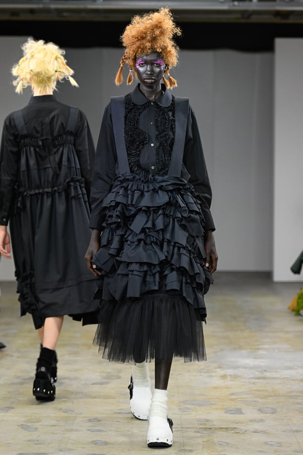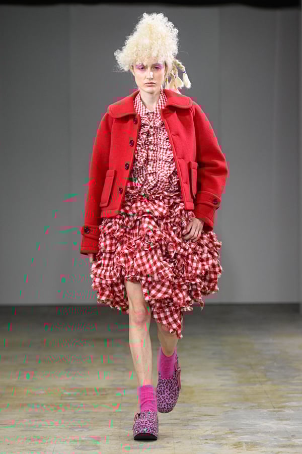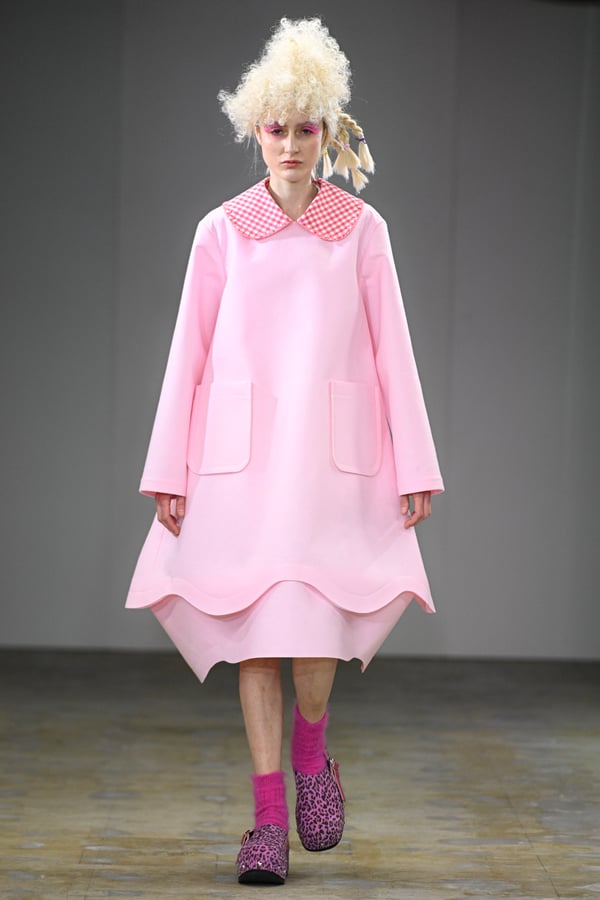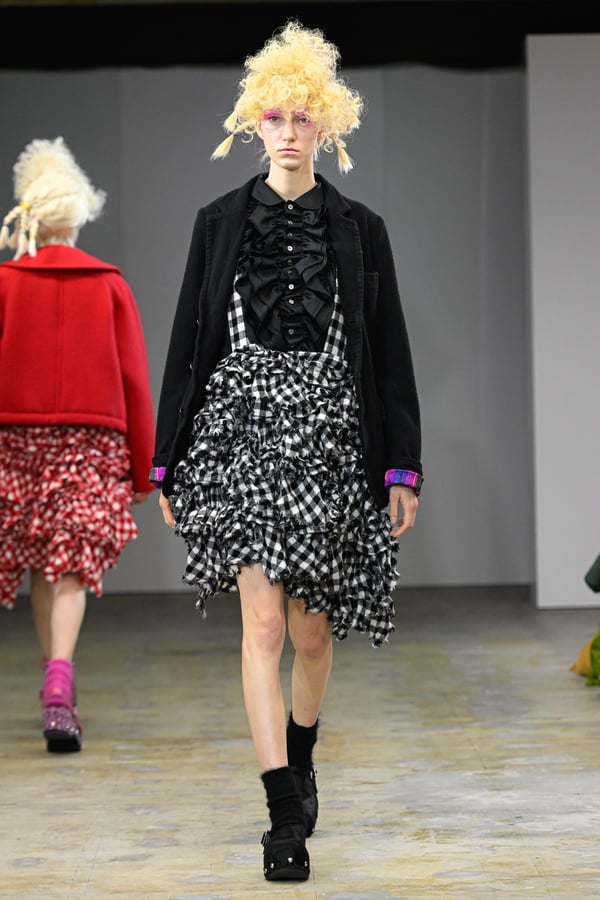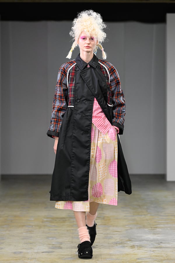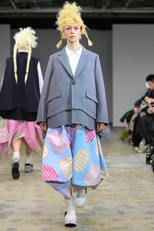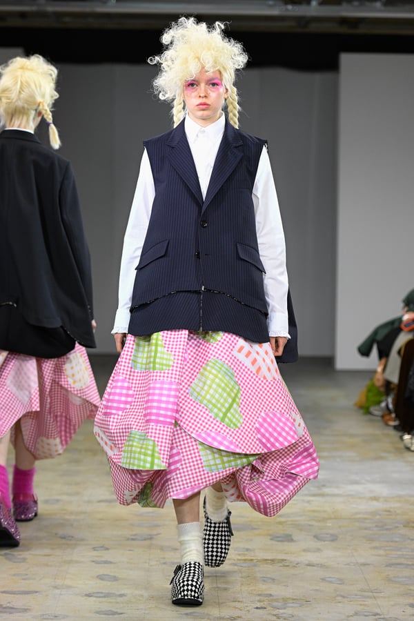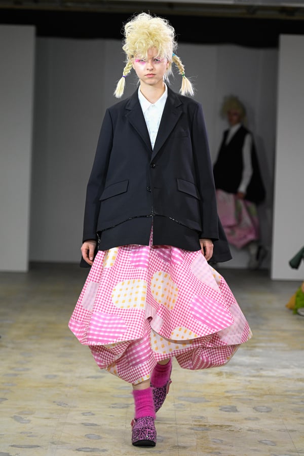 ピンクやブルーのポップな彩りに、ブラックやレッドのジャケットやシャツがほどよい緊張感を添える。足元は、オランダに由来するサボ。スタッズ付きのデザインで、ブラックやホワイトをはじめチェックやレオパード柄など豊富に登場した。