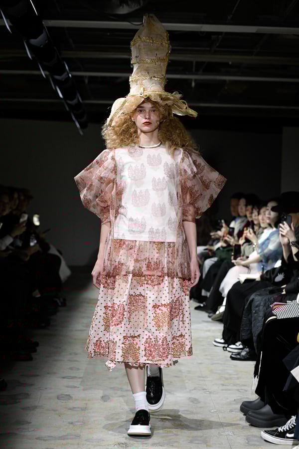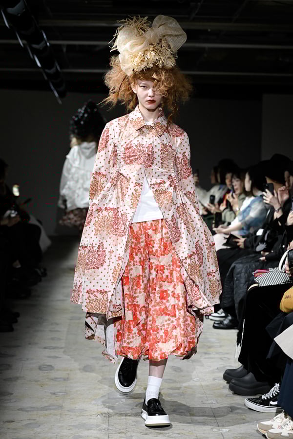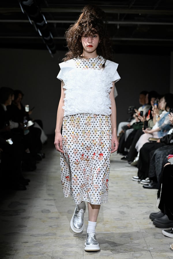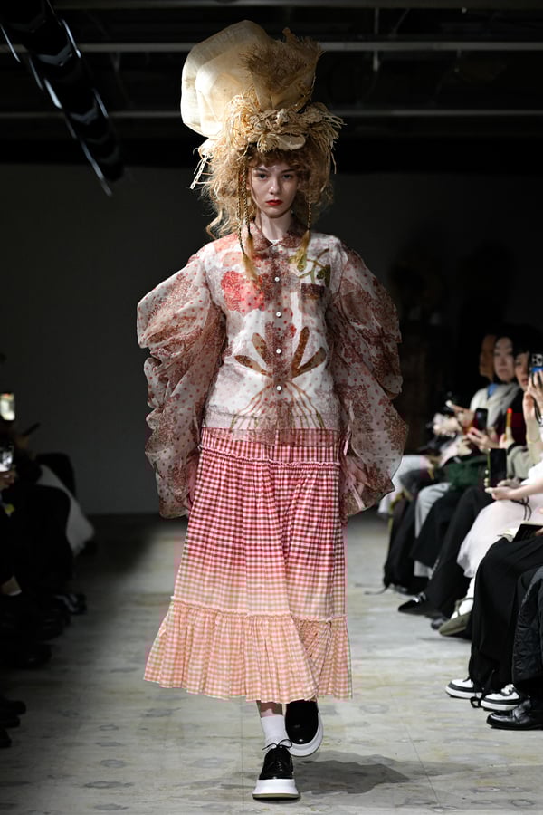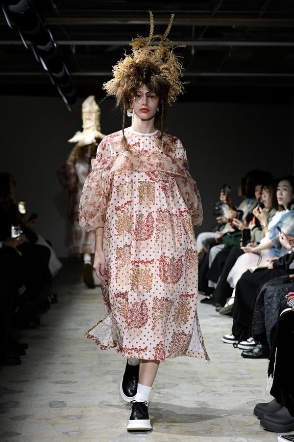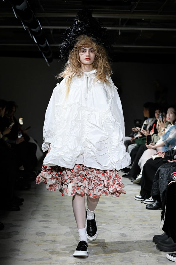 コレクションでは、花をモチーフとした今村の作品をプリントしドット柄を重ねた生地を主役に、タオらしいギャザーやフリル、ラッフルをふんだんに用いた、ボリューム感のあるシルエットのガーリーなスタイルを提案。オーガンジーやチュール、極薄のタフタなど、透け感のある素材のレイヤードから覗く多様な濃淡の花やドットの赤からは皮ふの下に透ける血液のようなぬくもりを、ブラウスやスカートなどにあしらった細かく繊細なギャザーや立体的な花の装飾がもたらす豊かな表情からは、生き生きとしたいのちの蠢きを感じさせた。