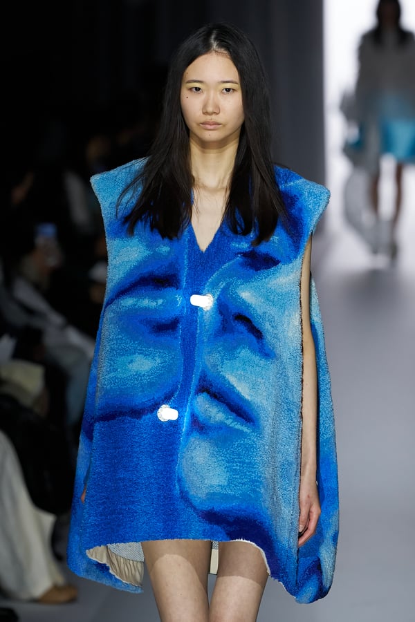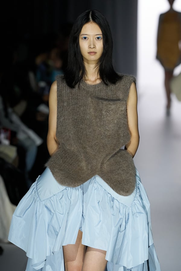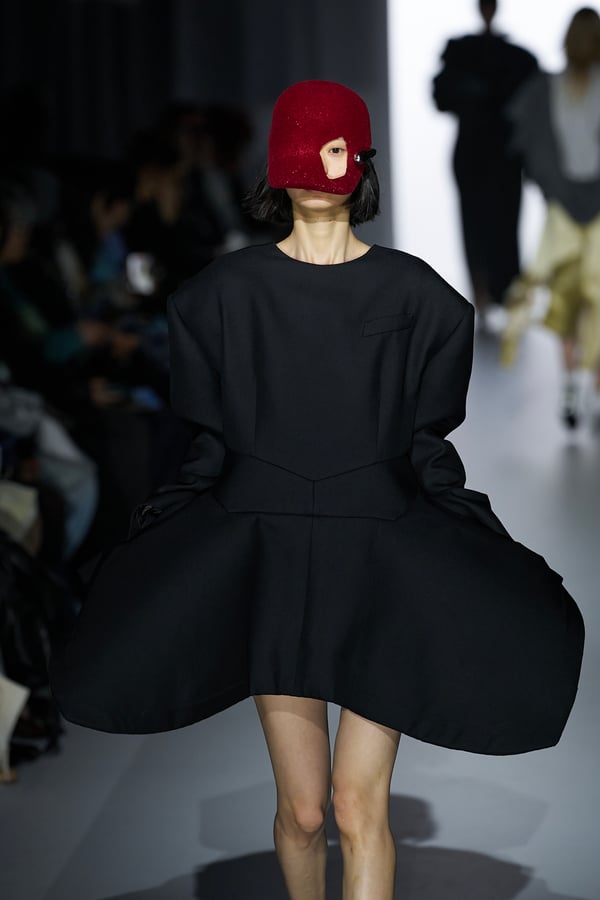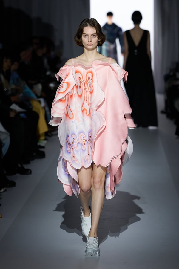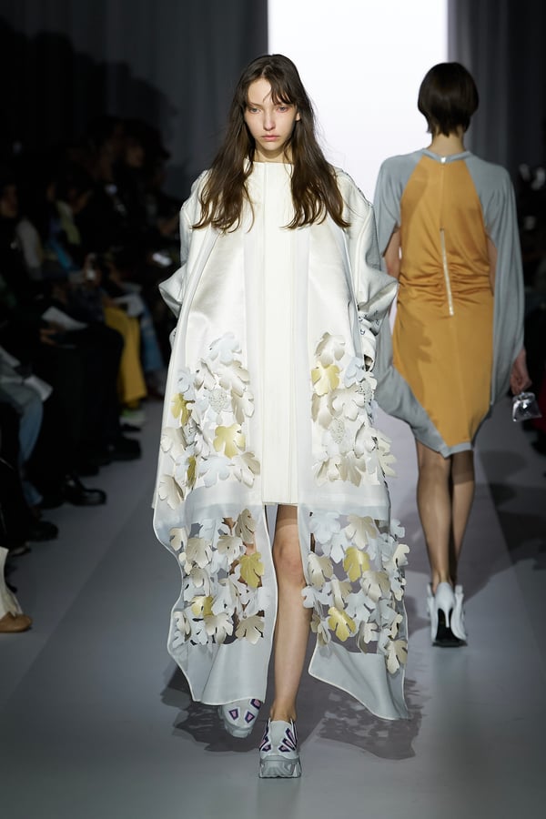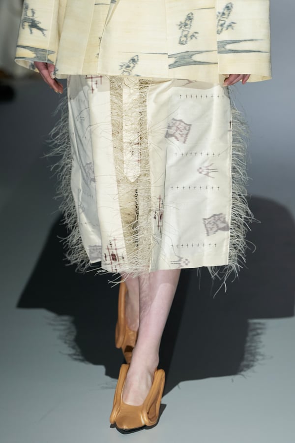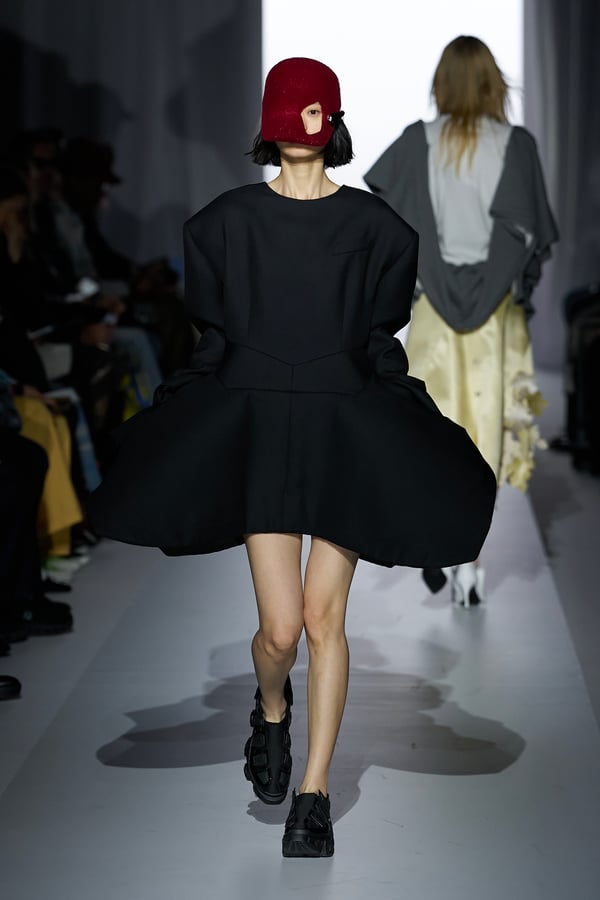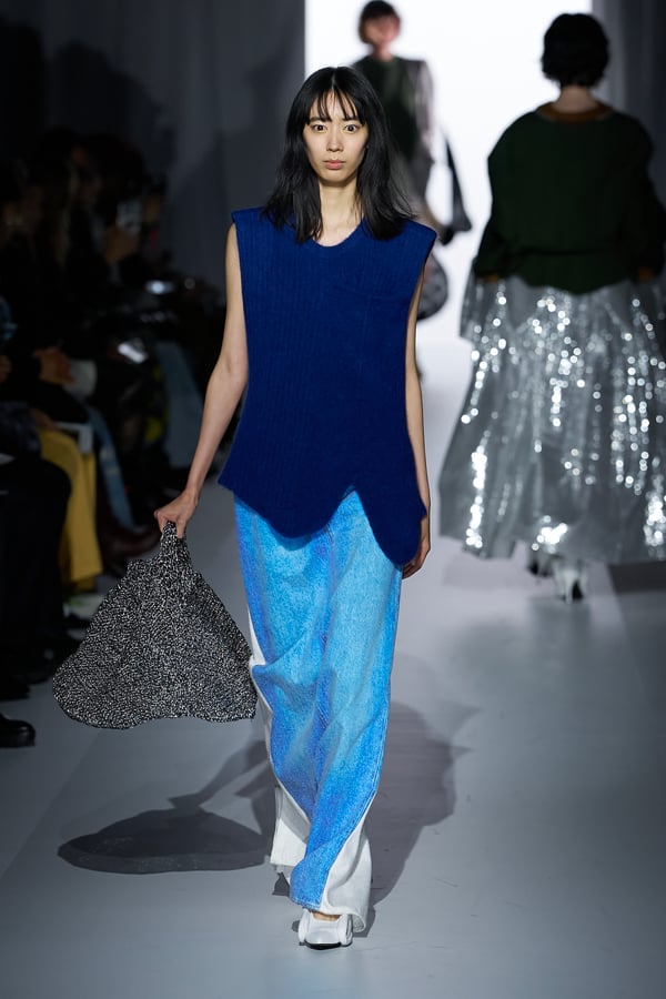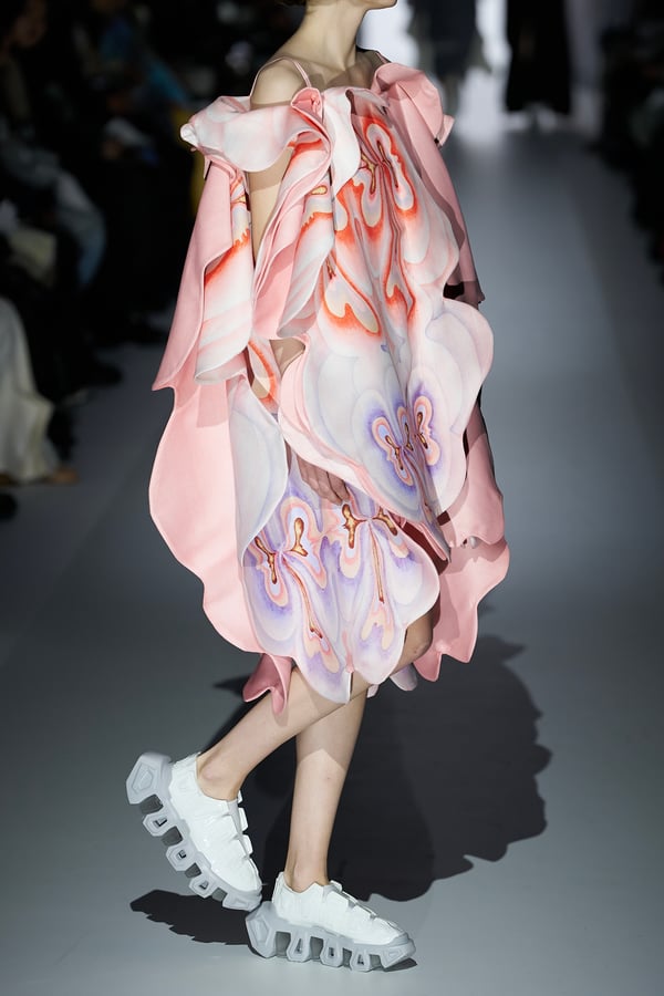 また、アーティストやブランドとの多彩なコラボレーションアイテムも登場。画家 森⼣⾹の描いた「実在しない⾊のパンジー」をあしらったドレスや、老舗帽子アトリエ「オートモード平田」の「エイチ.エイティー(H.at)」による歪な穴が空いたキャップ、スリートレジャーズ(THREE TREASURES)との協業によるシューズ、「ラストフレーム(LASTFRAME)」によるラグビーボールのようなフォルムを再現した手編みのバッグなどがコレクションを豊かに彩った。