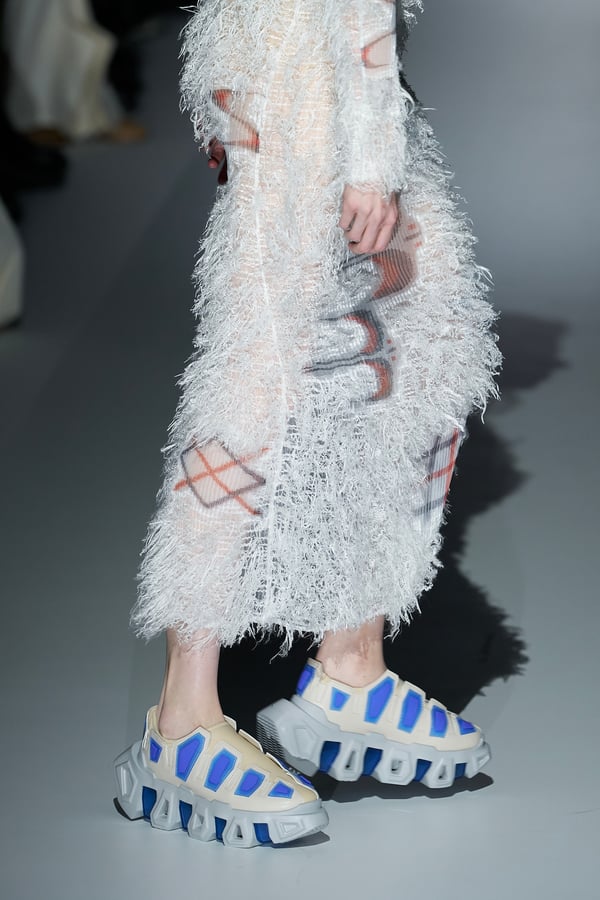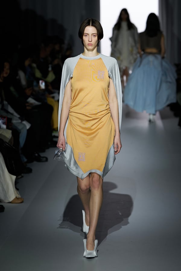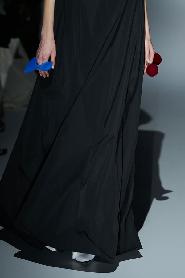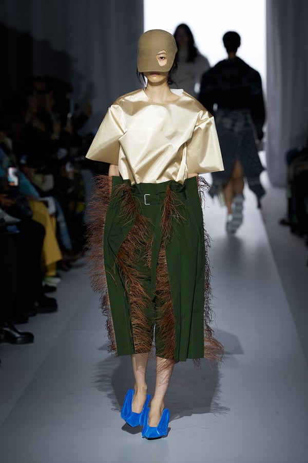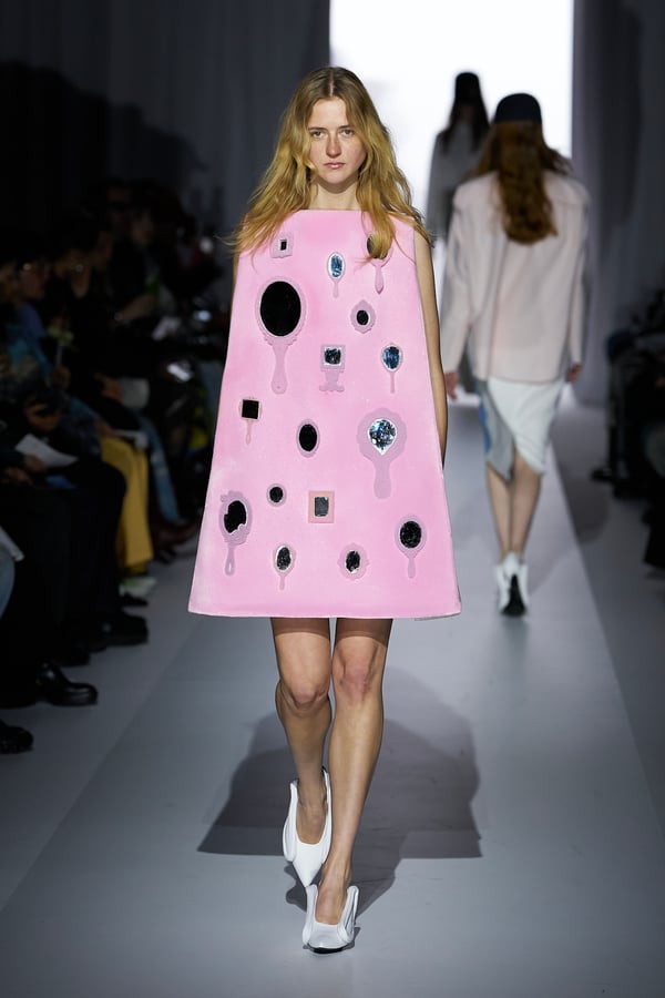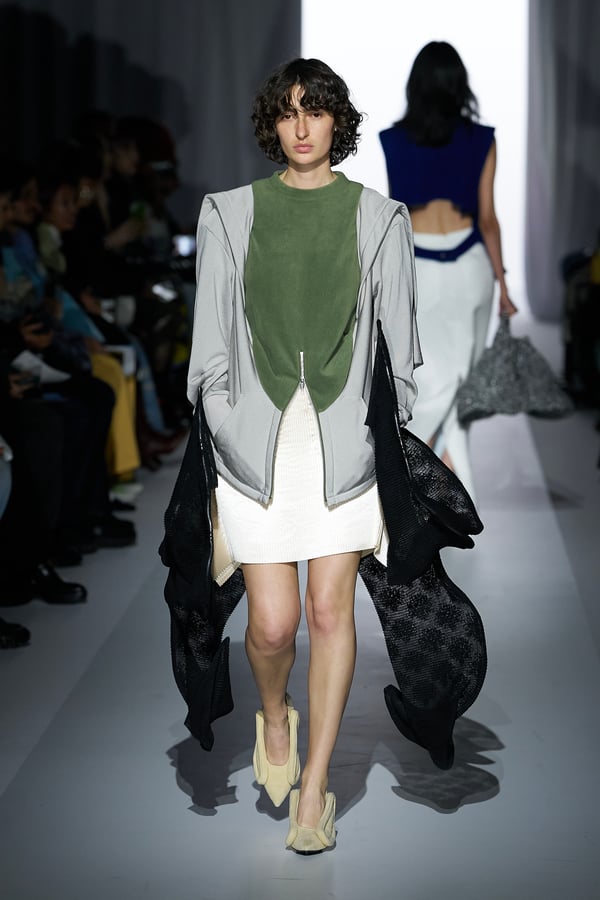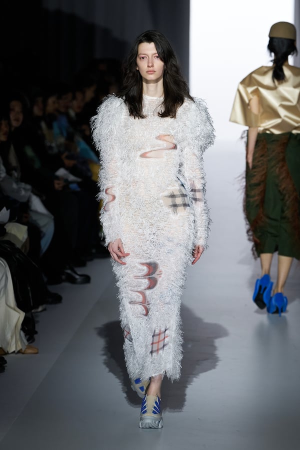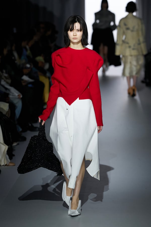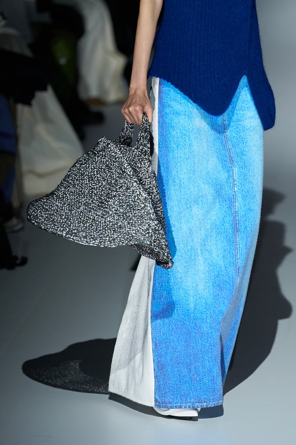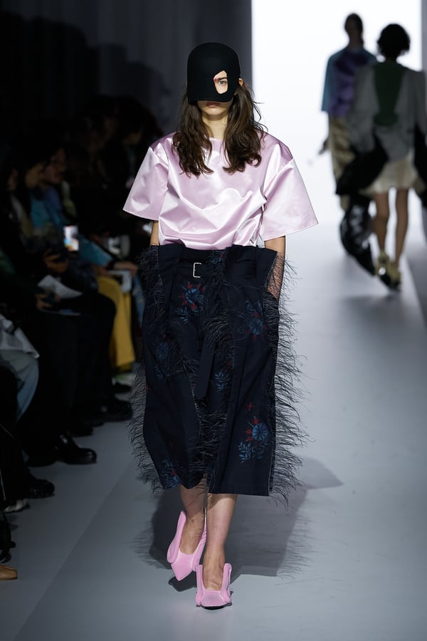 また、アーティストやブランドとの多彩なコラボレーションアイテムも登場。画家 森⼣⾹の描いた「実在しない⾊のパンジー」をあしらったドレスや、老舗帽子アトリエ「オートモード平田」の「エイチ.エイティー(H.at)」による歪な穴が空いたキャップ、スリートレジャーズ(THREE TREASURES)との協業によるシューズ、「ラストフレーム(LASTFRAME)」によるラグビーボールのようなフォルムを再現した手編みのバッグなどがコレクションを豊かに彩った。