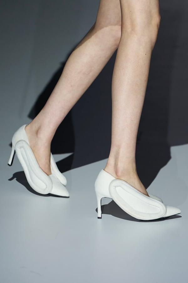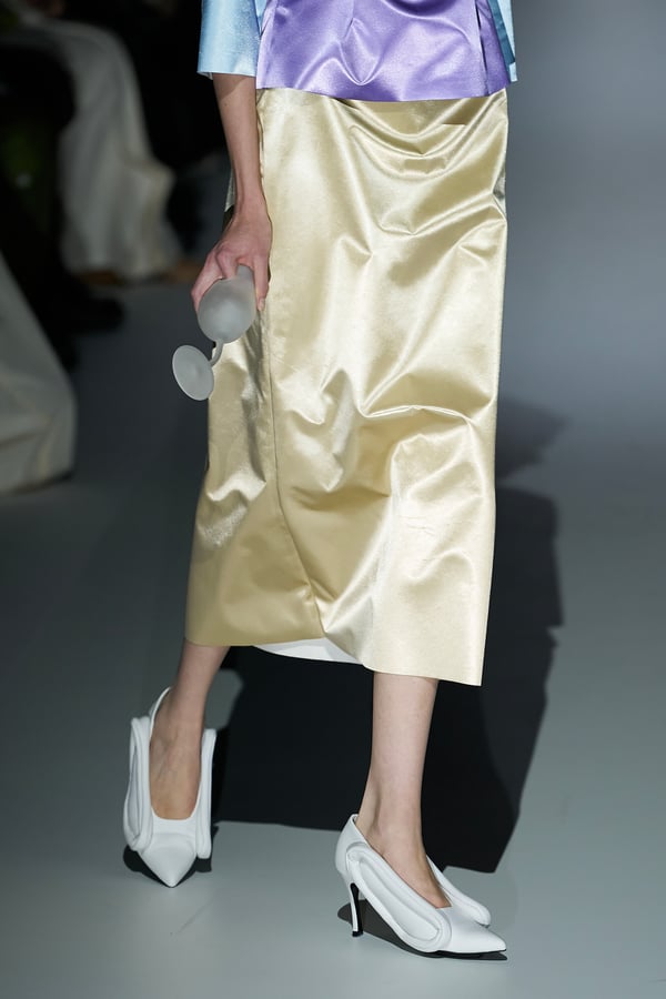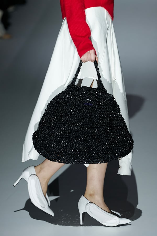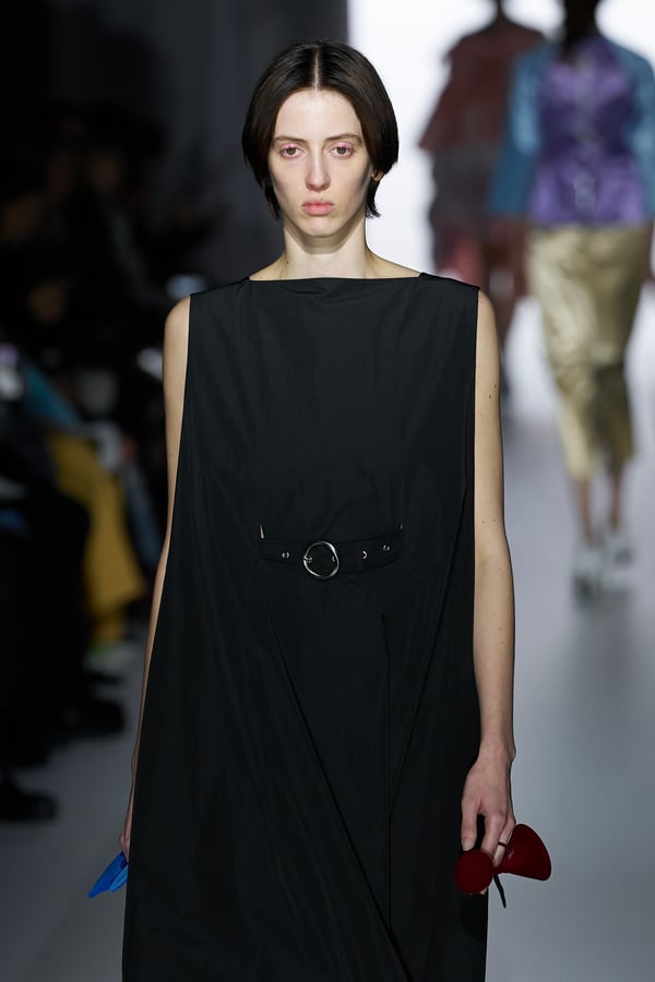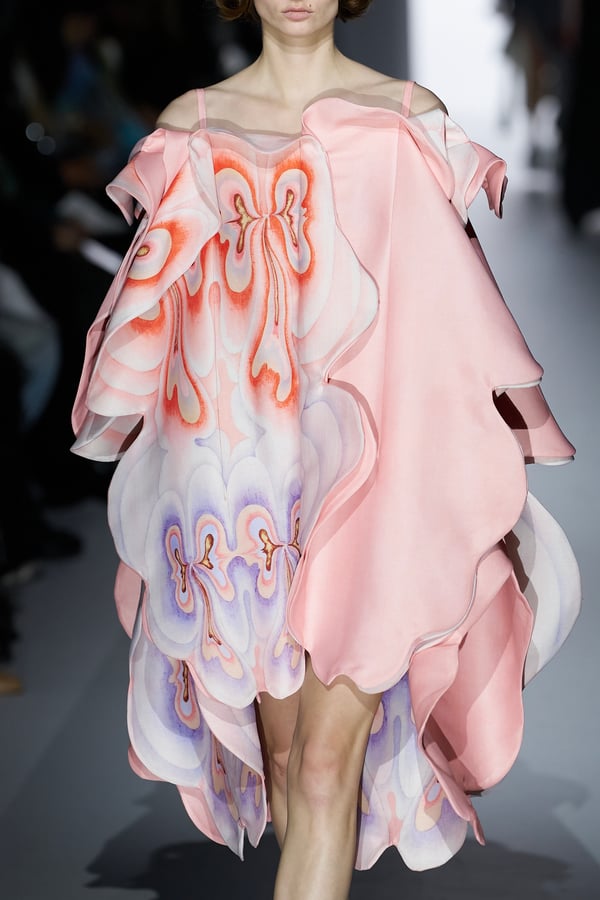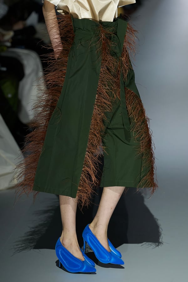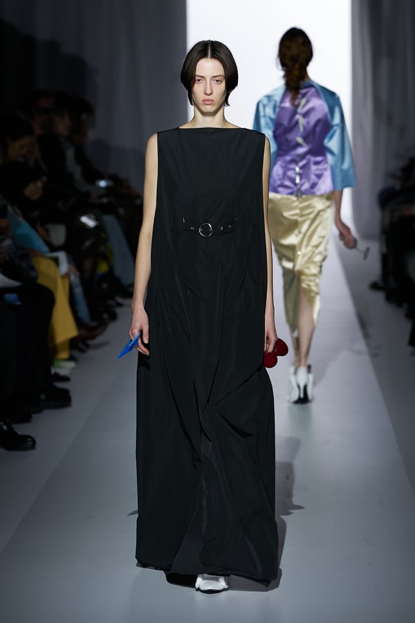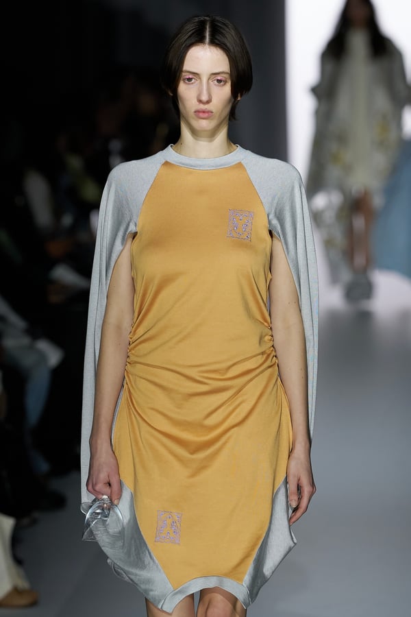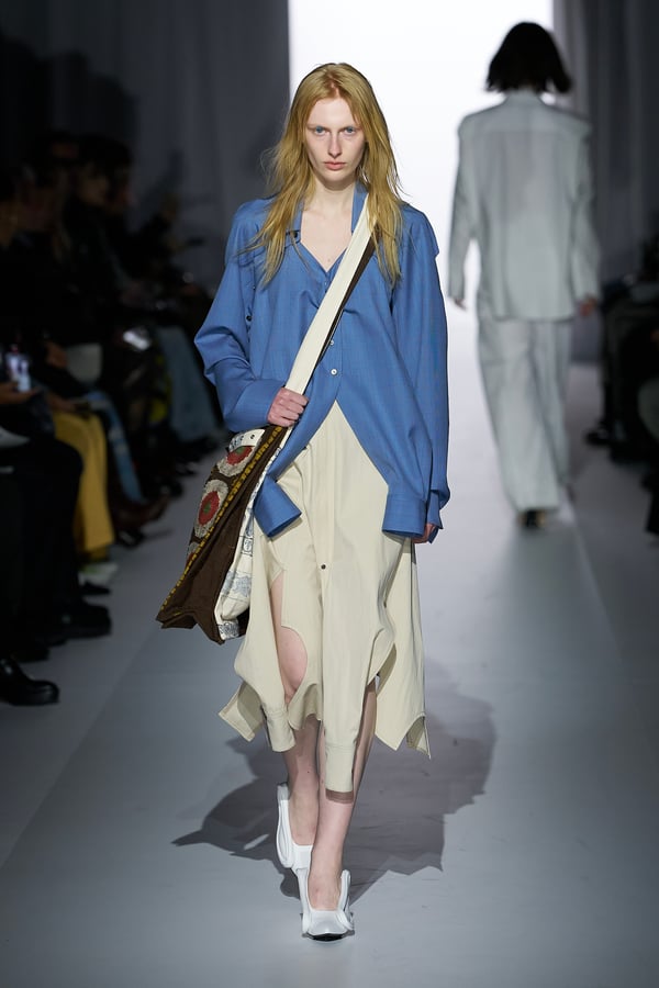また、アーティストやブランドとの多彩なコラボレーションアイテムも登場。画家 森⼣⾹の描いた「実在しない⾊のパンジー」をあしらったドレスや、老舗帽子アトリエ「オートモード平田」の「エイチ.エイティー(H.at)」による歪な穴が空いたキャップ、スリートレジャーズ(THREE TREASURES)との協業によるシューズ、「ラストフレーム(LASTFRAME)」によるラグビーボールのようなフォルムを再現した手編みのバッグなどがコレクションを豊かに彩った。