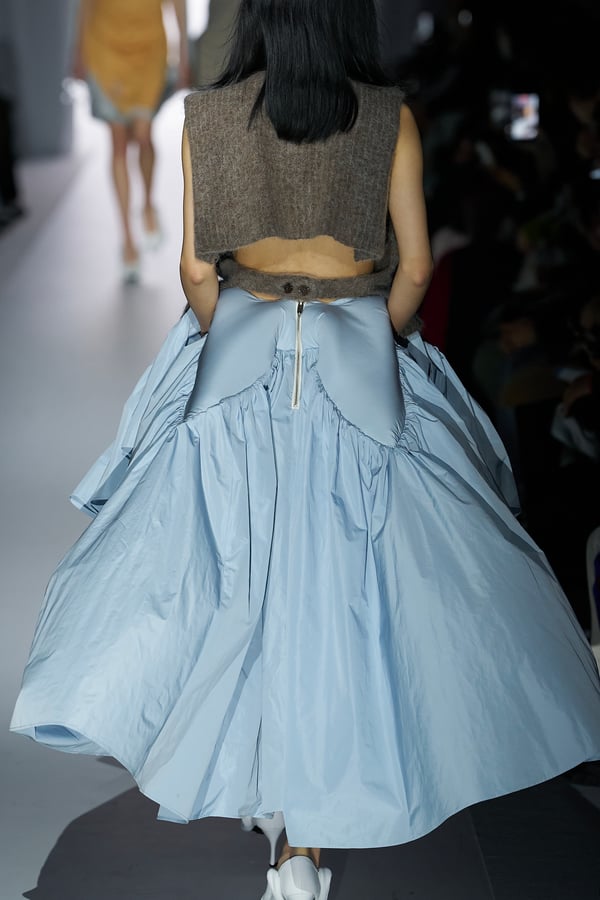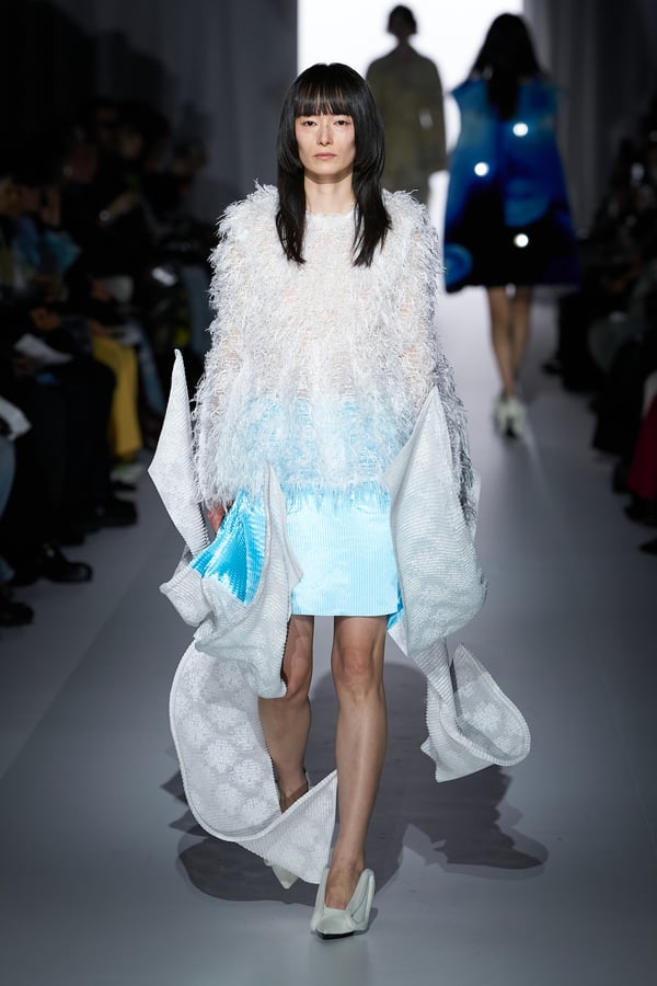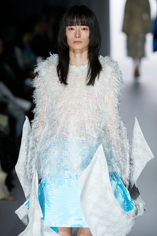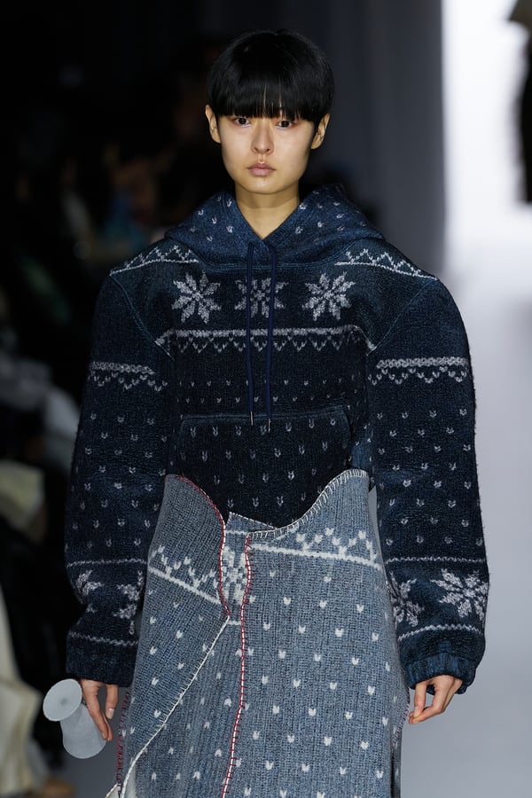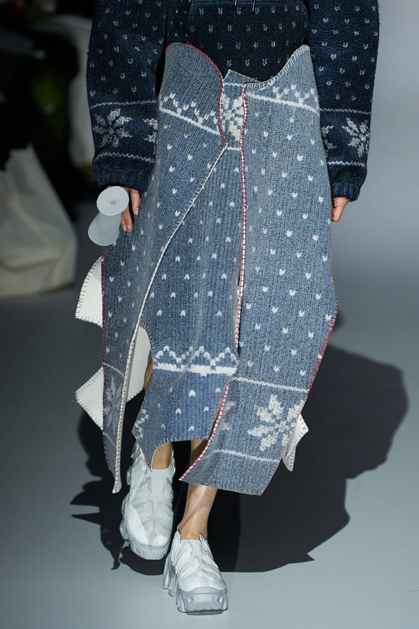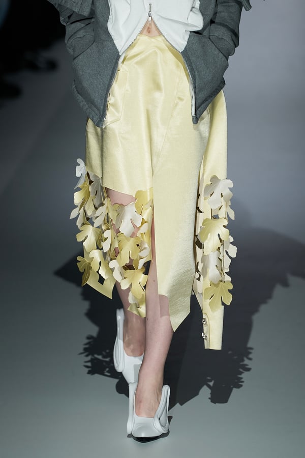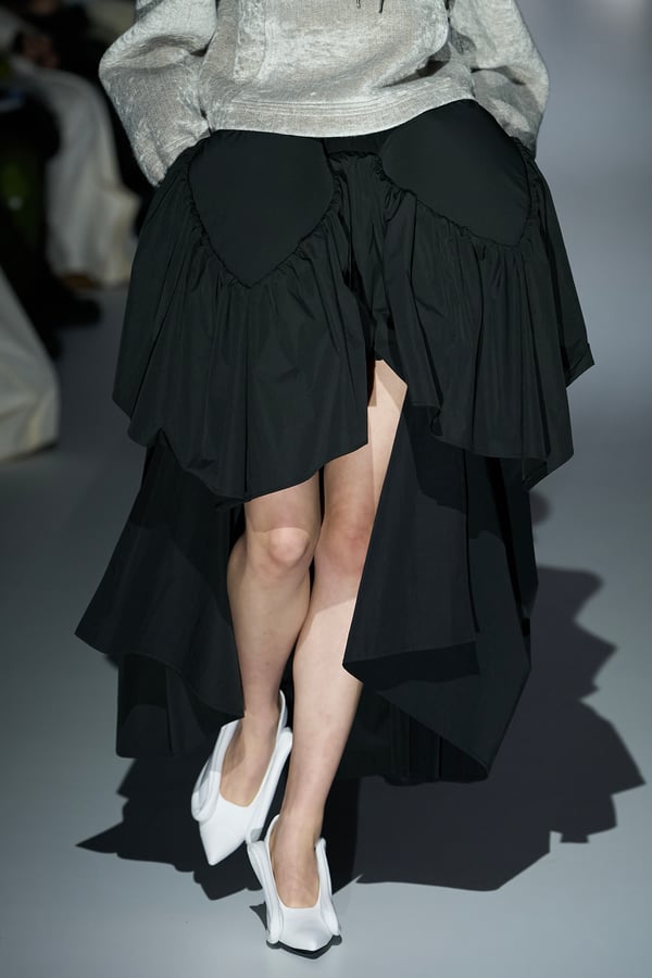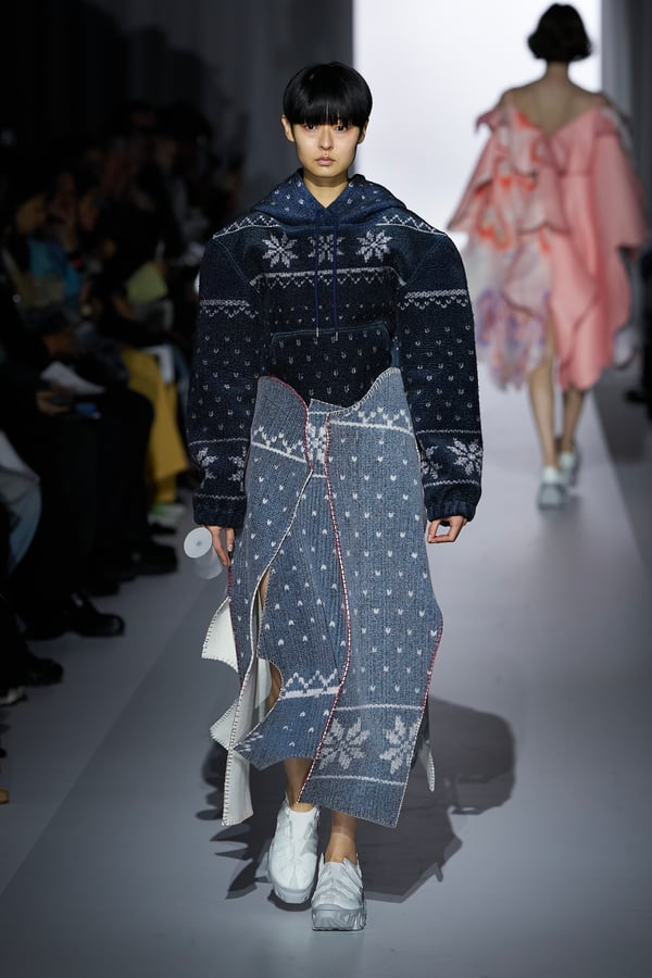 コレクションの構成はデイヴィッド・リンチの映画作品からも着想を得て、多種多様な人々が同じ地平で生きている空想上の世界をイメージ。大野が敬愛するデザイナー チャールズ・ジェームズ(Charles James)のパターンを再解釈した四つ葉のようなシェイプのドレスをはじめ、針金を用いたシャンデリアのような造形のスカートや、身頃のパターンを解体して作り上げたスカートなど、独自のフォルムを追求してきたヨウヘイオオノらしいアイテムが多く見られた。加えて、デニムや雪柄のセーターを転写プリントしたトップスやスカート、レーザーカットで葉が生い茂るさまを表現したコートなど、新たなテキスタイル表現も散見された。