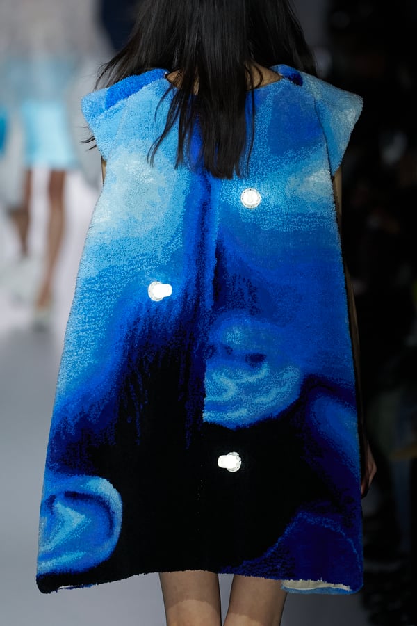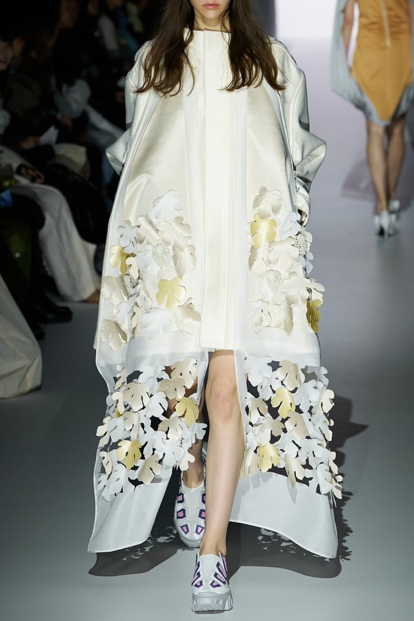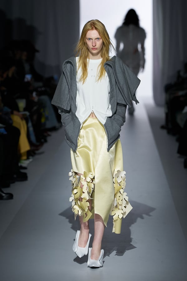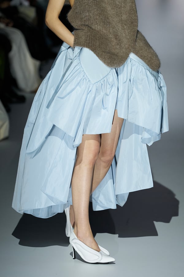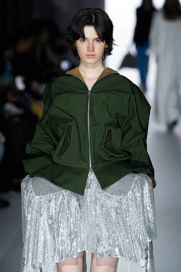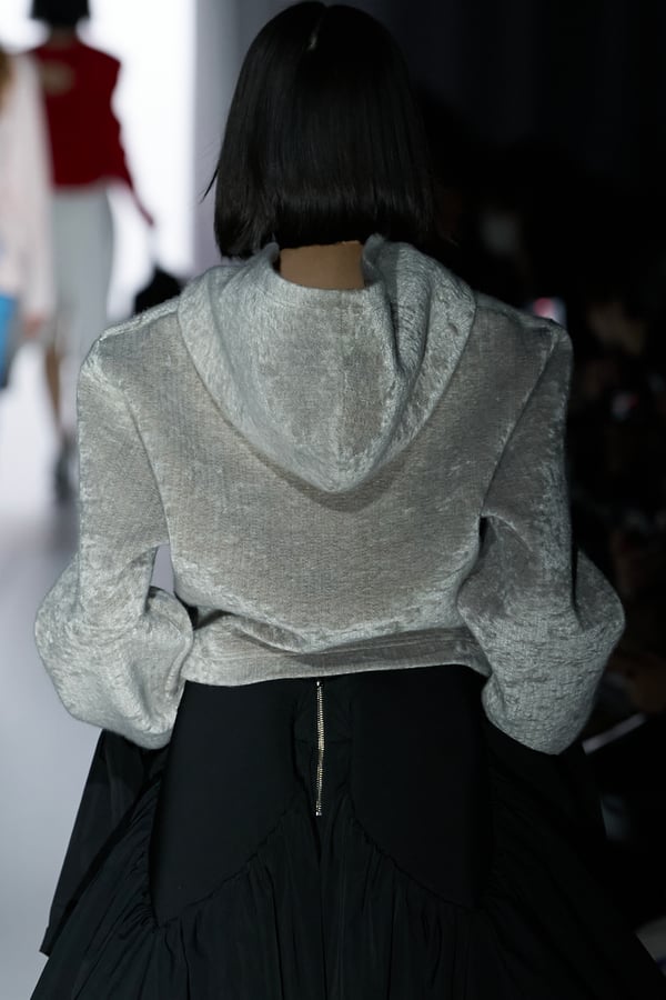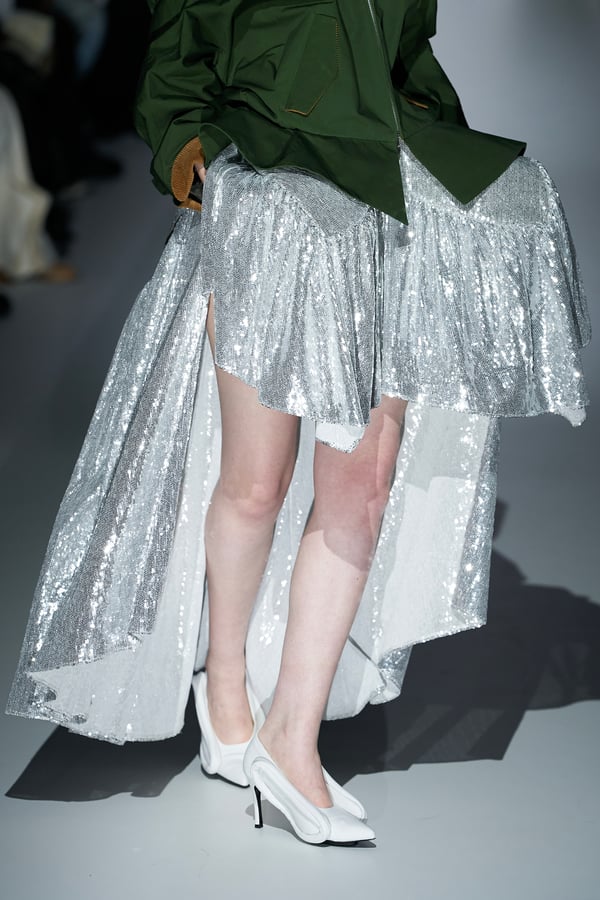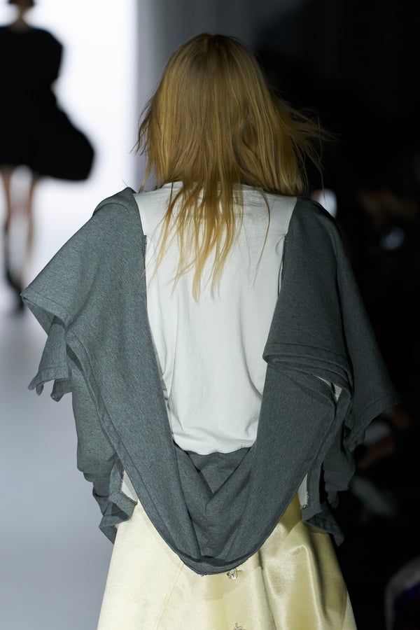 コレクションの構成はデイヴィッド・リンチの映画作品からも着想を得て、多種多様な人々が同じ地平で生きている空想上の世界をイメージ。大野が敬愛するデザイナー チャールズ・ジェームズ(Charles James)のパターンを再解釈した四つ葉のようなシェイプのドレスをはじめ、針金を用いたシャンデリアのような造形のスカートや、身頃のパターンを解体して作り上げたスカートなど、独自のフォルムを追求してきたヨウヘイオオノらしいアイテムが多く見られた。加えて、デニムや雪柄のセーターを転写プリントしたトップスやスカート、レーザーカットで葉が生い茂るさまを表現したコートなど、新たなテキスタイル表現も散見された。