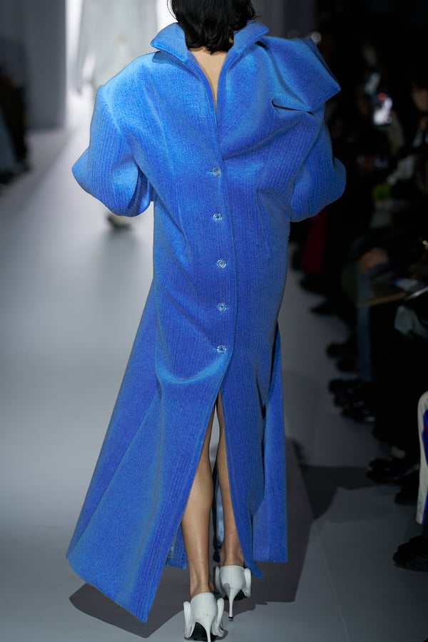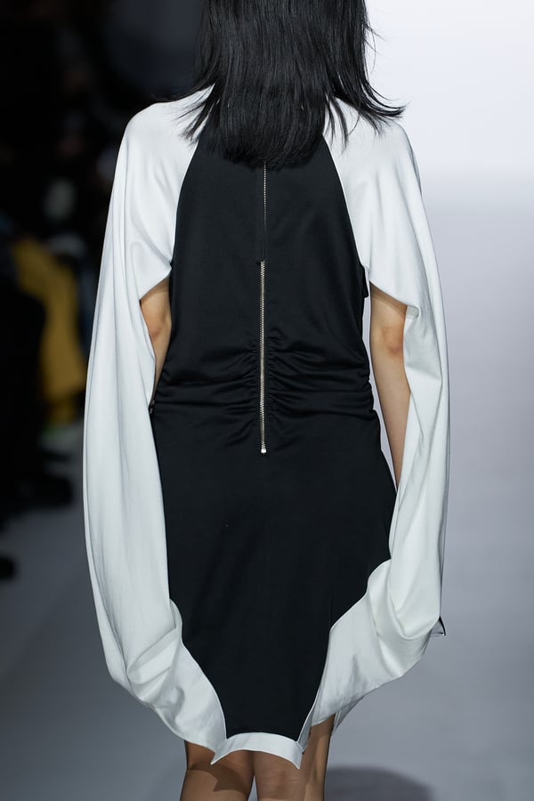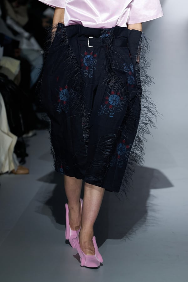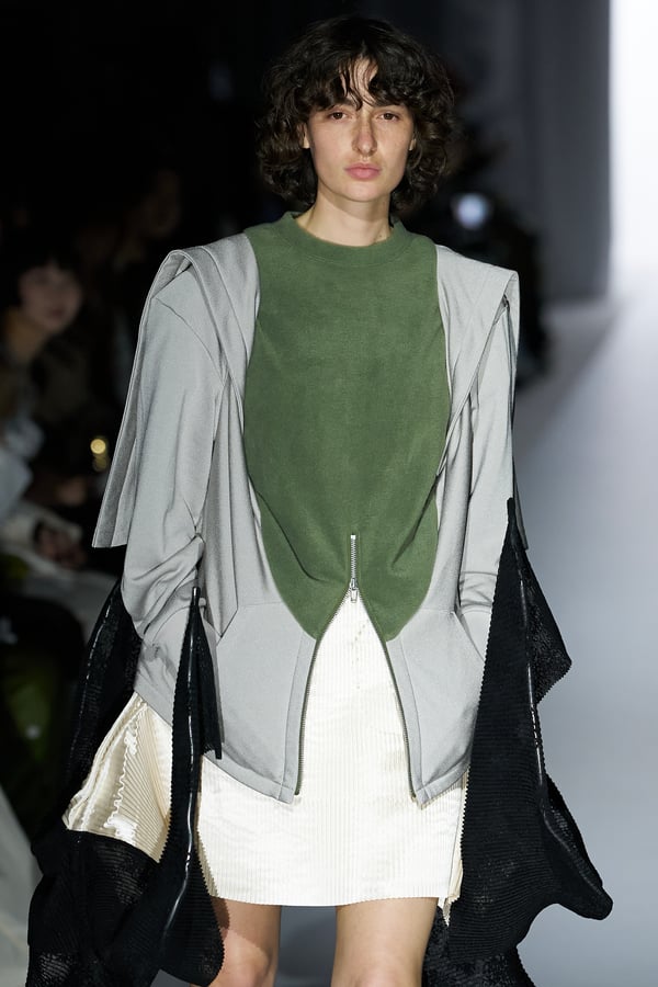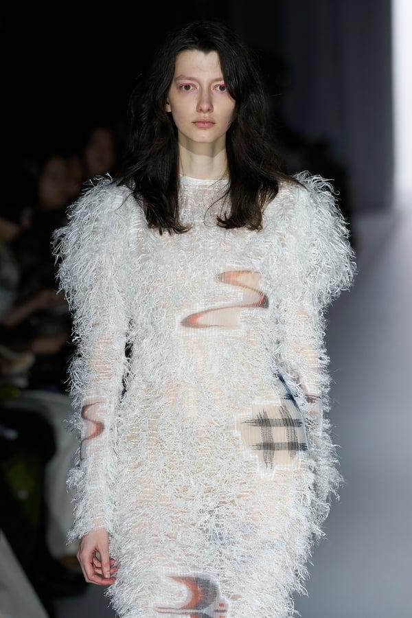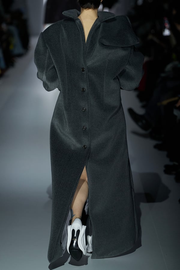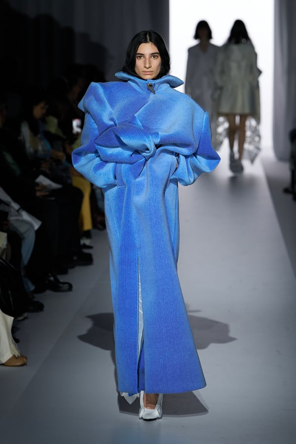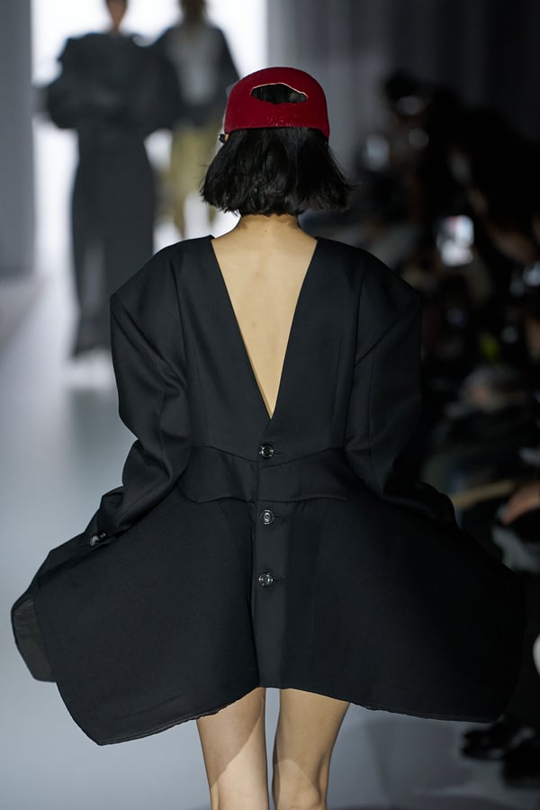 コレクションの構成はデイヴィッド・リンチの映画作品からも着想を得て、多種多様な人々が同じ地平で生きている空想上の世界をイメージ。大野が敬愛するデザイナー チャールズ・ジェームズ(Charles James)のパターンを再解釈した四つ葉のようなシェイプのドレスをはじめ、針金を用いたシャンデリアのような造形のスカートや、身頃のパターンを解体して作り上げたスカートなど、独自のフォルムを追求してきたヨウヘイオオノらしいアイテムが多く見られた。加えて、デニムや雪柄のセーターを転写プリントしたトップスやスカート、レーザーカットで葉が生い茂るさまを表現したコートなど、新たなテキスタイル表現も散見された。