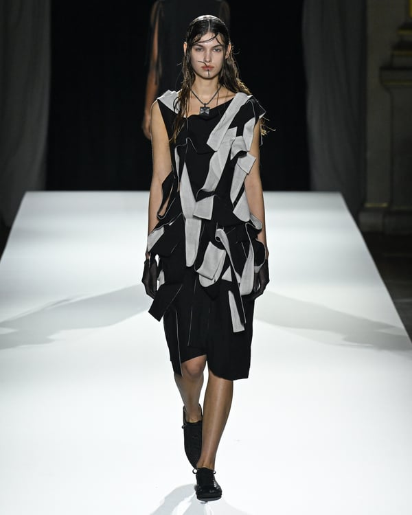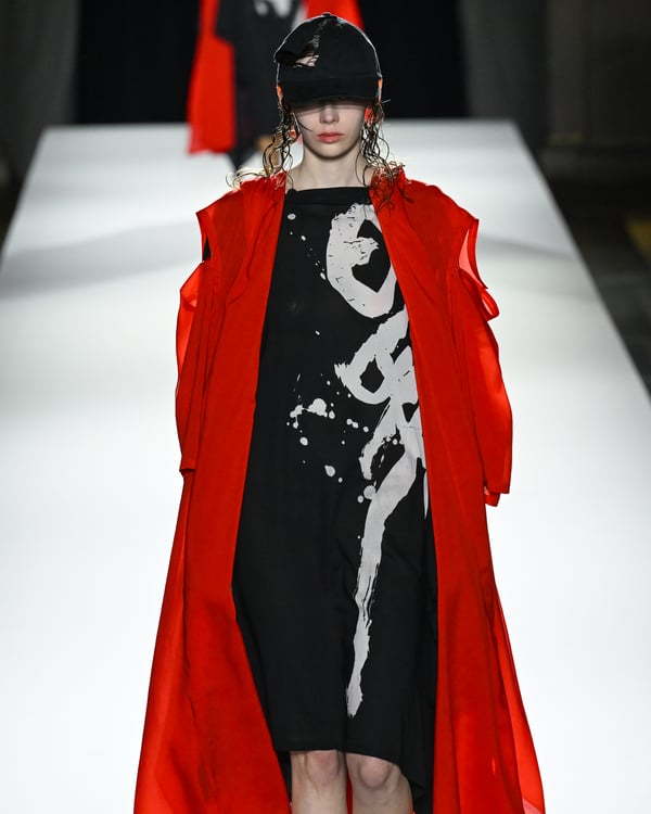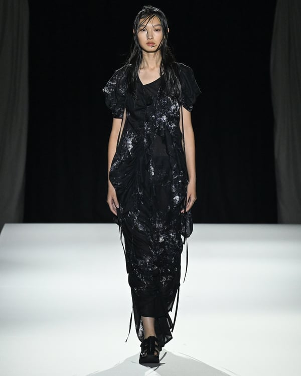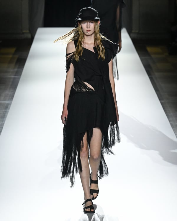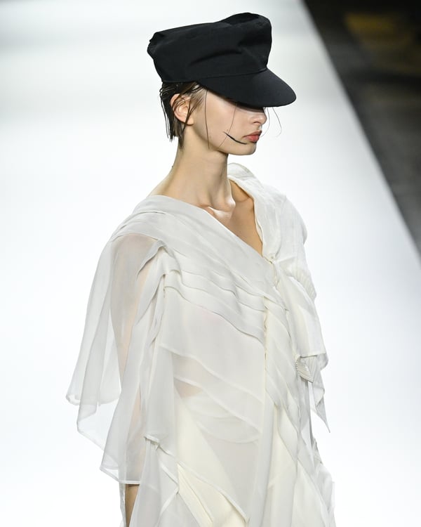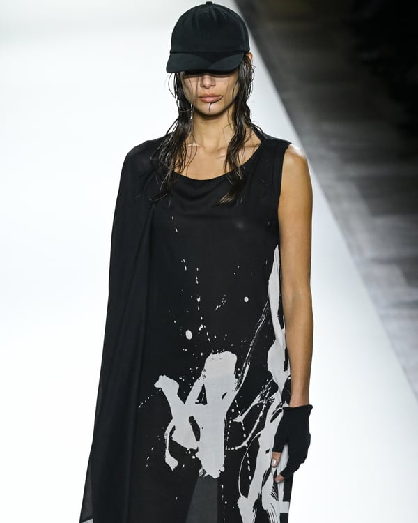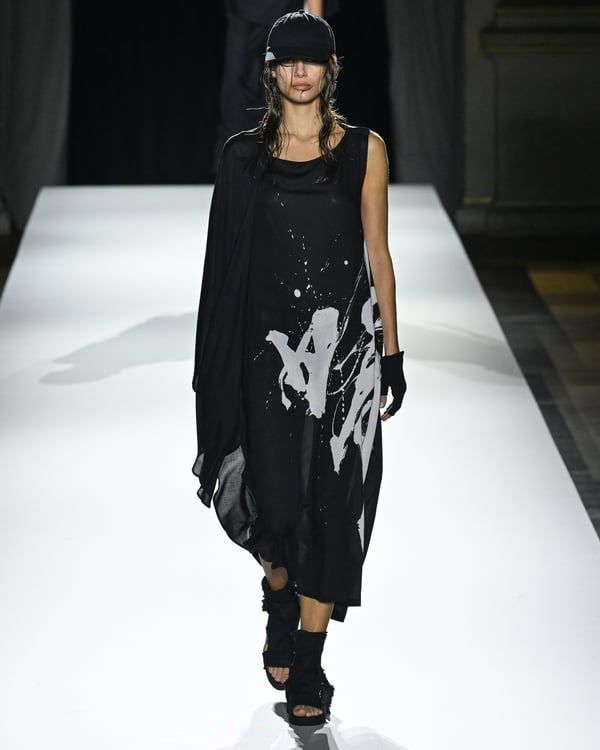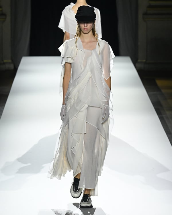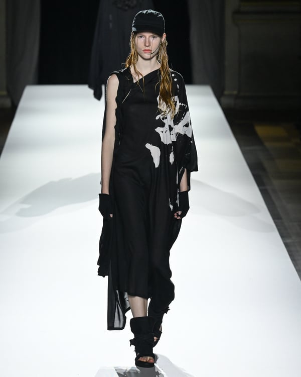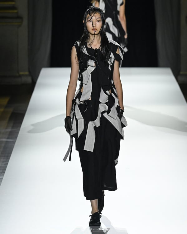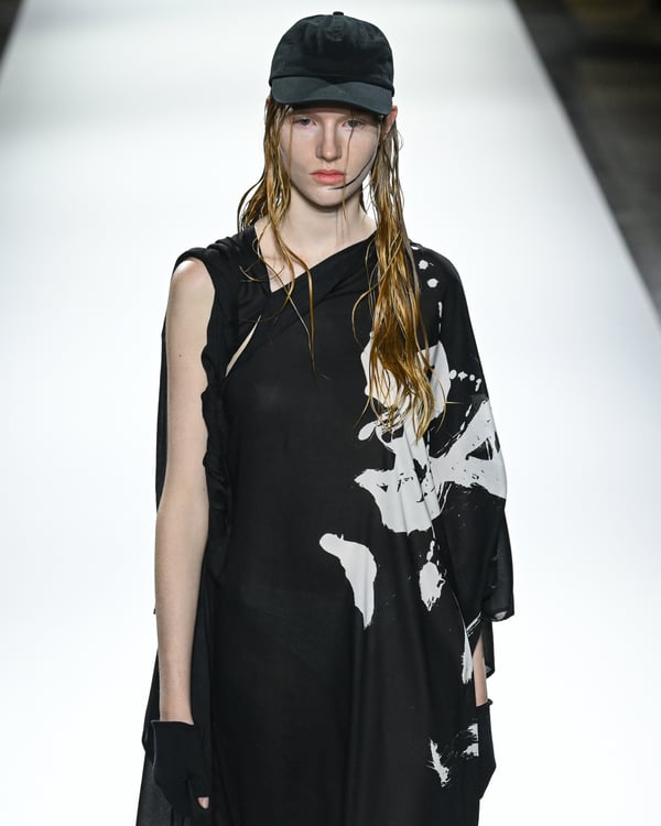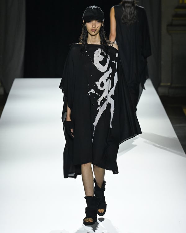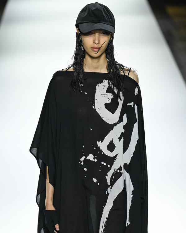 「ヨウジヤマモト(Yohji Yamamoto)」が、パリ市庁舎で2026年春夏コレクションを発表した。書道を思わせる黒地に白の大胆なプリントが施されたドレスにはじまり、織地から糸を引き抜いてフリンジ状にしたセットアップ、テキスタイルを捻ったり編み込むなどして形作ったドレスといった、彫刻的なシルエットを提案。中盤の白の3体は、透き通るほど極薄の素材を幾重にも重ねて、繊細な造形美を見せた。