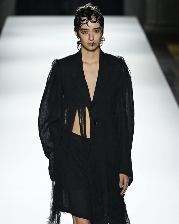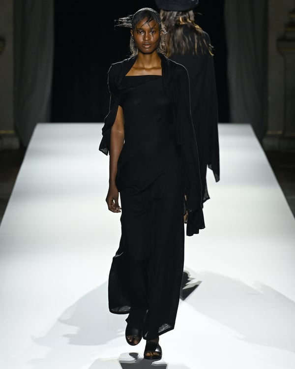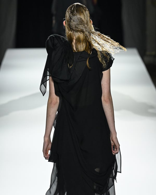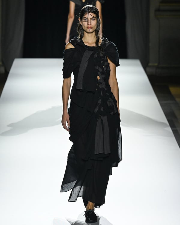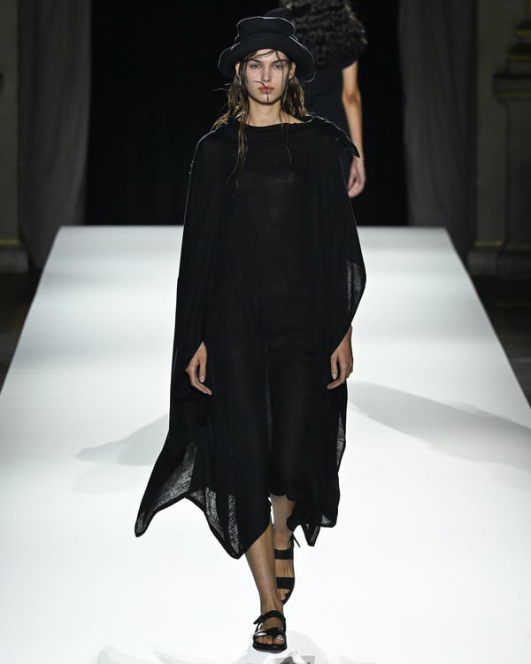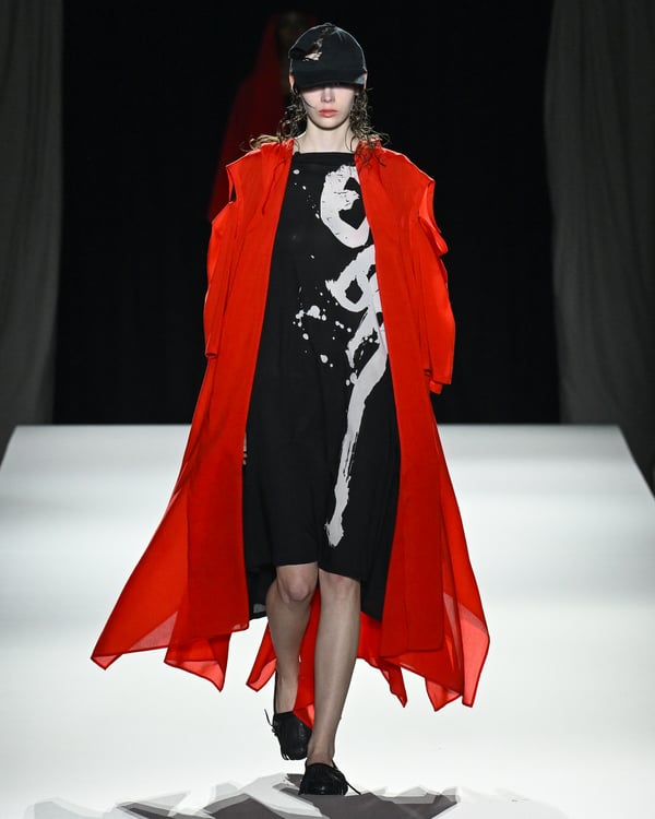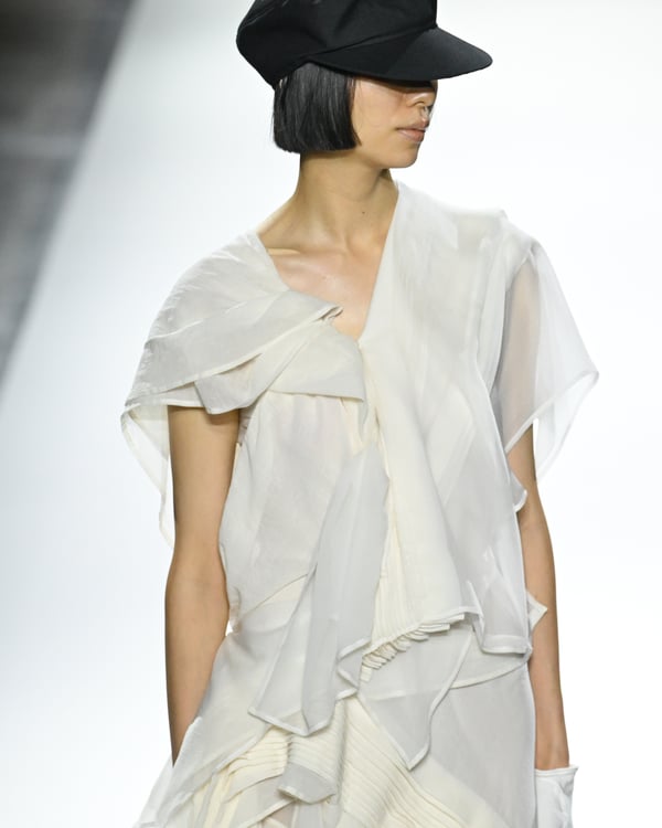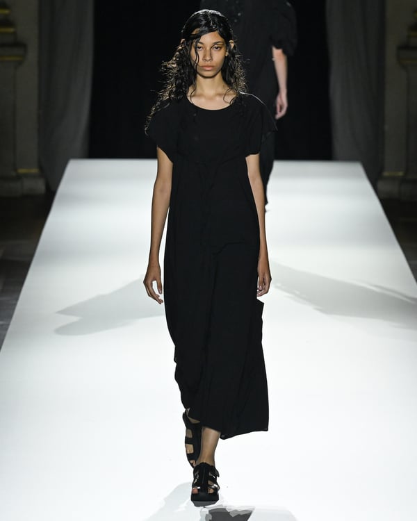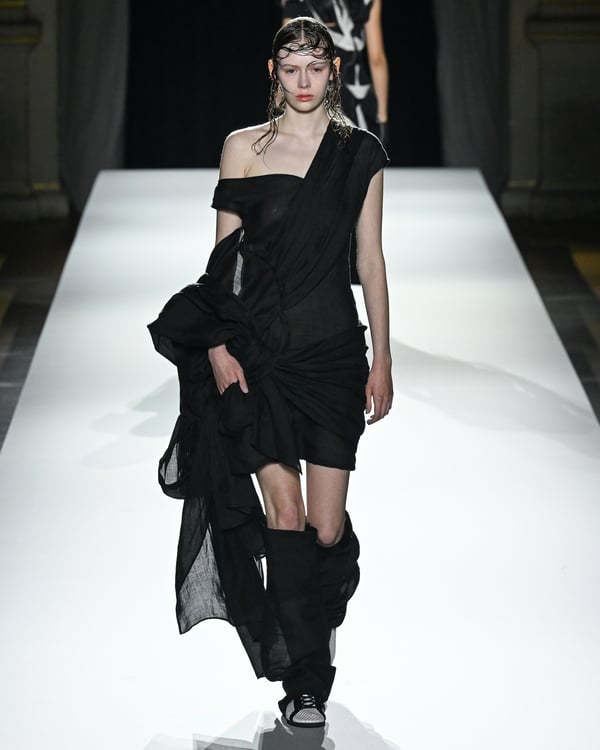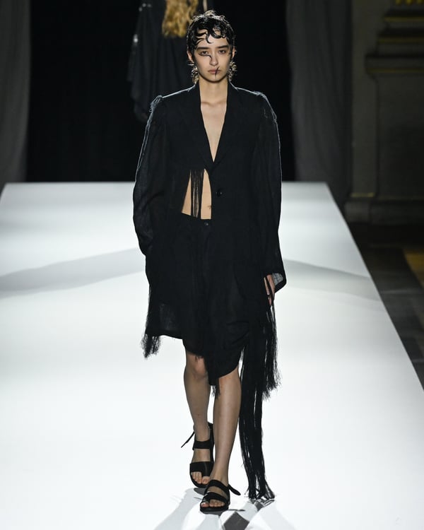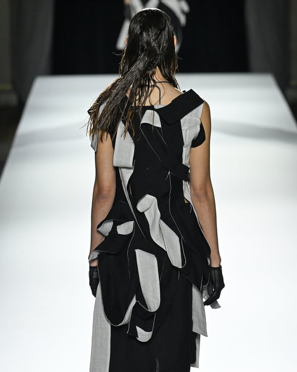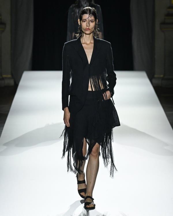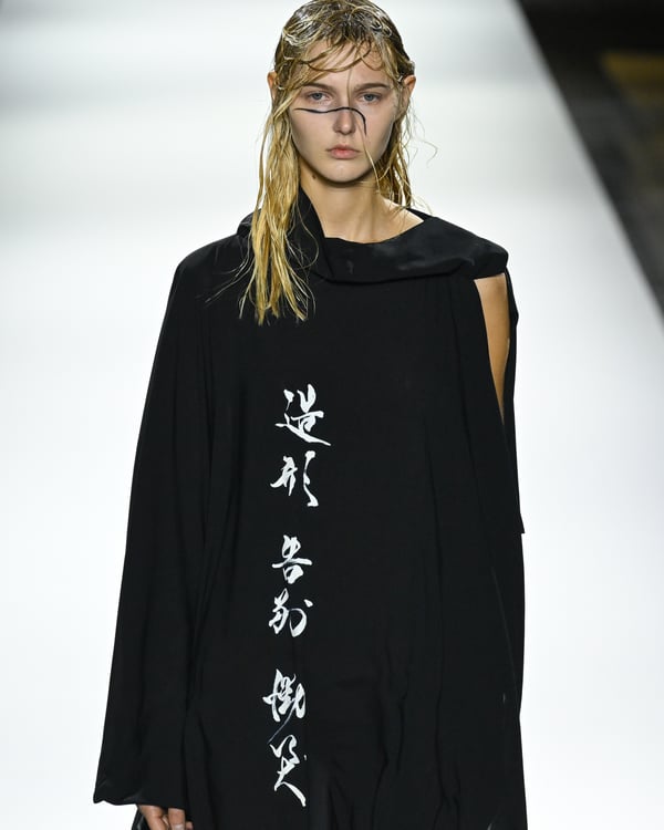 「ヨウジヤマモト(Yohji Yamamoto)」が、パリ市庁舎で2026年春夏コレクションを発表した。書道を思わせる黒地に白の大胆なプリントが施されたドレスにはじまり、織地から糸を引き抜いてフリンジ状にしたセットアップ、テキスタイルを捻ったり編み込むなどして形作ったドレスといった、彫刻的なシルエットを提案。中盤の白の3体は、透き通るほど極薄の素材を幾重にも重ねて、繊細な造形美を見せた。