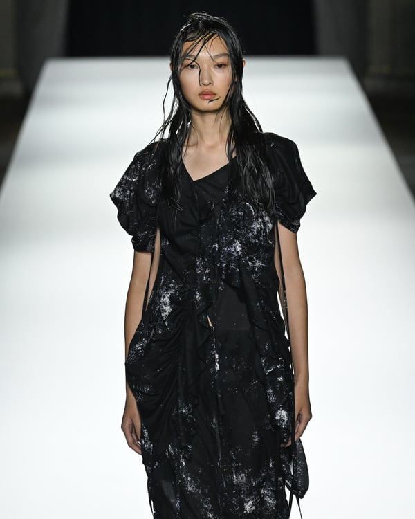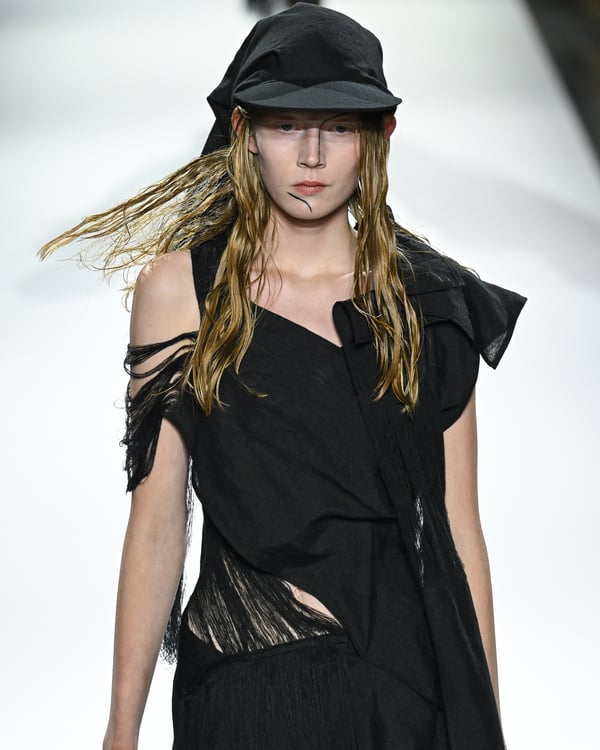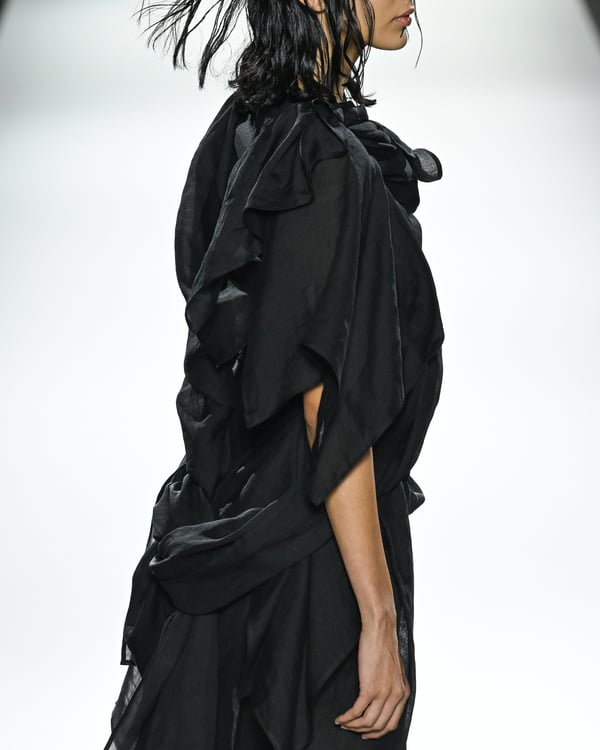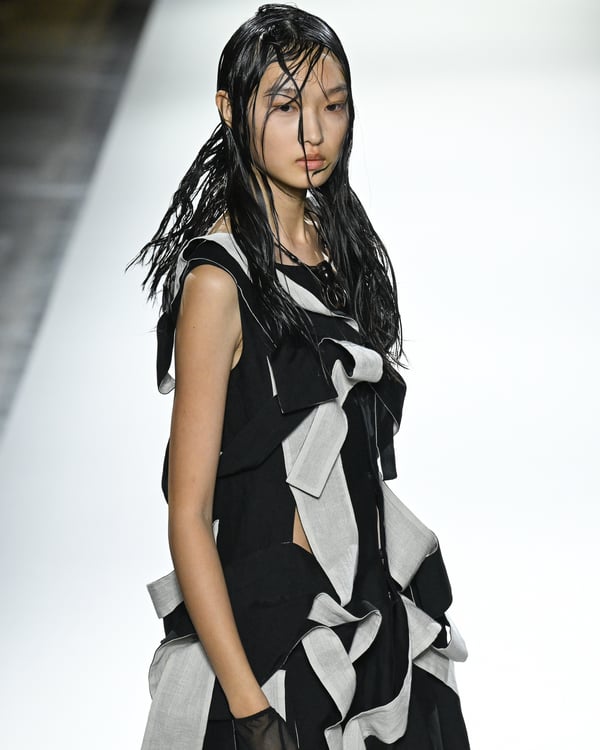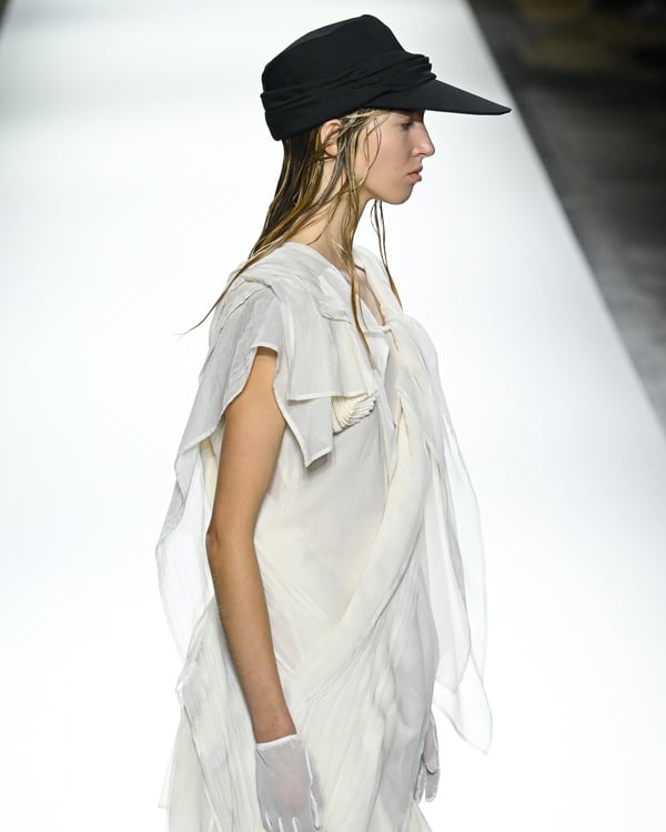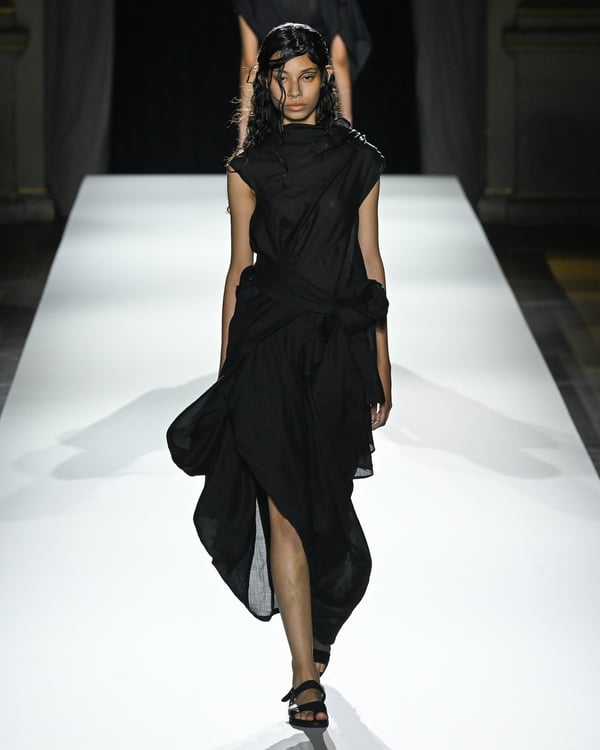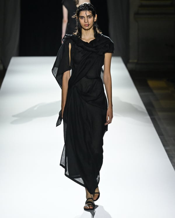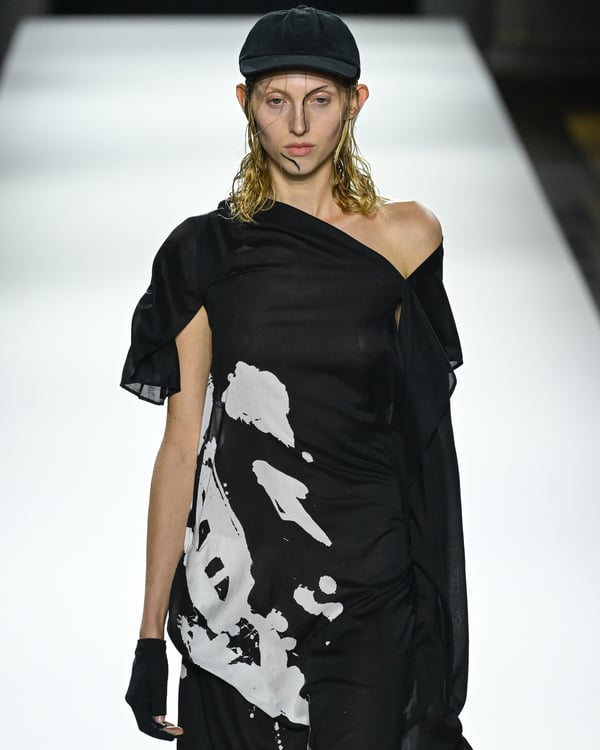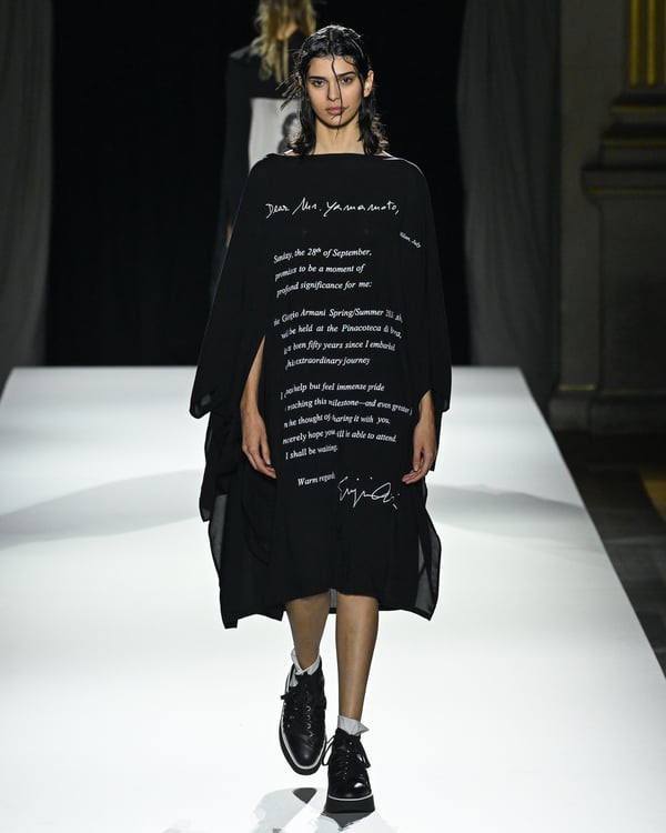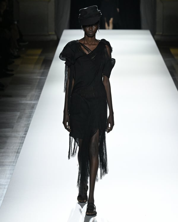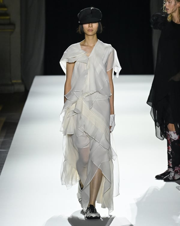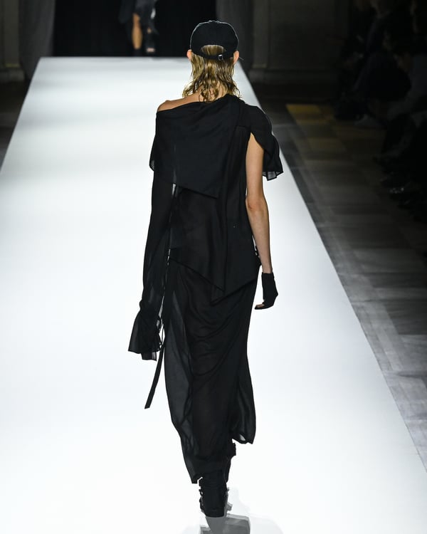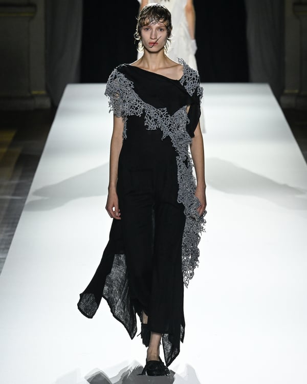 「ヨウジヤマモト(Yohji Yamamoto)」が、パリ市庁舎で2026年春夏コレクションを発表した。書道を思わせる黒地に白の大胆なプリントが施されたドレスにはじまり、織地から糸を引き抜いてフリンジ状にしたセットアップ、テキスタイルを捻ったり編み込むなどして形作ったドレスといった、彫刻的なシルエットを提案。中盤の白の3体は、透き通るほど極薄の素材を幾重にも重ねて、繊細な造形美を見せた。