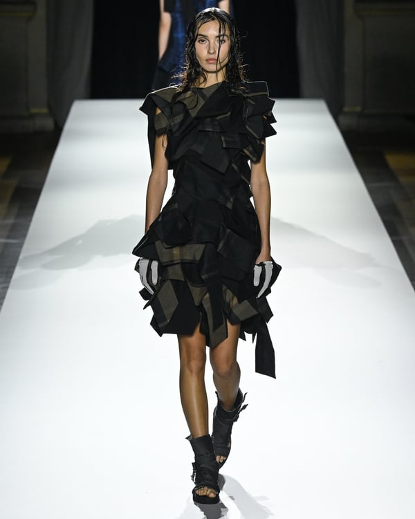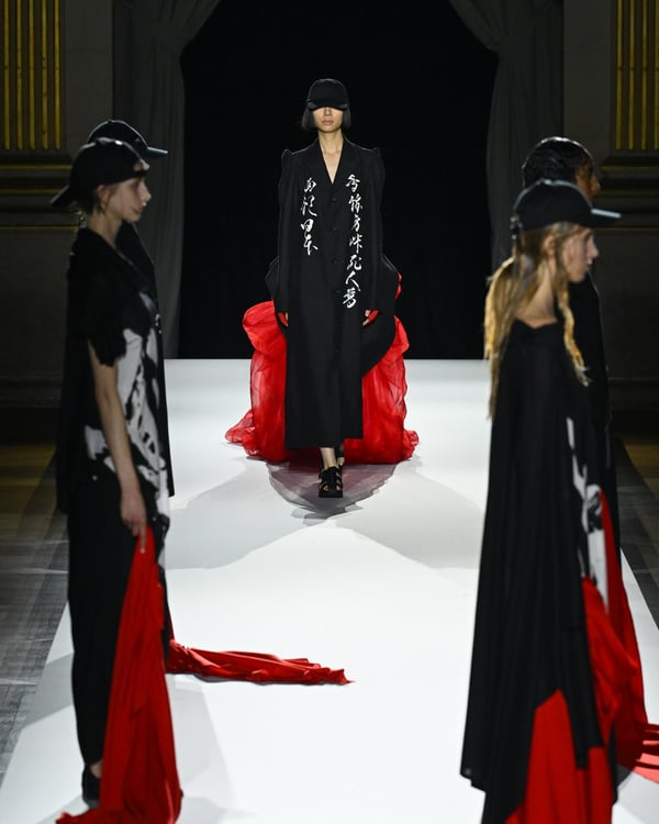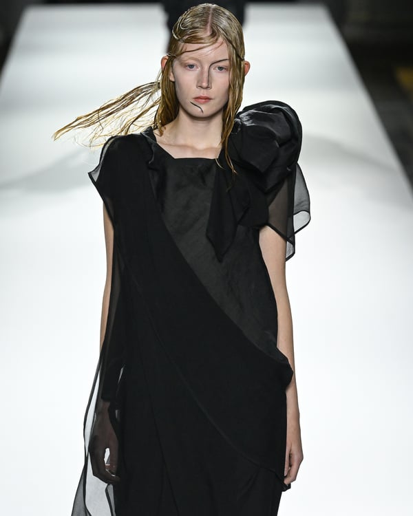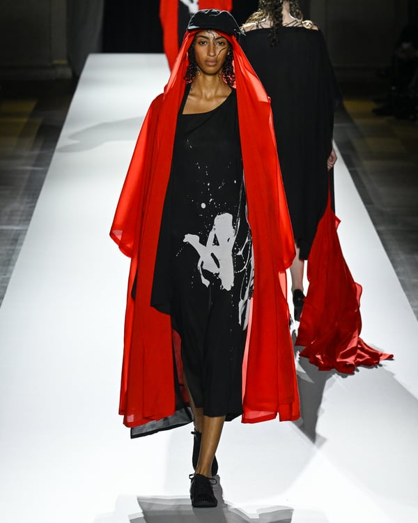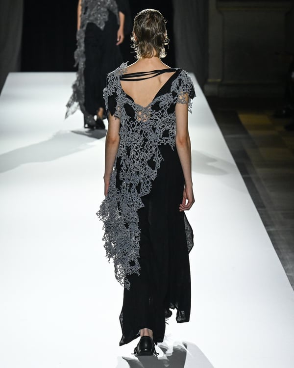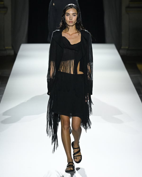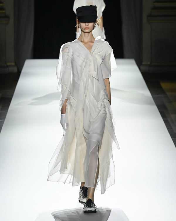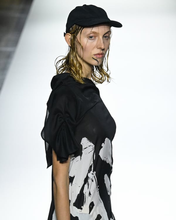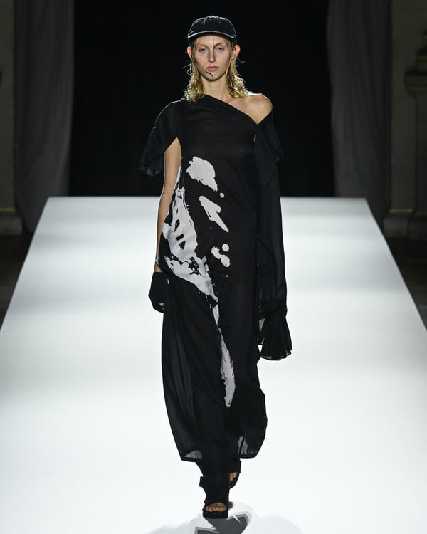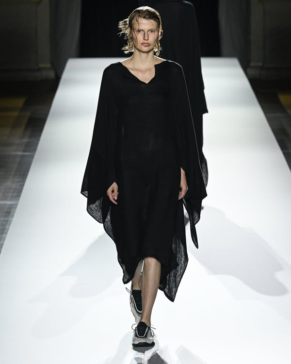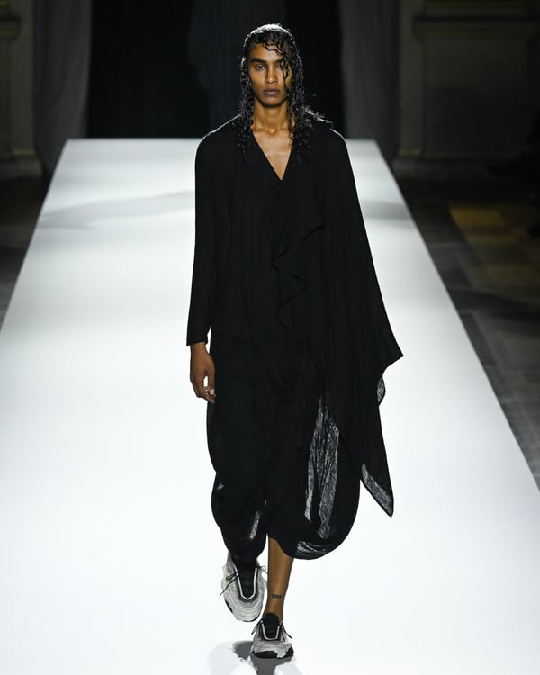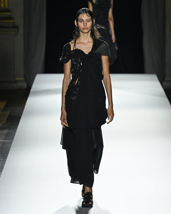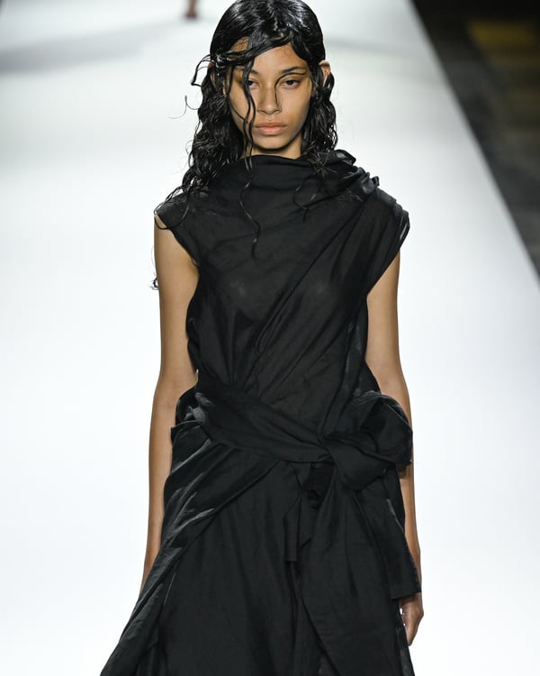 「ヨウジヤマモト(Yohji Yamamoto)」が、パリ市庁舎で2026年春夏コレクションを発表した。書道を思わせる黒地に白の大胆なプリントが施されたドレスにはじまり、織地から糸を引き抜いてフリンジ状にしたセットアップ、テキスタイルを捻ったり編み込むなどして形作ったドレスといった、彫刻的なシルエットを提案。中盤の白の3体は、透き通るほど極薄の素材を幾重にも重ねて、繊細な造形美を見せた。