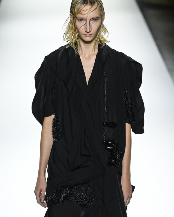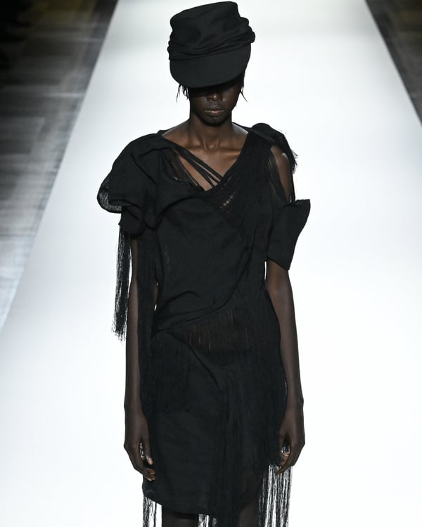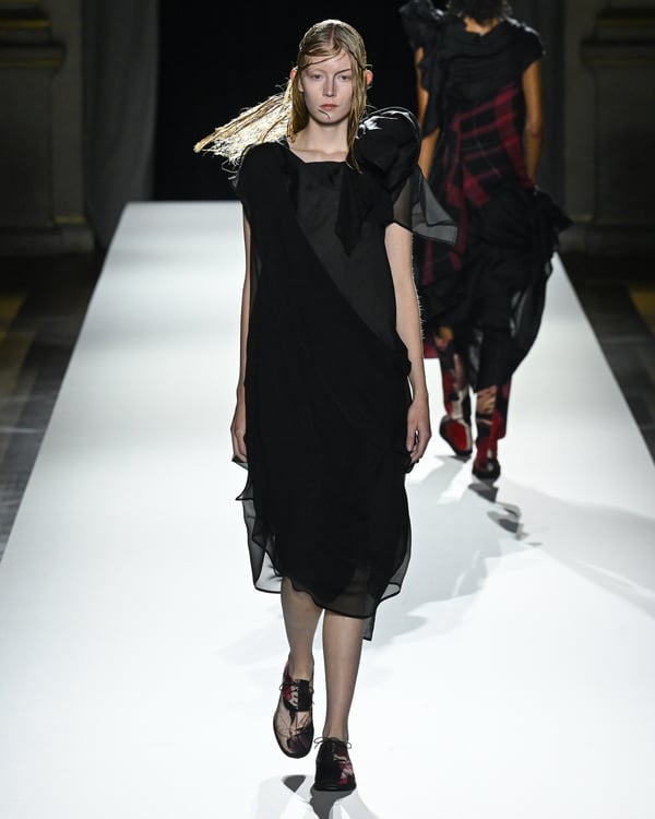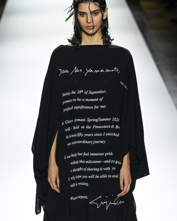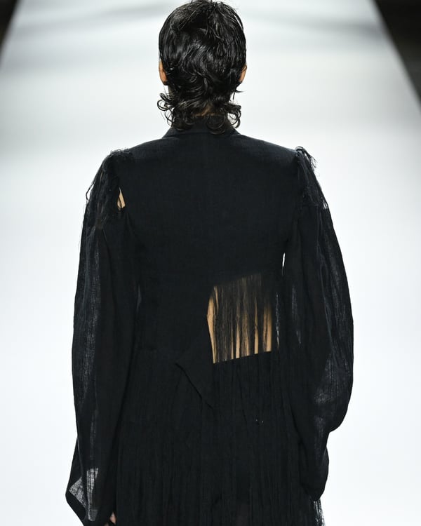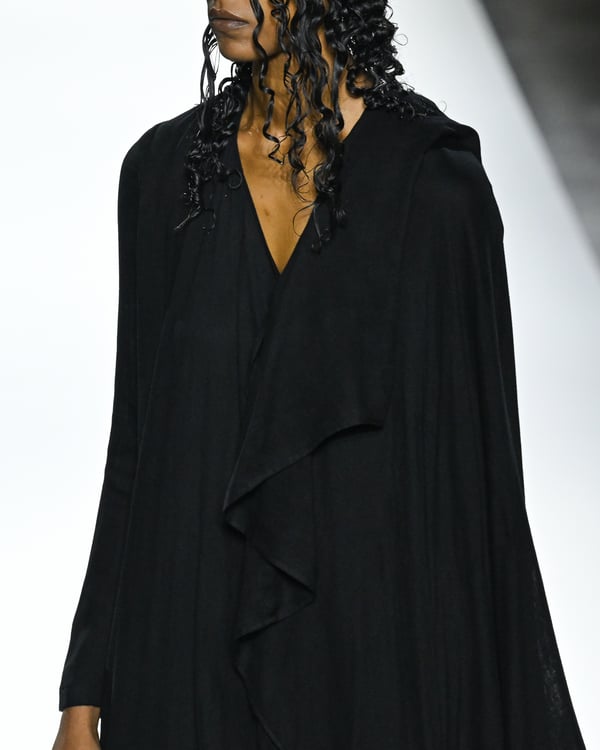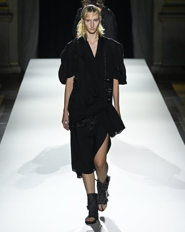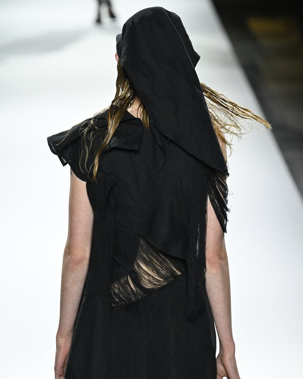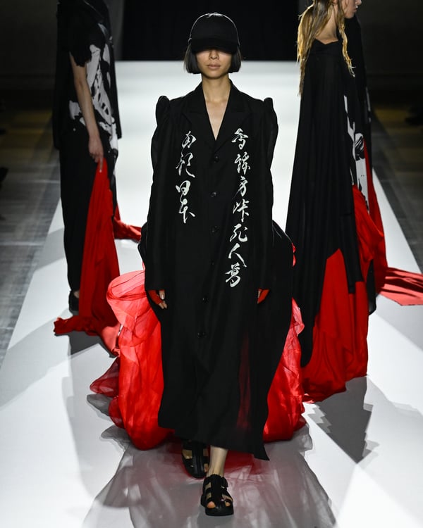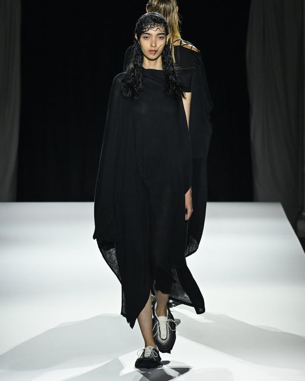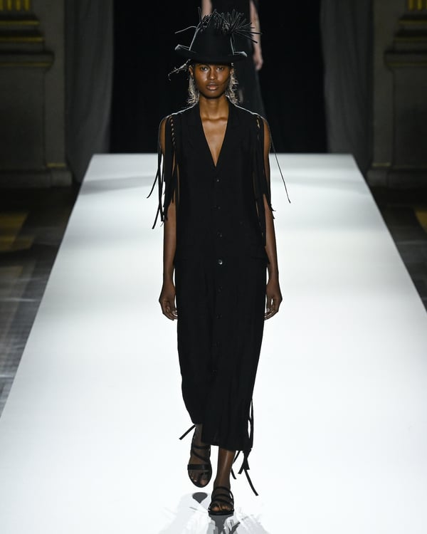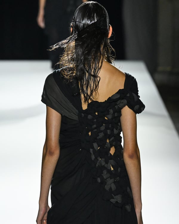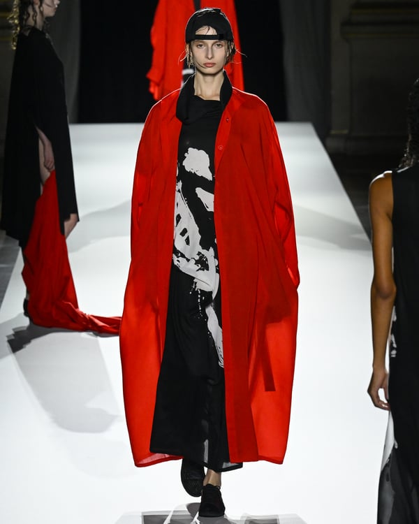 「ヨウジヤマモト(Yohji Yamamoto)」が、パリ市庁舎で2026年春夏コレクションを発表した。書道を思わせる黒地に白の大胆なプリントが施されたドレスにはじまり、織地から糸を引き抜いてフリンジ状にしたセットアップ、テキスタイルを捻ったり編み込むなどして形作ったドレスといった、彫刻的なシルエットを提案。中盤の白の3体は、透き通るほど極薄の素材を幾重にも重ねて、繊細な造形美を見せた。