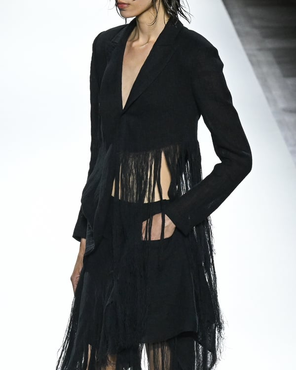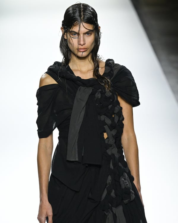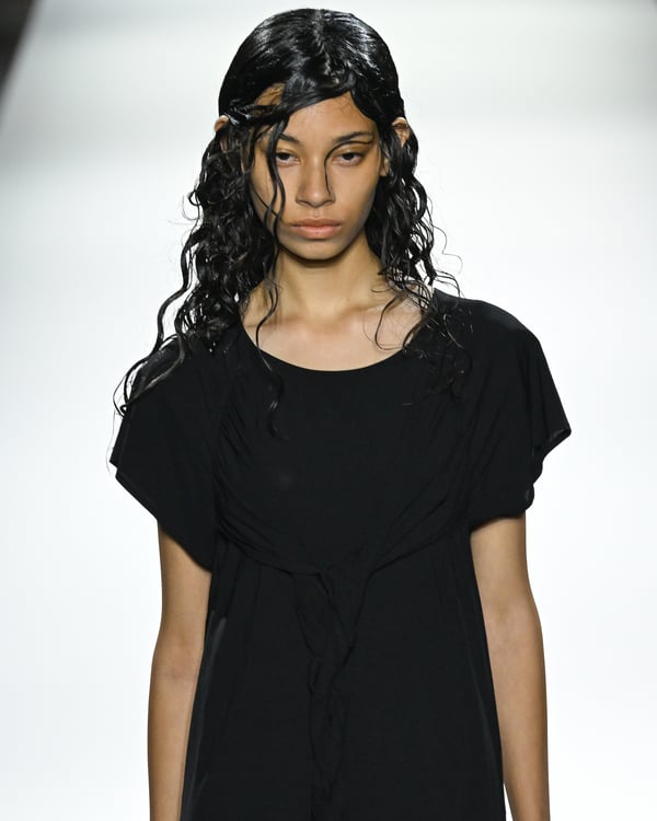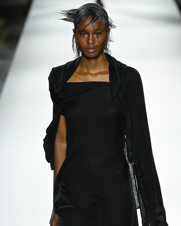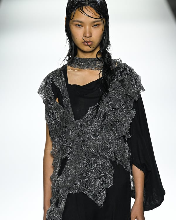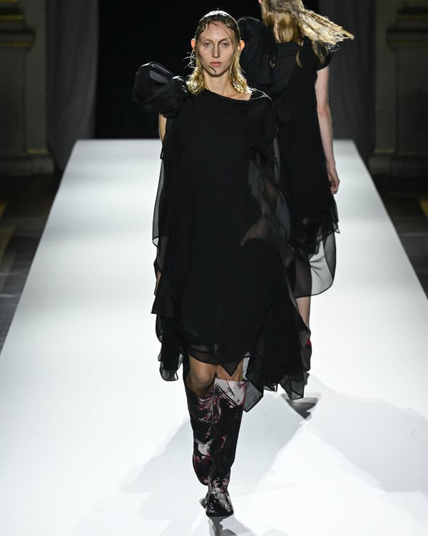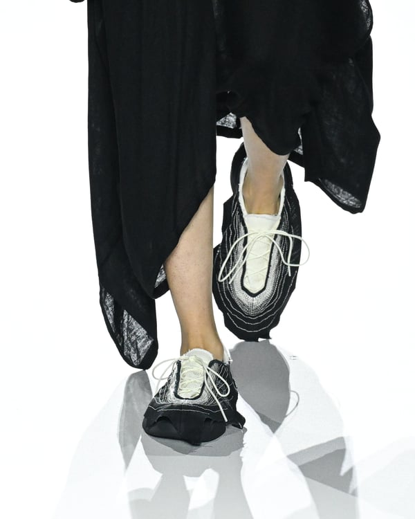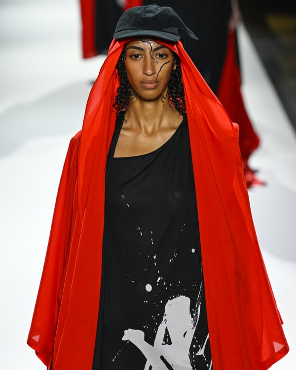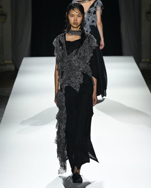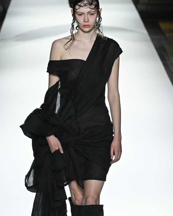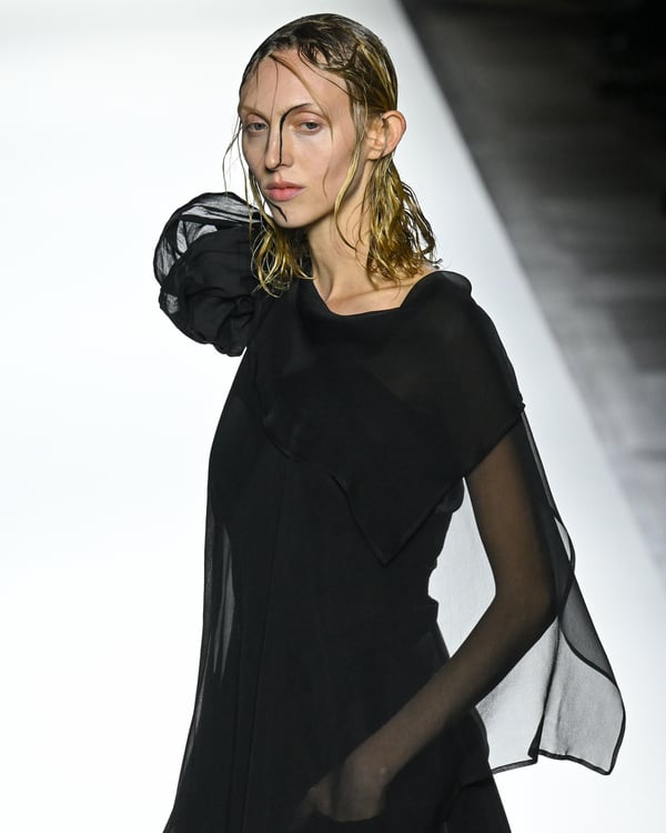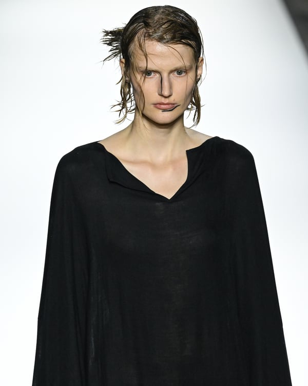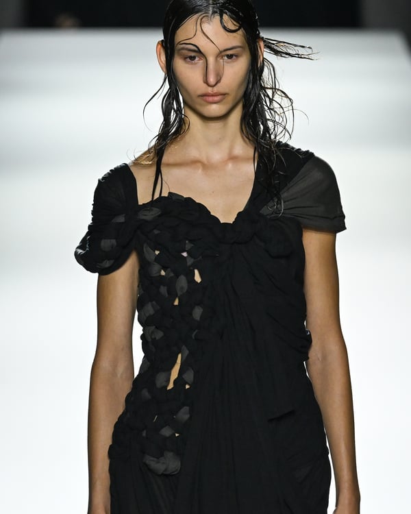「ヨウジヤマモト(Yohji Yamamoto)」が、パリ市庁舎で2026年春夏コレクションを発表した。書道を思わせる黒地に白の大胆なプリントが施されたドレスにはじまり、織地から糸を引き抜いてフリンジ状にしたセットアップ、テキスタイルを捻ったり編み込むなどして形作ったドレスといった、彫刻的なシルエットを提案。中盤の白の3体は、透き通るほど極薄の素材を幾重にも重ねて、繊細な造形美を見せた。