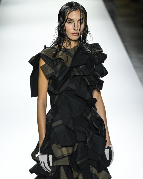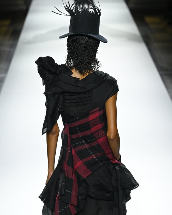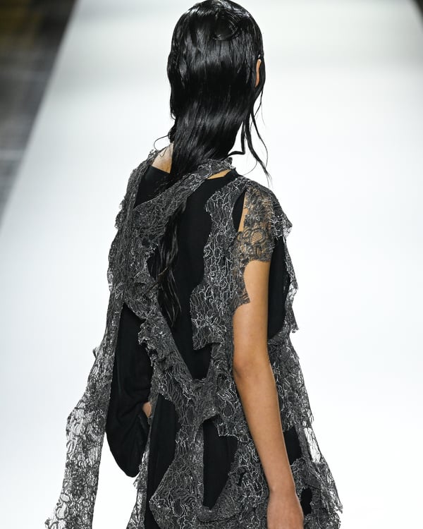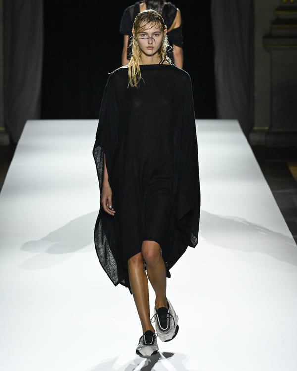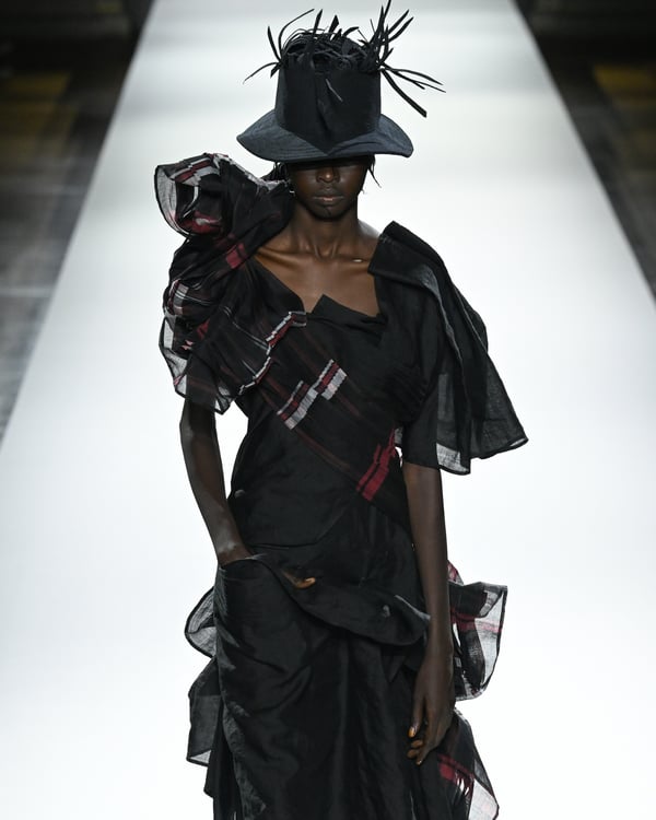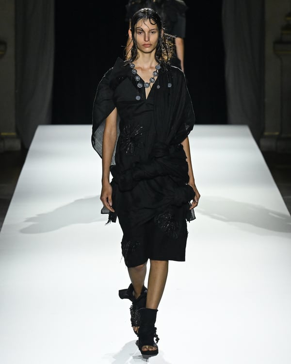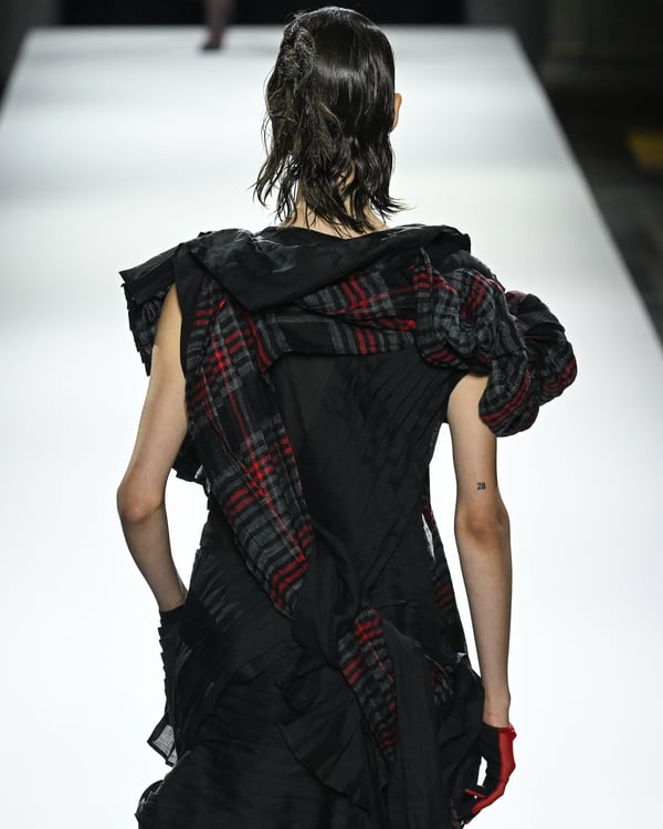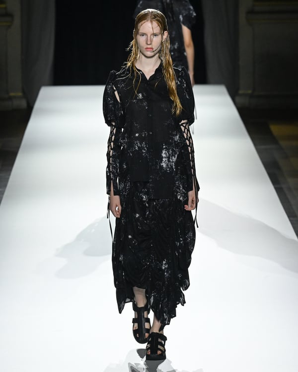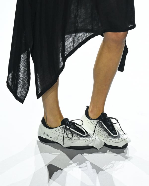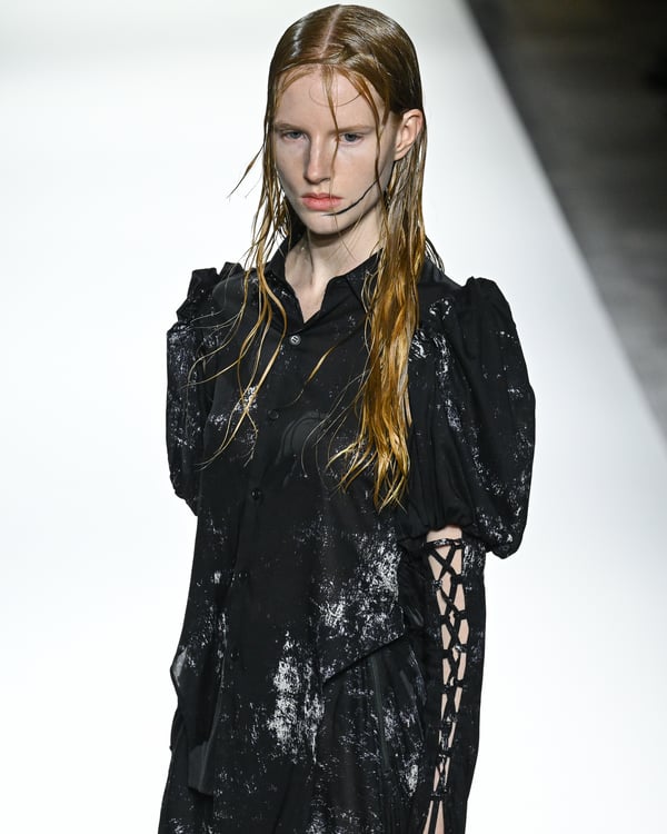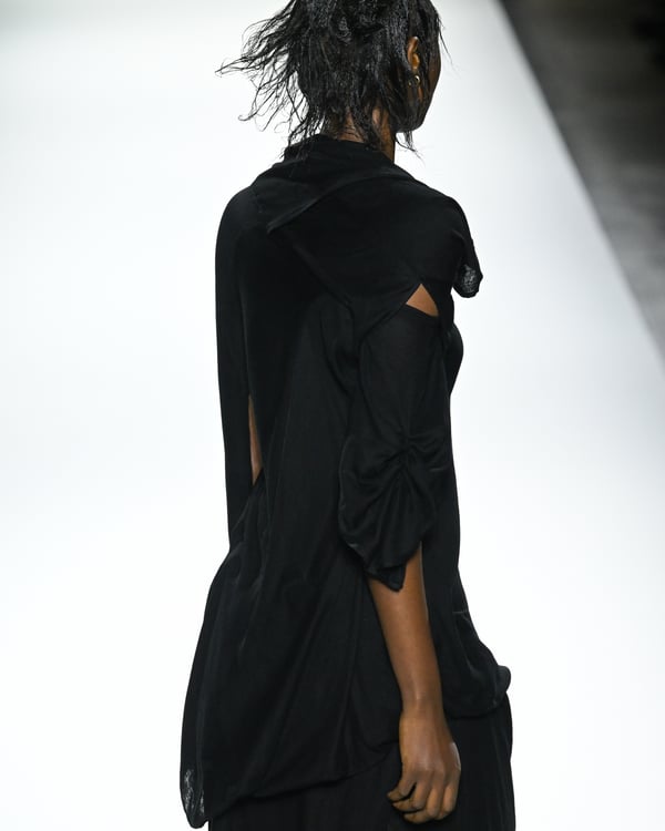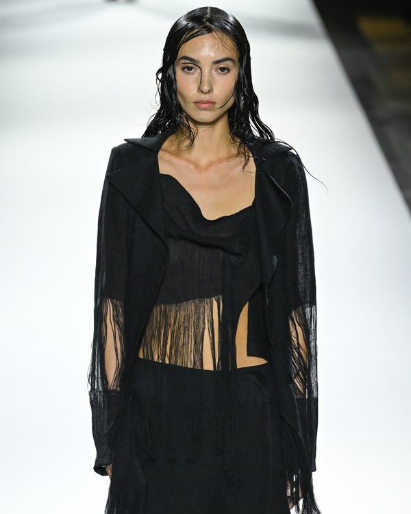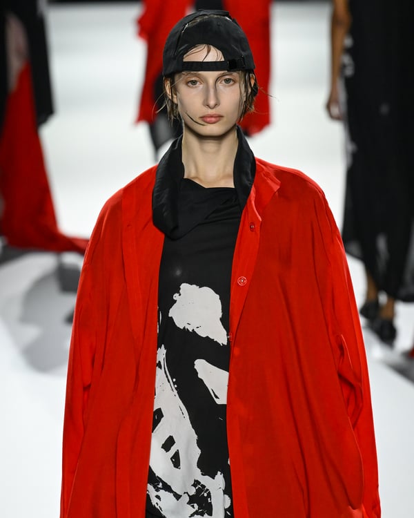 「ヨウジヤマモト(Yohji Yamamoto)」が、パリ市庁舎で2026年春夏コレクションを発表した。書道を思わせる黒地に白の大胆なプリントが施されたドレスにはじまり、織地から糸を引き抜いてフリンジ状にしたセットアップ、テキスタイルを捻ったり編み込むなどして形作ったドレスといった、彫刻的なシルエットを提案。中盤の白の3体は、透き通るほど極薄の素材を幾重にも重ねて、繊細な造形美を見せた。