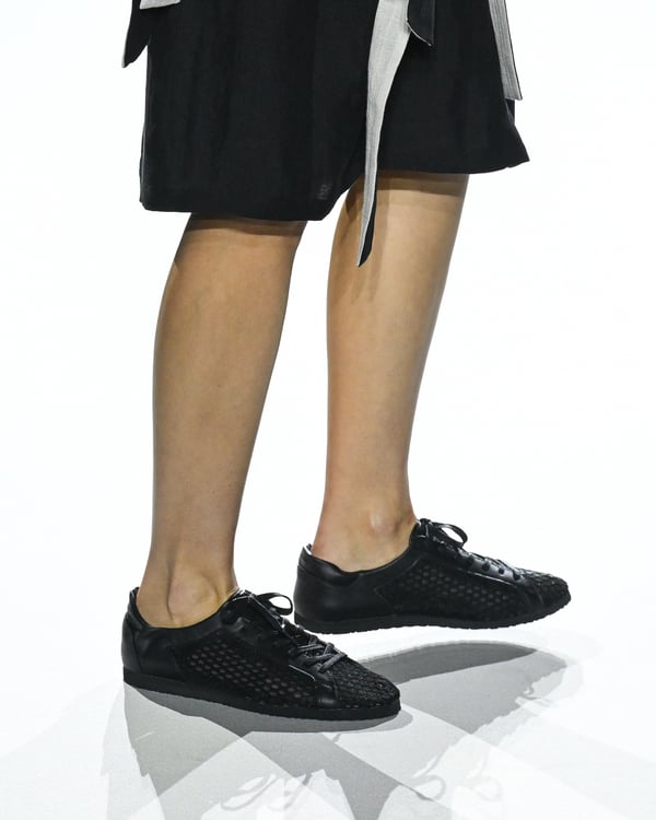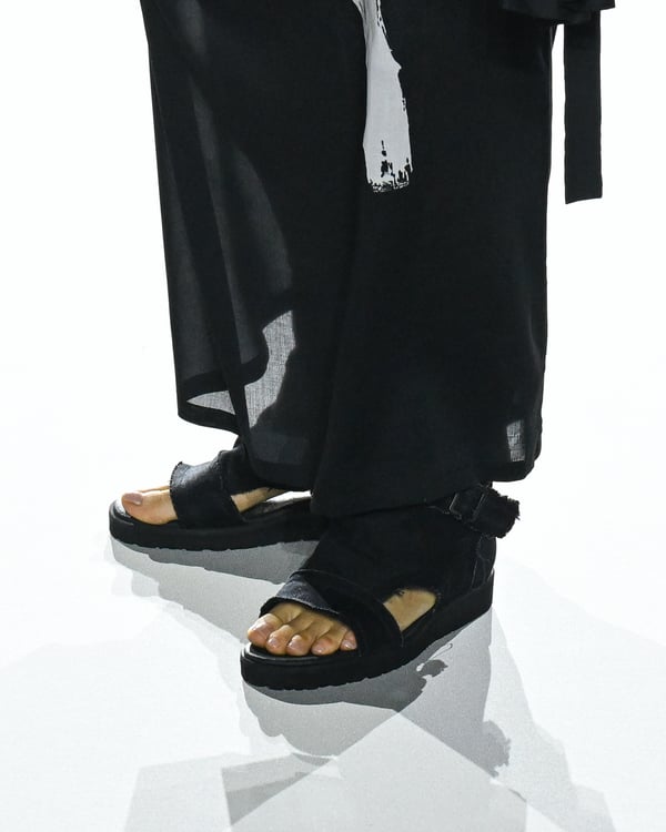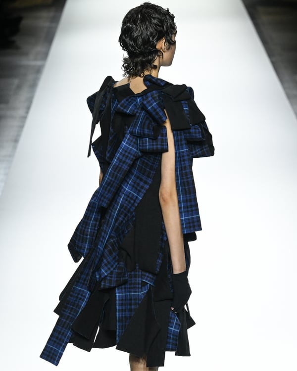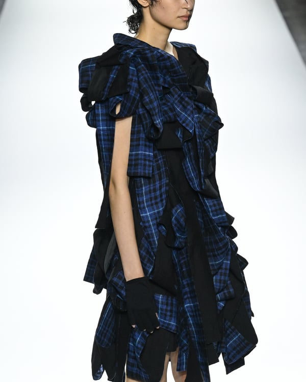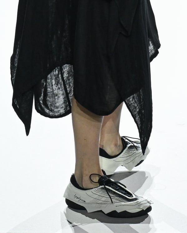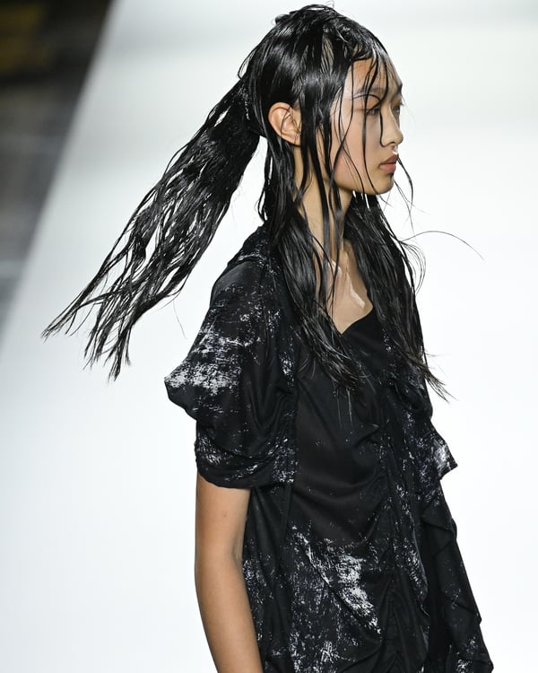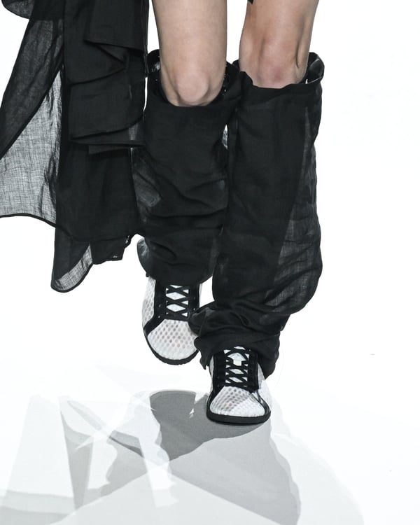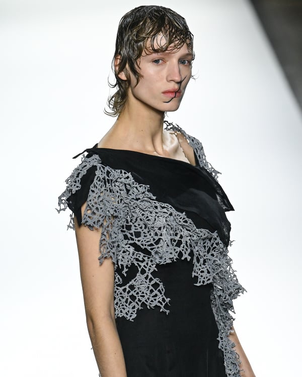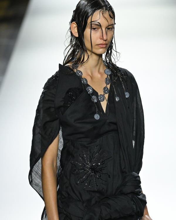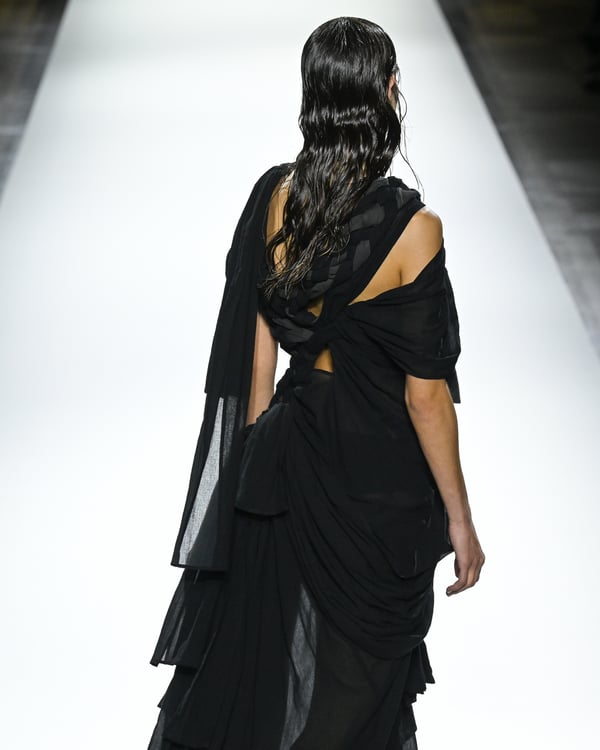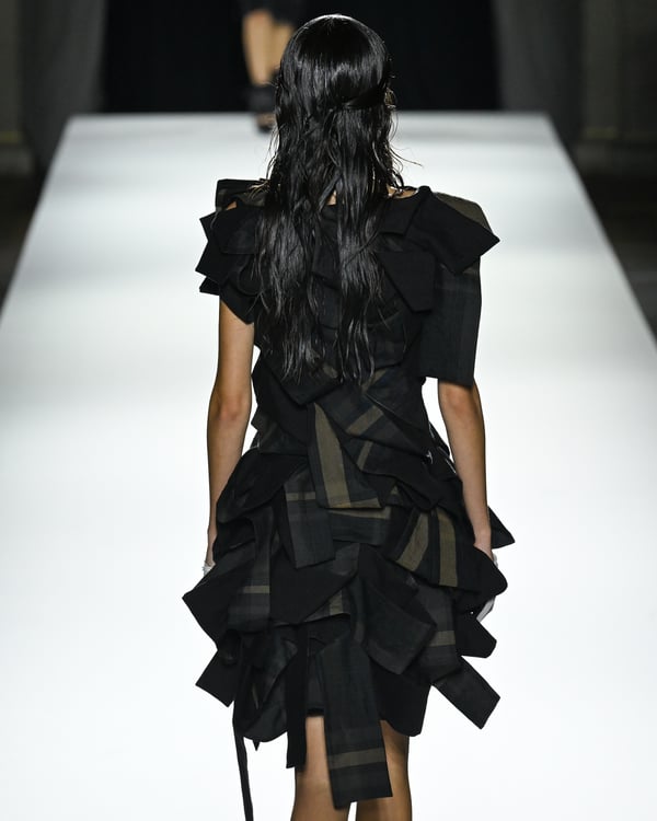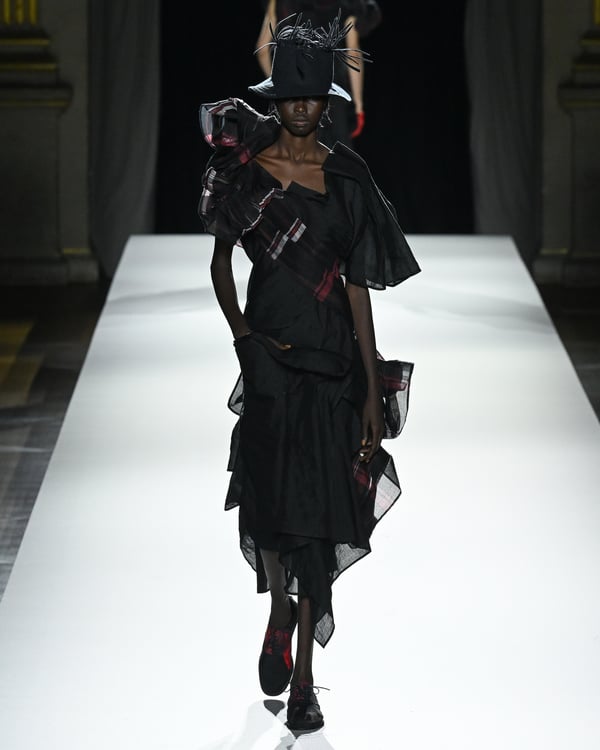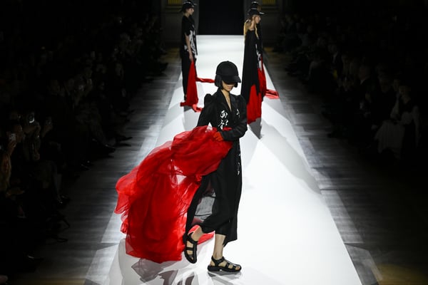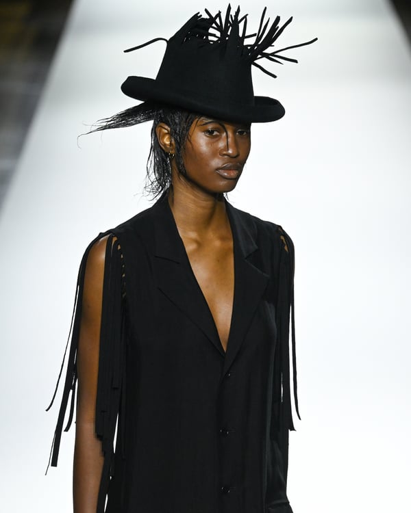 「ヨウジヤマモト(Yohji Yamamoto)」が、パリ市庁舎で2026年春夏コレクションを発表した。書道を思わせる黒地に白の大胆なプリントが施されたドレスにはじまり、織地から糸を引き抜いてフリンジ状にしたセットアップ、テキスタイルを捻ったり編み込むなどして形作ったドレスといった、彫刻的なシルエットを提案。中盤の白の3体は、透き通るほど極薄の素材を幾重にも重ねて、繊細な造形美を見せた。