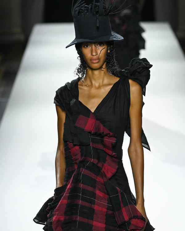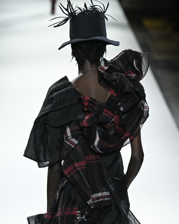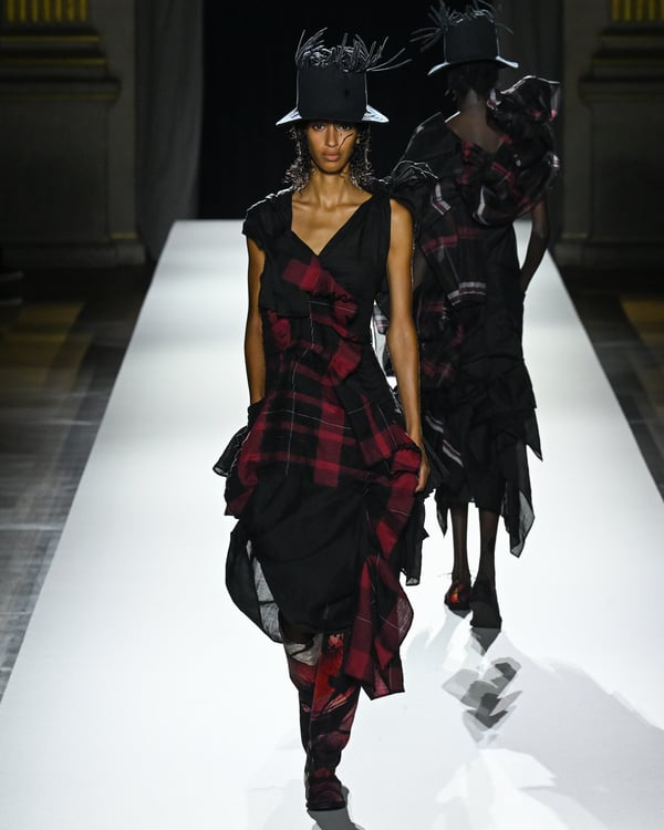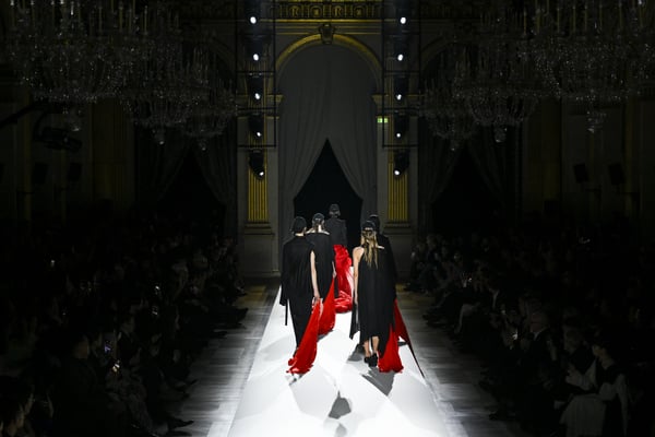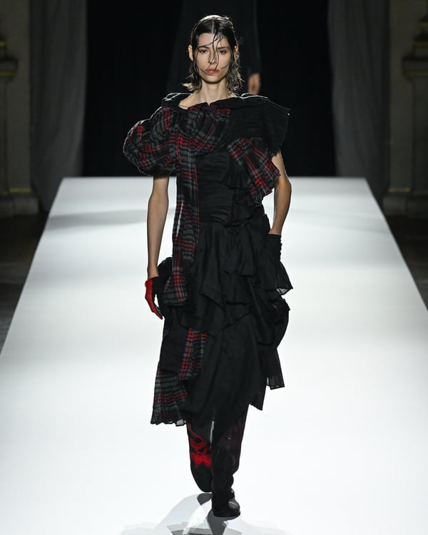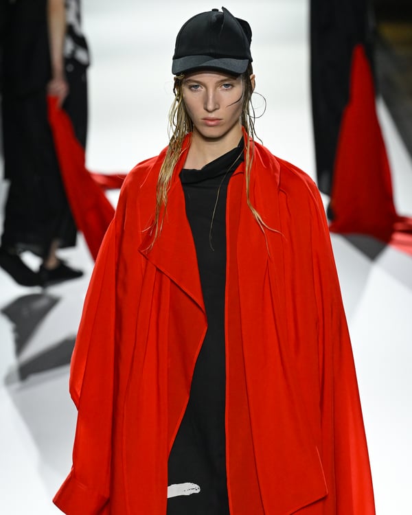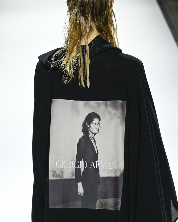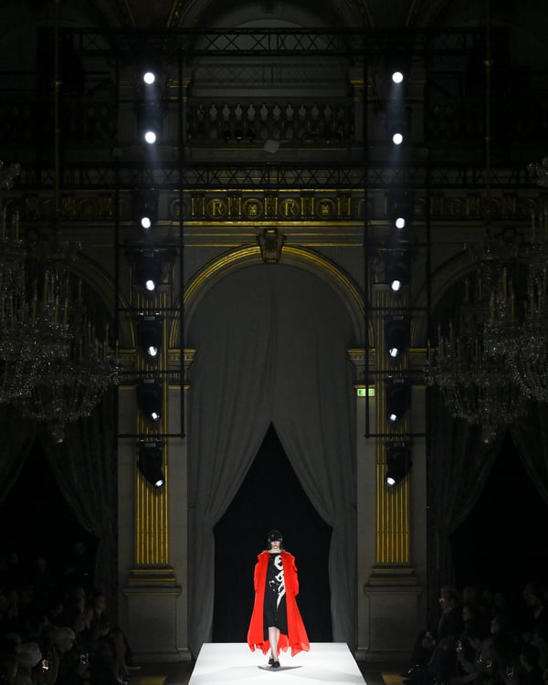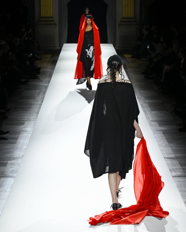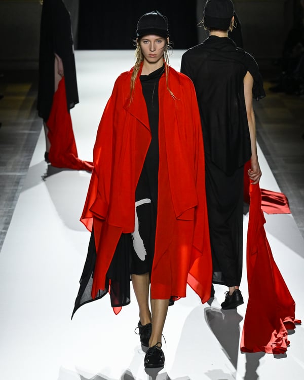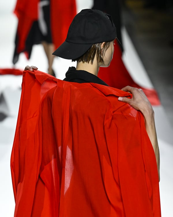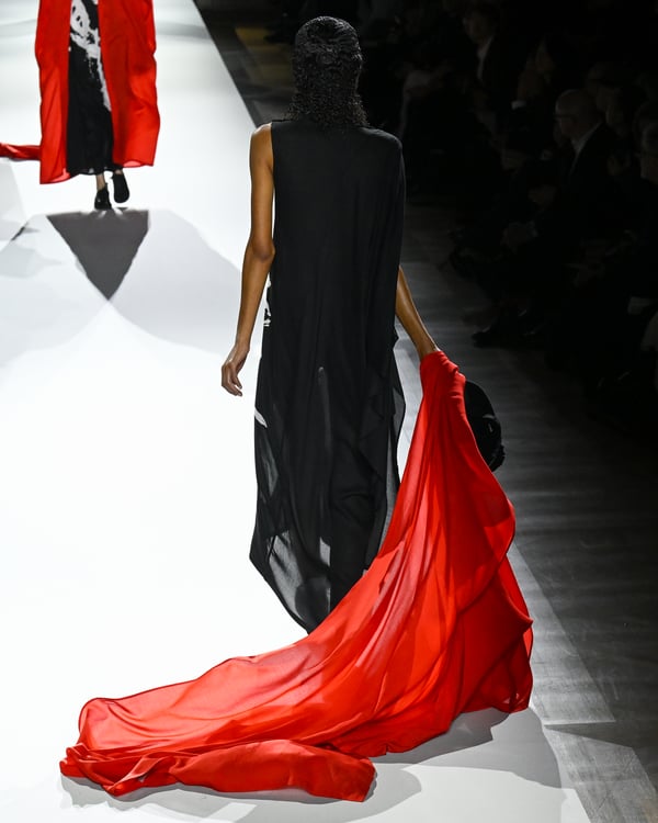 途中、故ジョルジオ・アルマーニ(Giorgio Armani)を追悼する2体のドレスが登場。ラストは真紅のコートが鮮やかにランウェイを彩った。