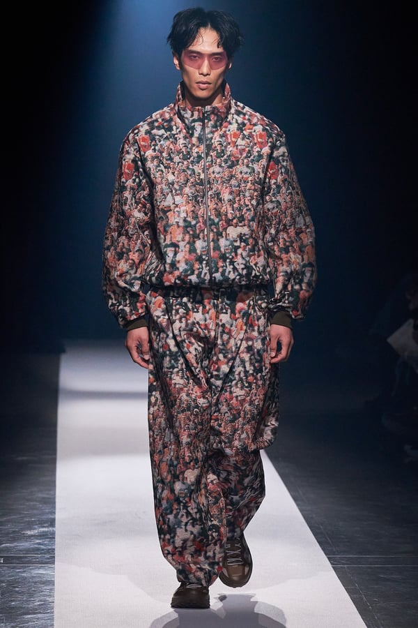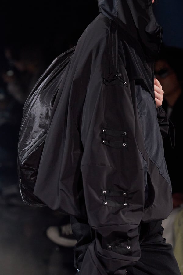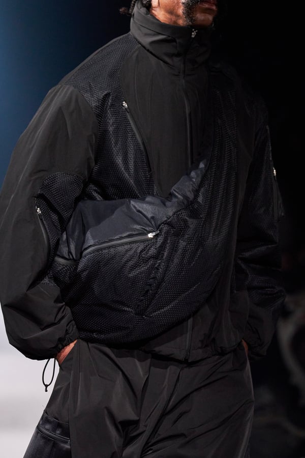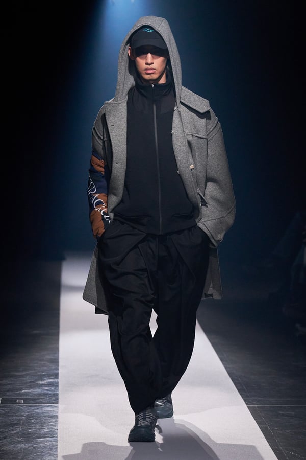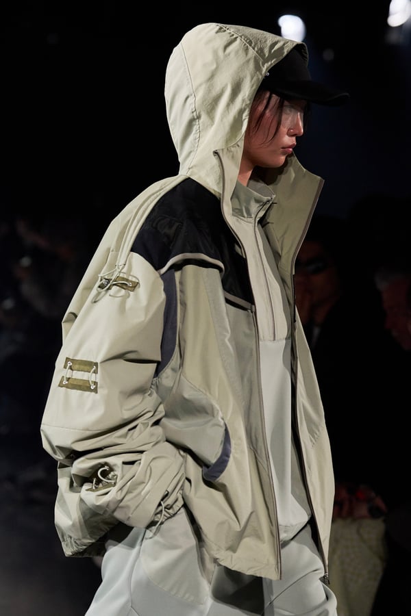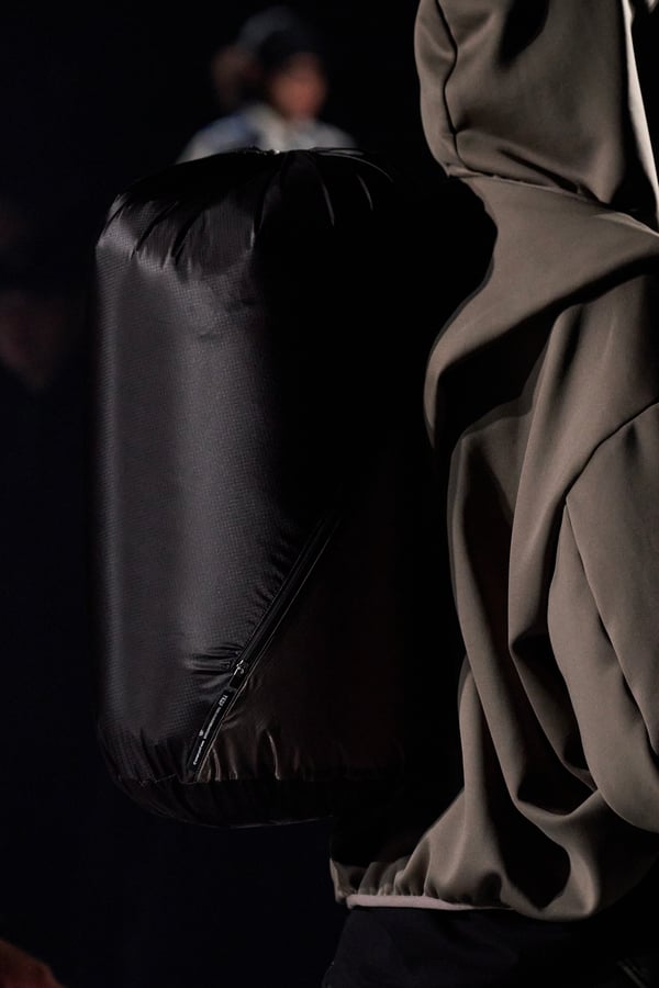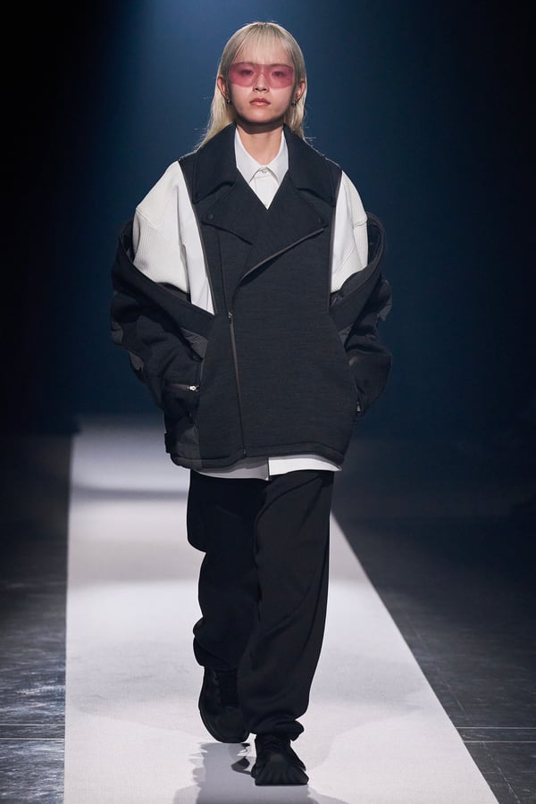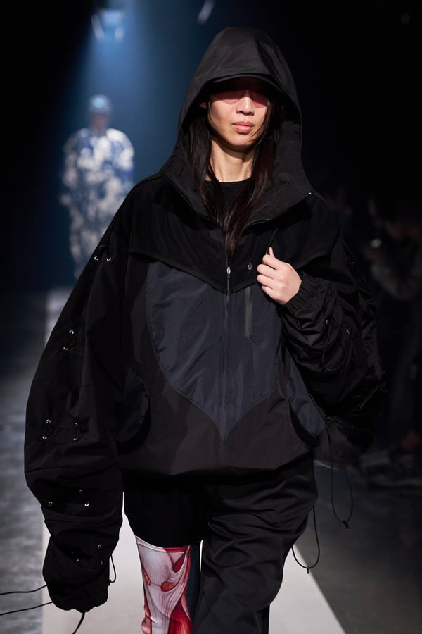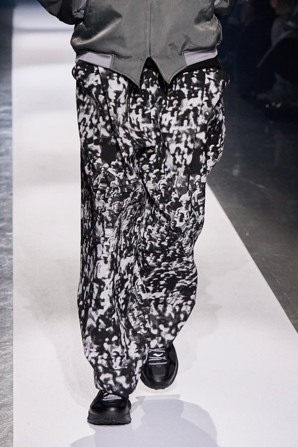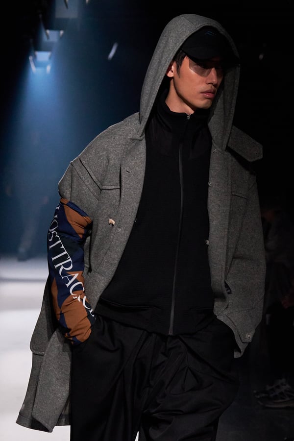 ファーストルックは、マラソンの風景を捉えた写真を全面にプリントしたセットアップが登場。腕ぐり付近をベンチレーションように開閉できる2wayのライダースジャケットや、ダッフルコートにテクニカルなナイロンジャケットを重ねたスタイリングによって、日常とランニングを地続きに見せた。