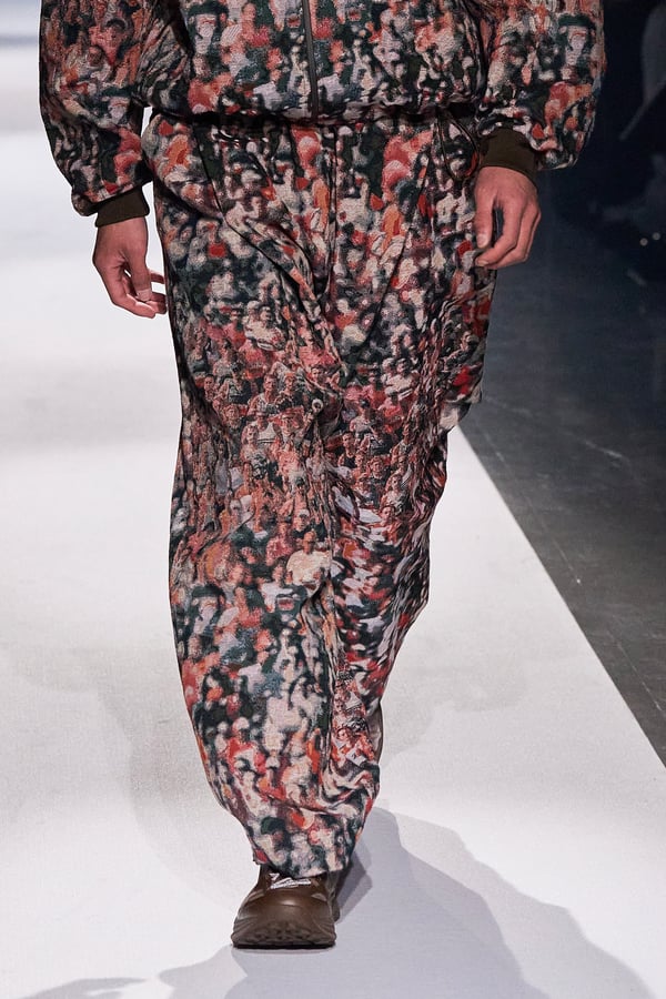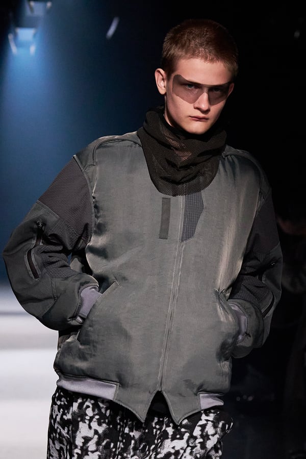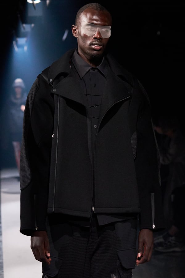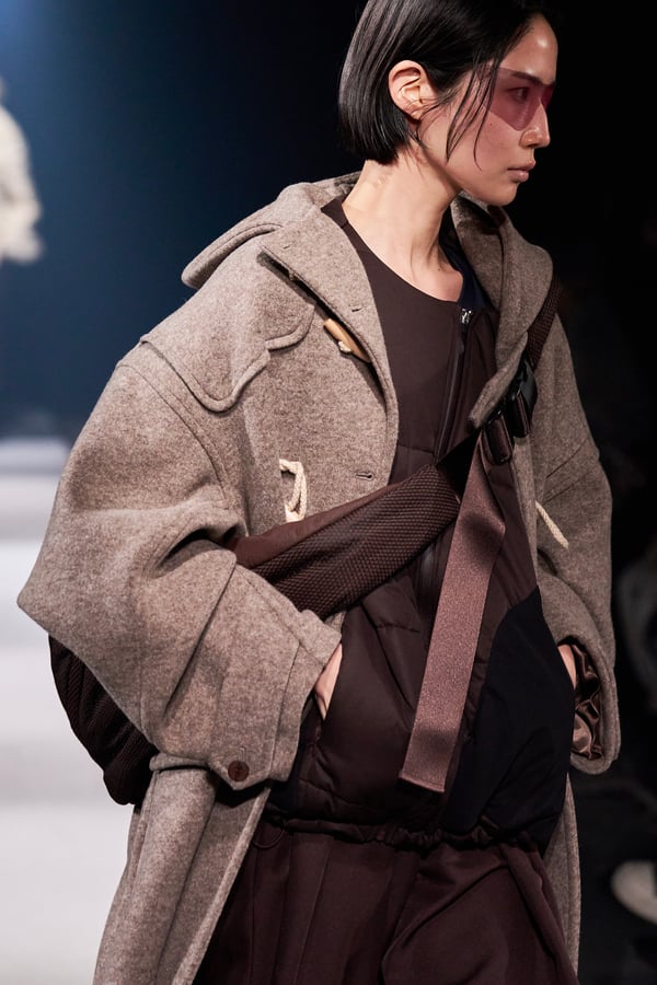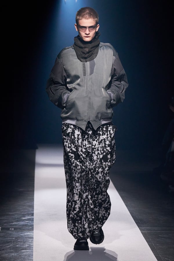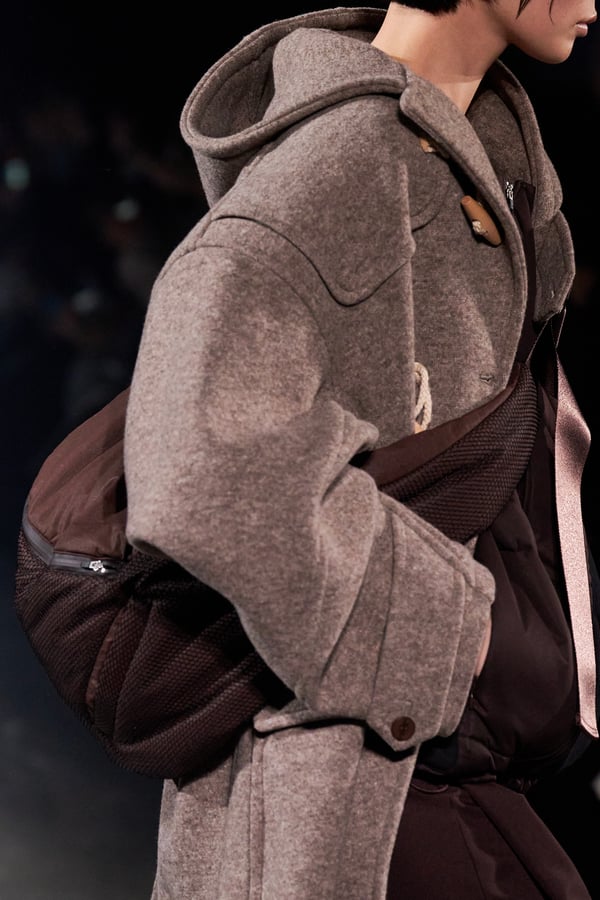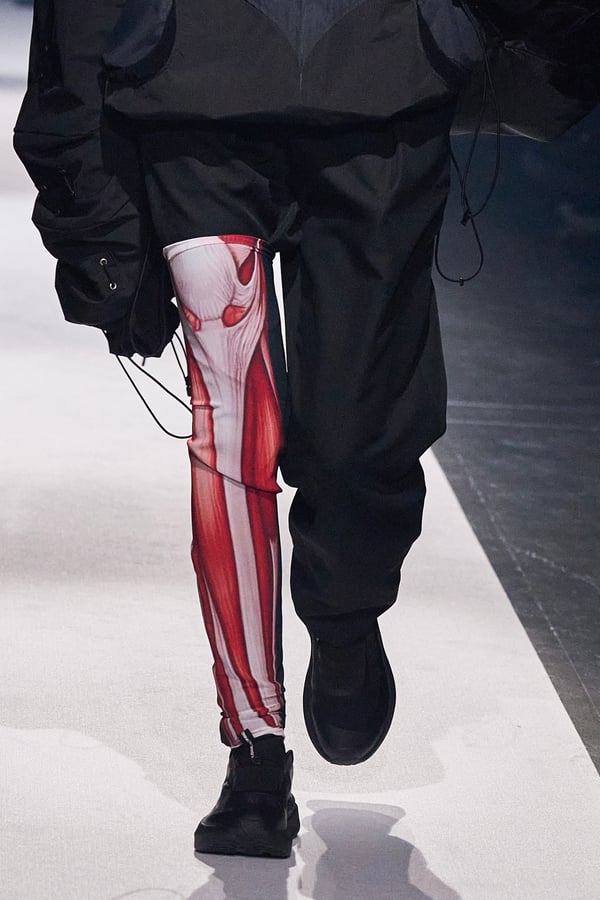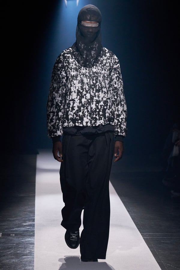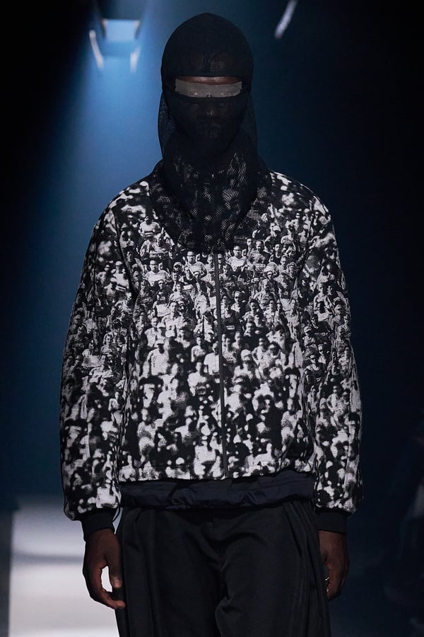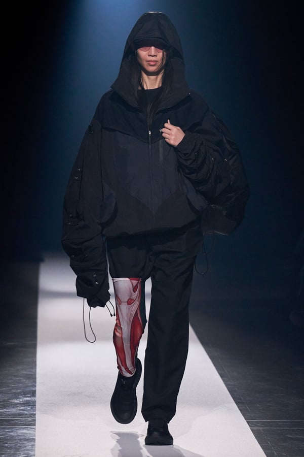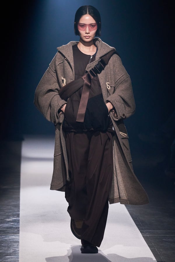 ファーストルックは、マラソンの風景を捉えた写真を全面にプリントしたセットアップが登場。腕ぐり付近をベンチレーションように開閉できる2wayのライダースジャケットや、ダッフルコートにテクニカルなナイロンジャケットを重ねたスタイリングによって、日常とランニングを地続きに見せた。