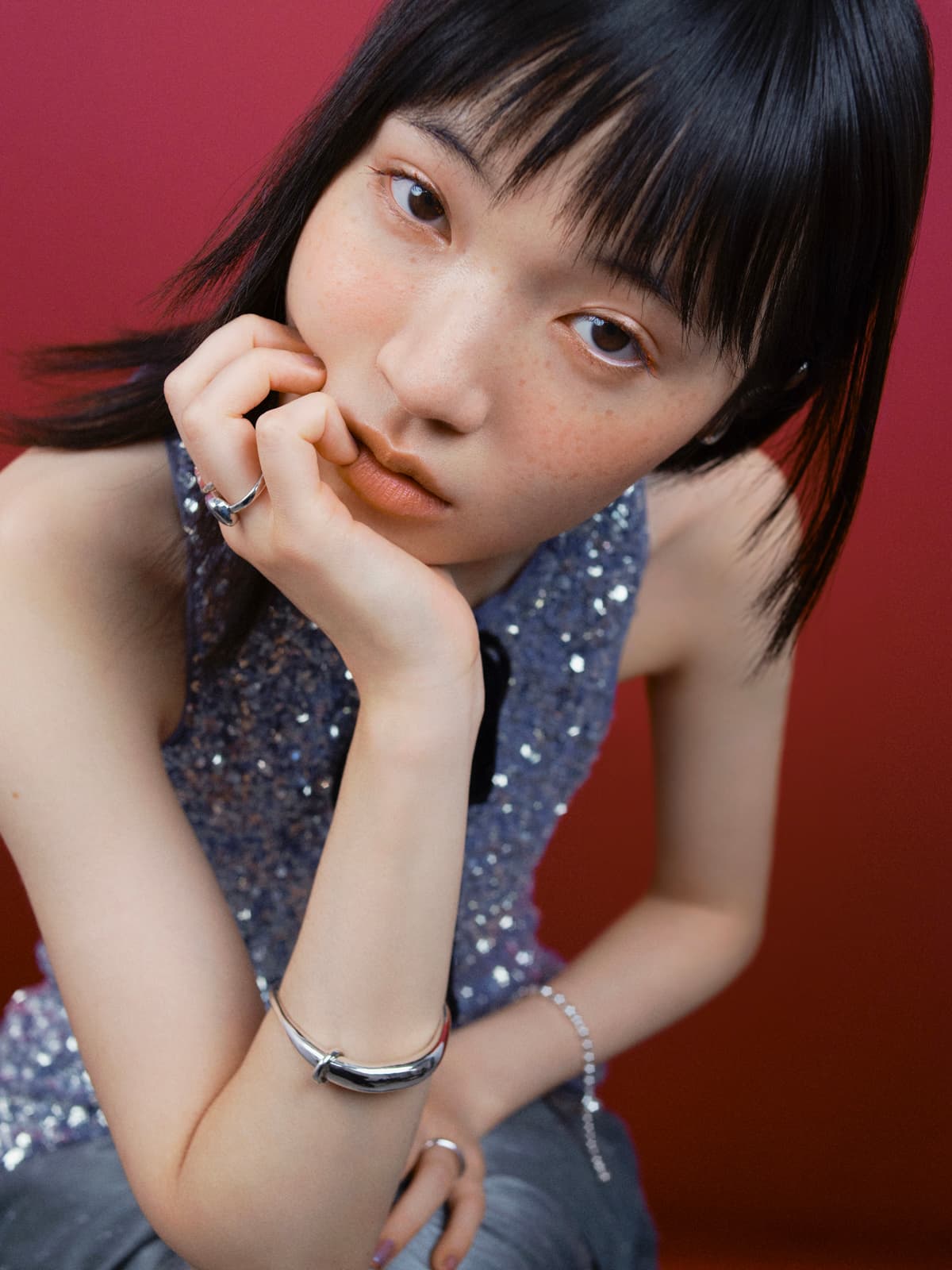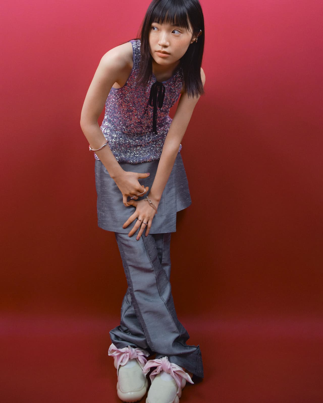 オレンジのチークとの最強コンビネーションはブルーのトップス。ヘルシーな肌見せスタイルは、視線を釘付けにするスパンコールの輝きでモードなバランスに。 ボトムスやシューズで遊び心もプラスして。